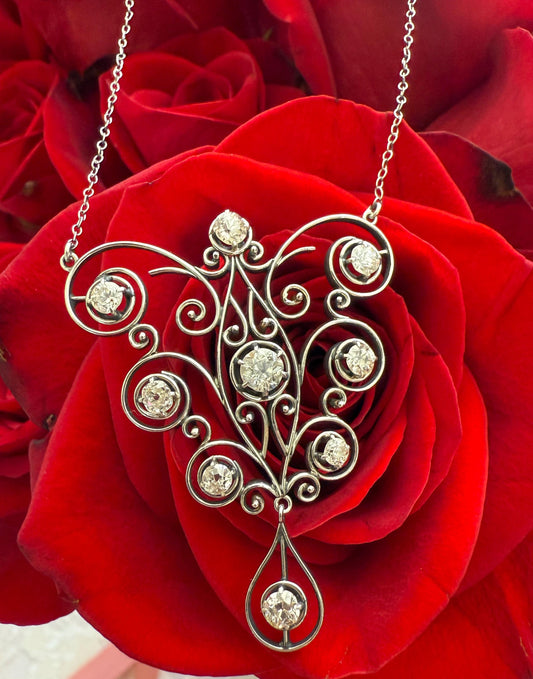 Edwardian Platinum Diamond Necklace | 2ct Old Mine & European Cuts | Antique Filigree Pendant