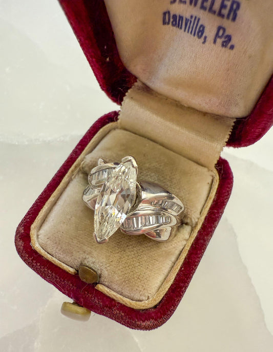 Unique Vintage Platinum Engagement Ring | Marquise Cut Diamond & Baguettes | GIA Certified
