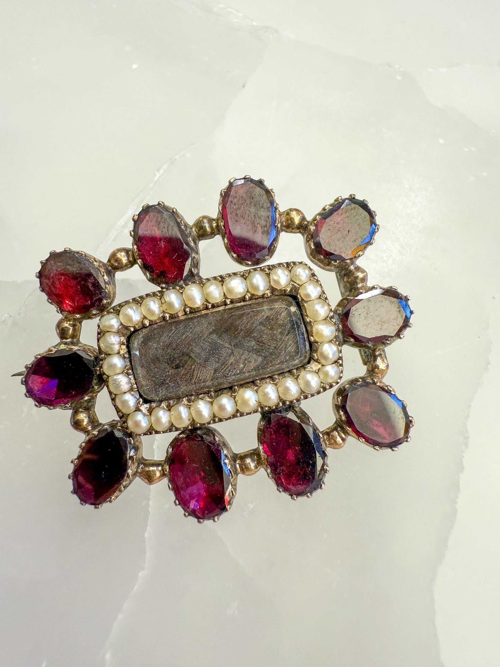 Antique Mourning Brooch with Plaited Hair, Seed Pearls & Flat Cut Garnets – 9K Gold