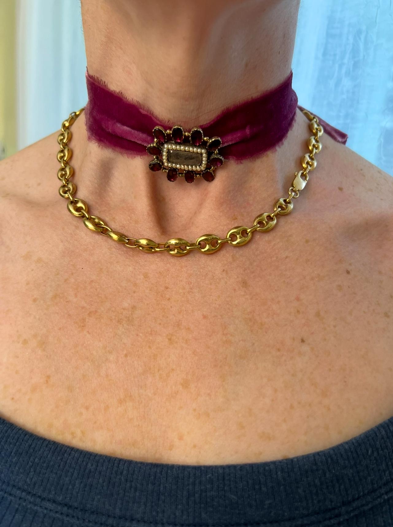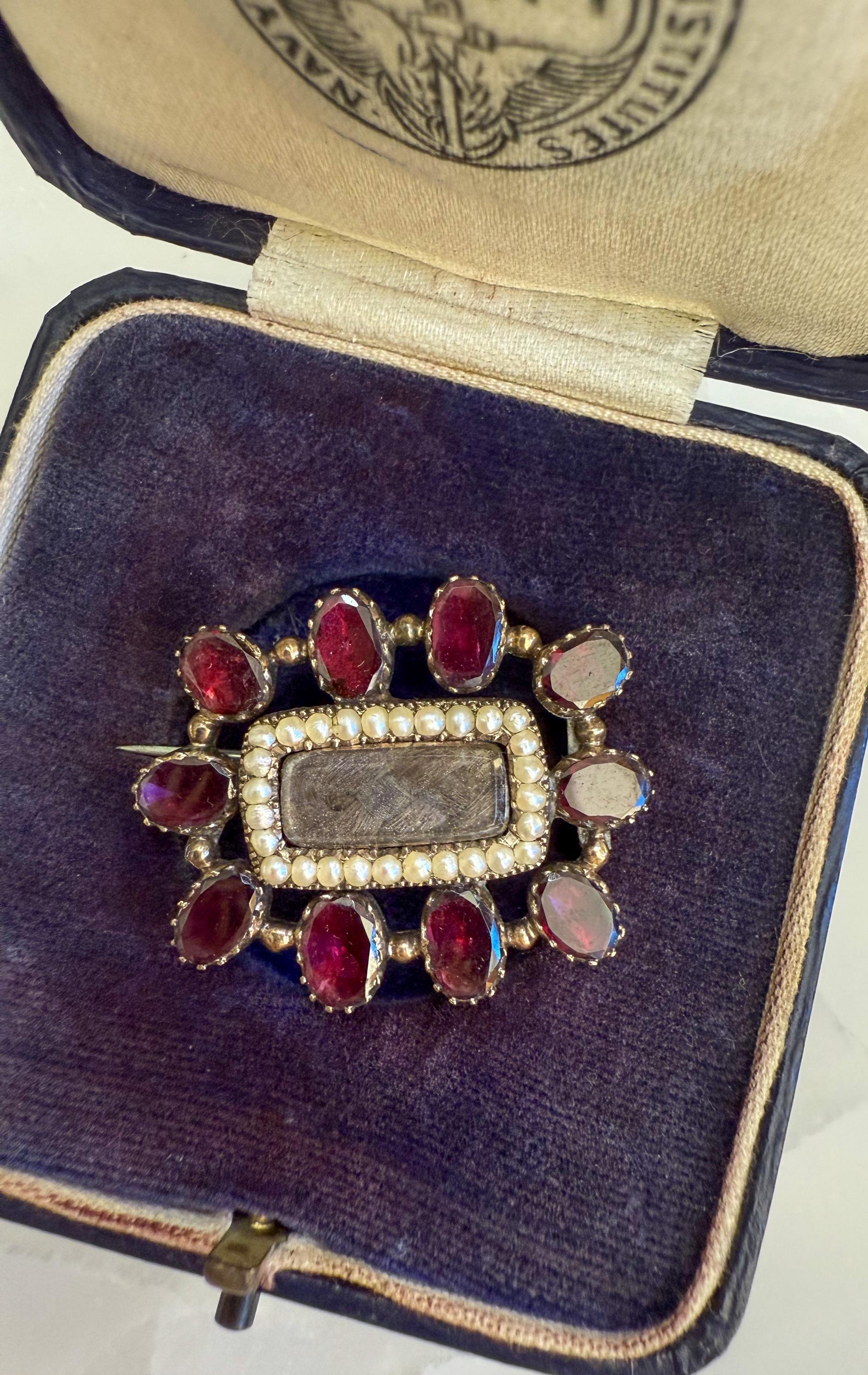 A moving piece of history, this antique mourning brooch beautifully captures the sentiment and craftsmanship of the 19th century. The center panel holds finely plaited hair, a traditional way to remember and honor a loved one. Surrounding it is a delicate halo of seed pearls, symbolizing purity, and a striking border of rich, flat cut garnets that glow with deep red warmth.