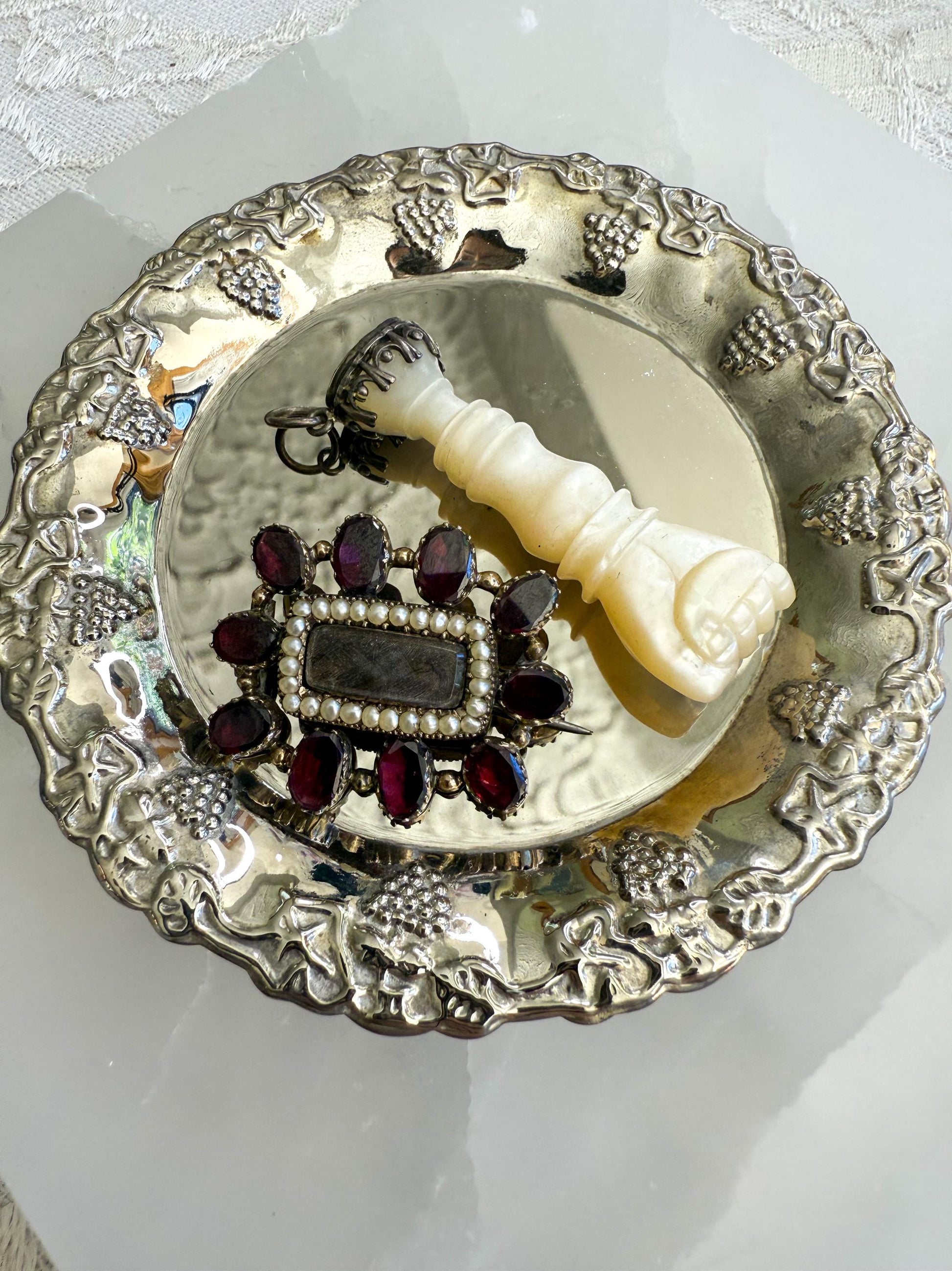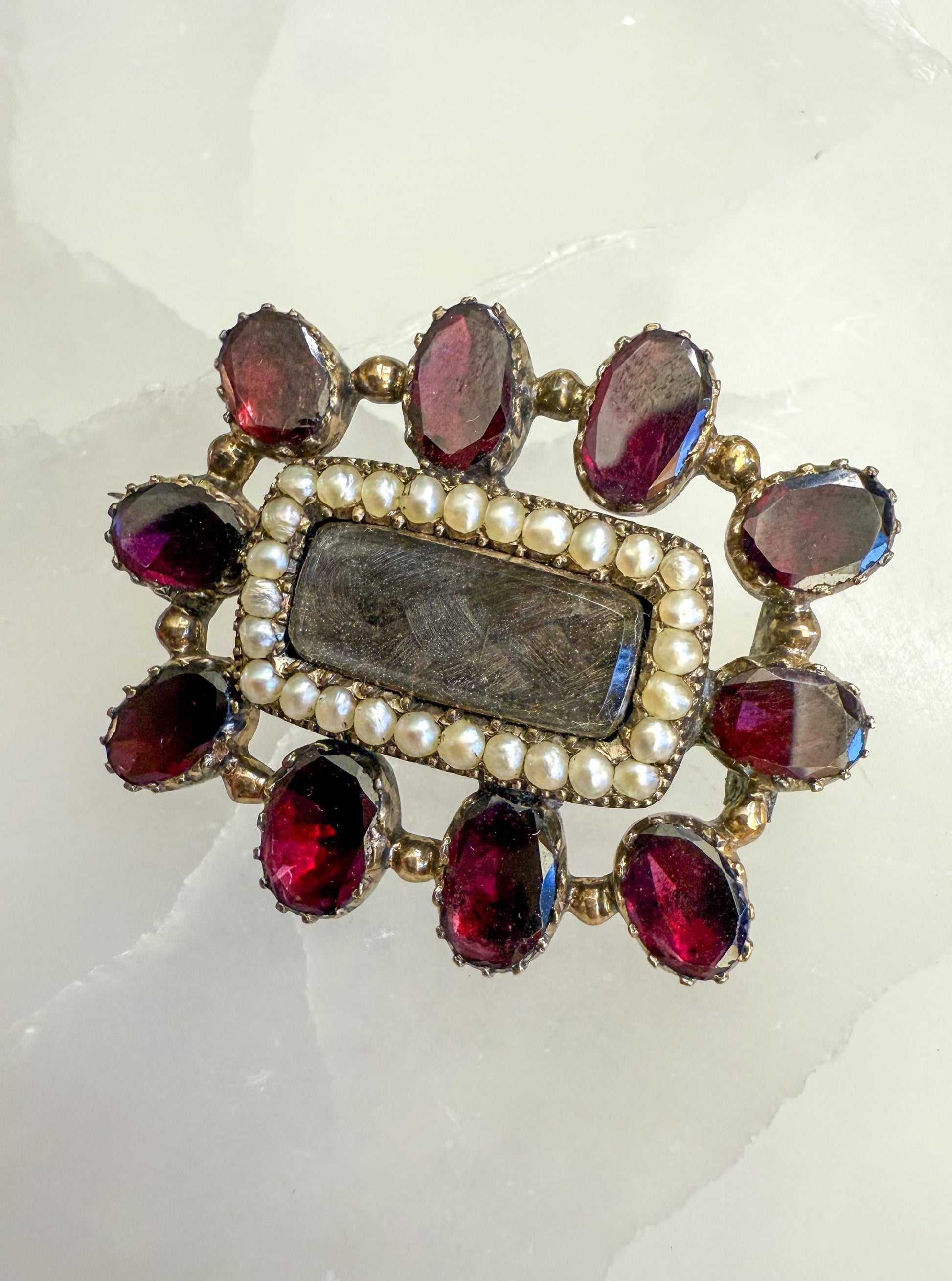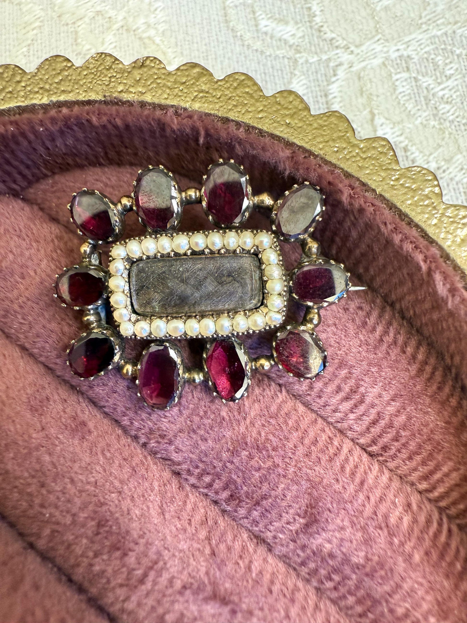 Antique Mourning Brooch with Plaited Hair, Seed Pearls & Flat Cut Garnets