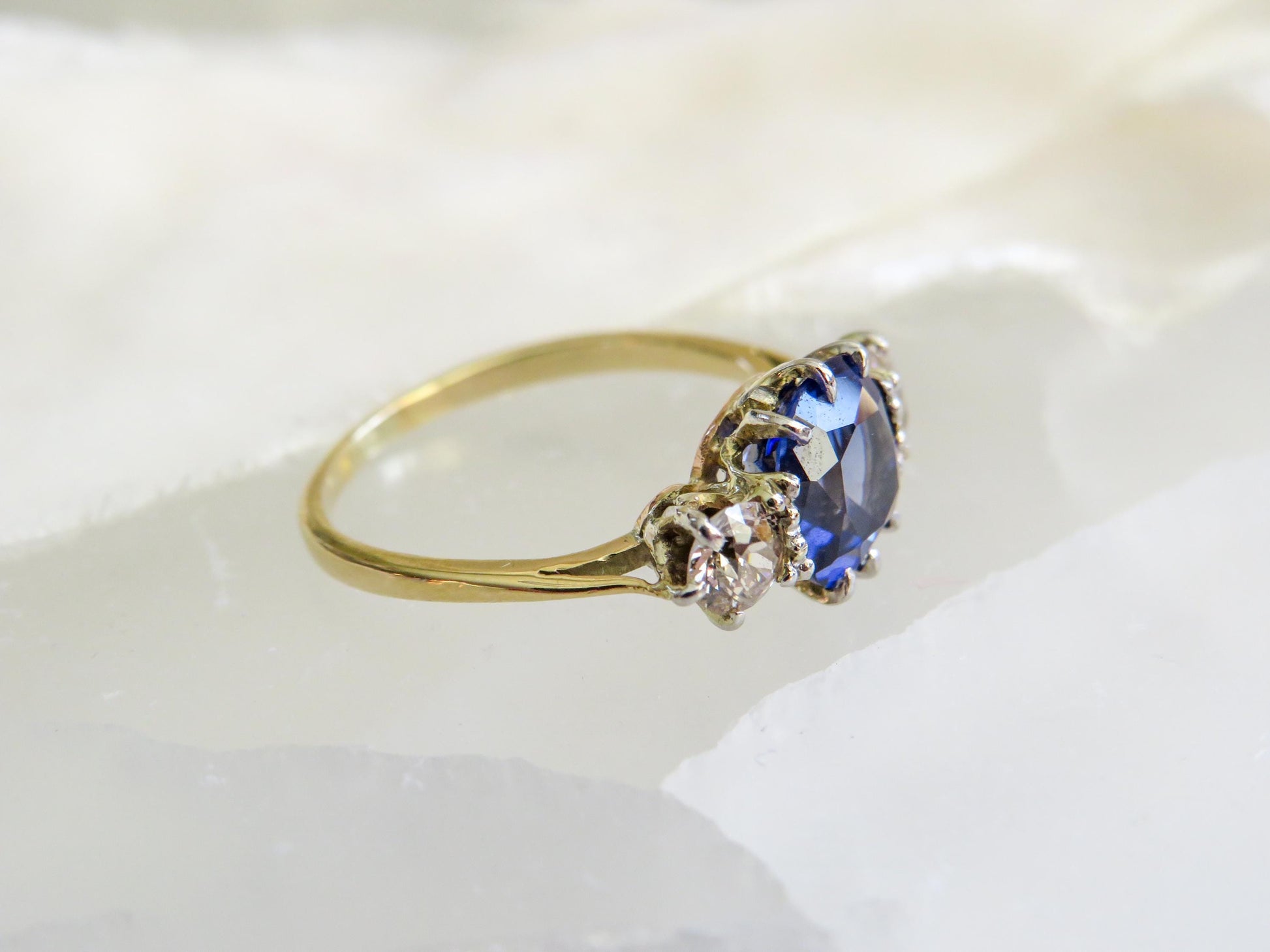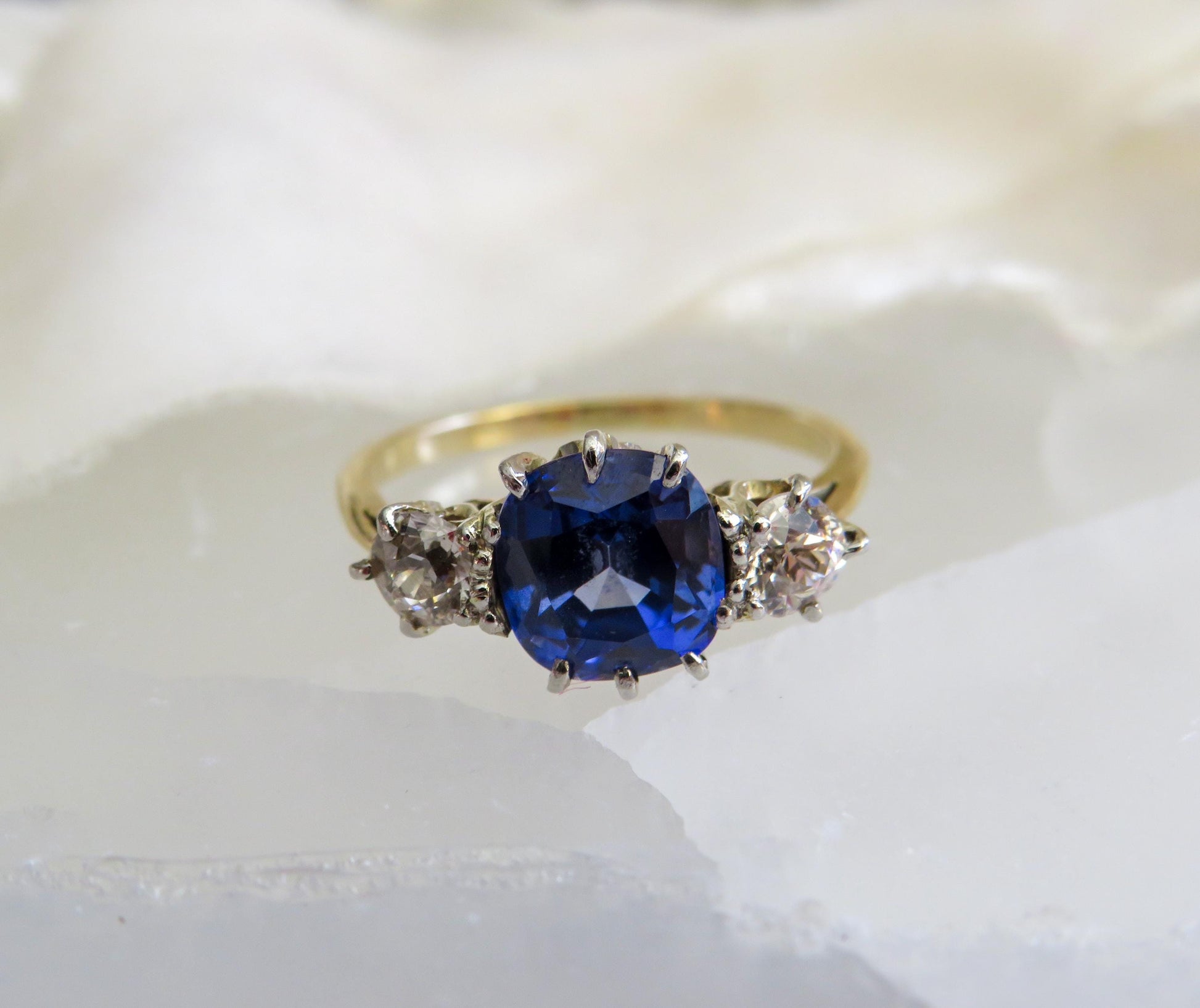 A striking example of Art Deco design, this sapphire and diamond ring balances bold geometry with refined sparkle. The vivid blue sapphire takes center stage, flanked by two old European cut diamonds that add just the right amount of fire and contrast.