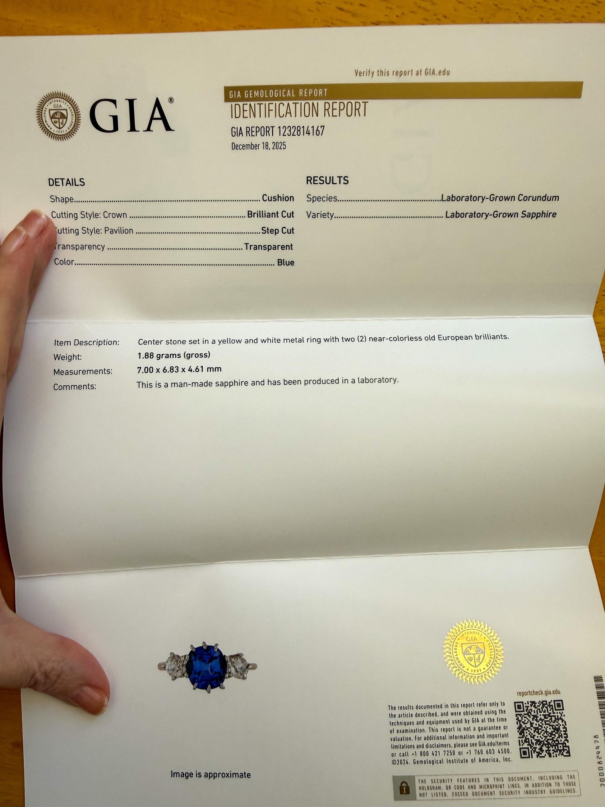 • Center Stone: GIA certified lab-created sapphire