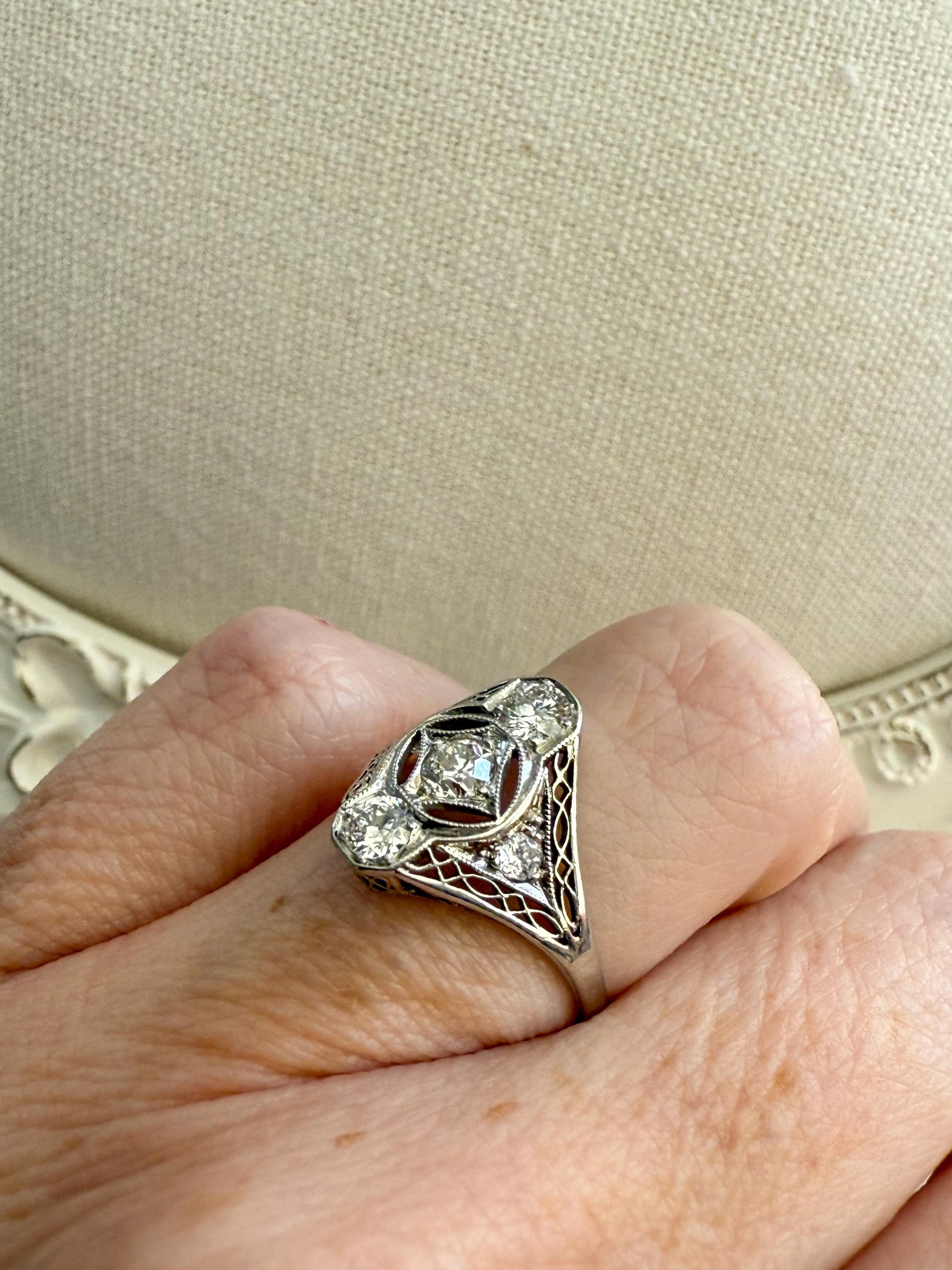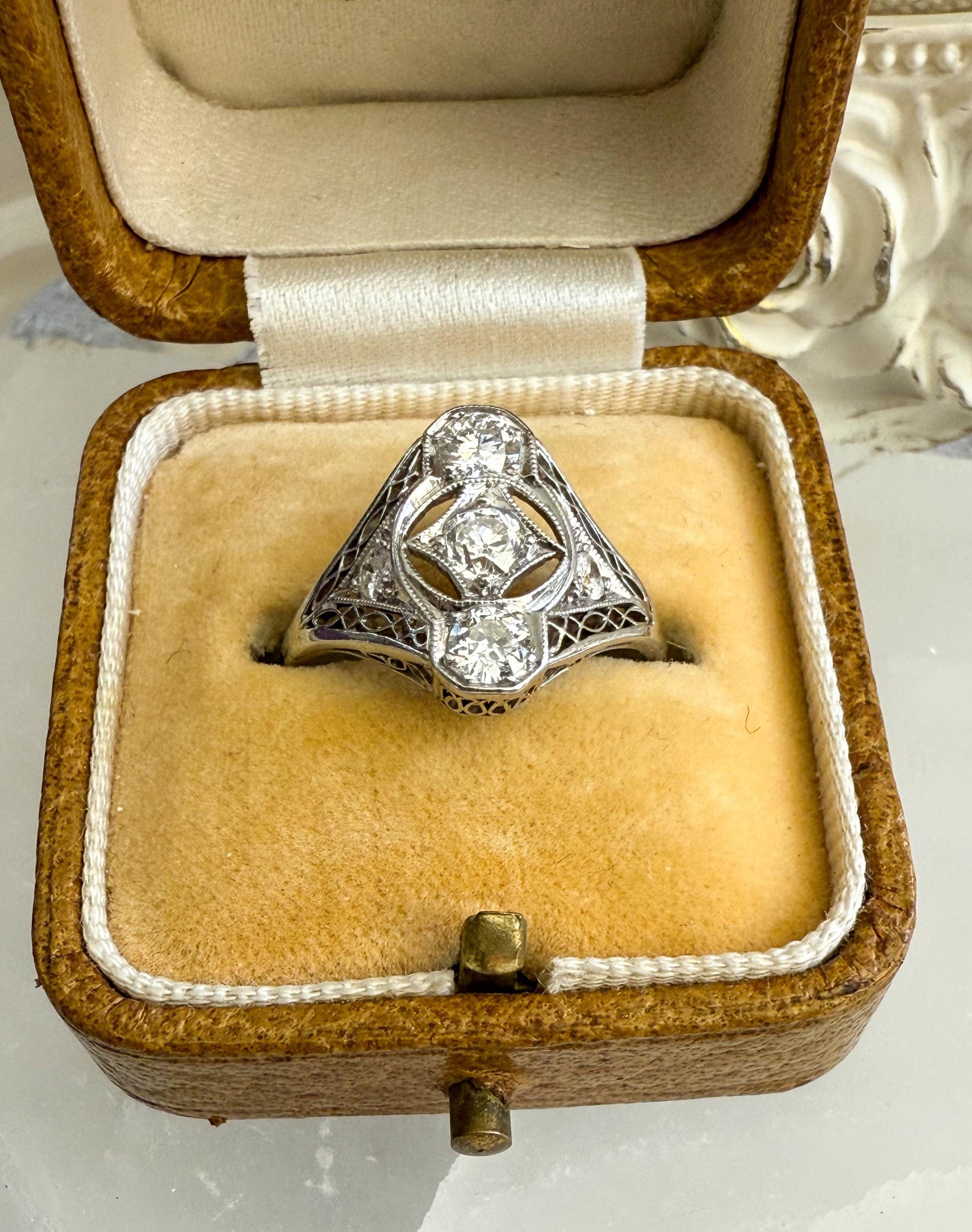 Platinum Art Deco Filigree Ring with Old European Cut Diamonds | Size 5.75 | Vintage Platinum Diamond Ring