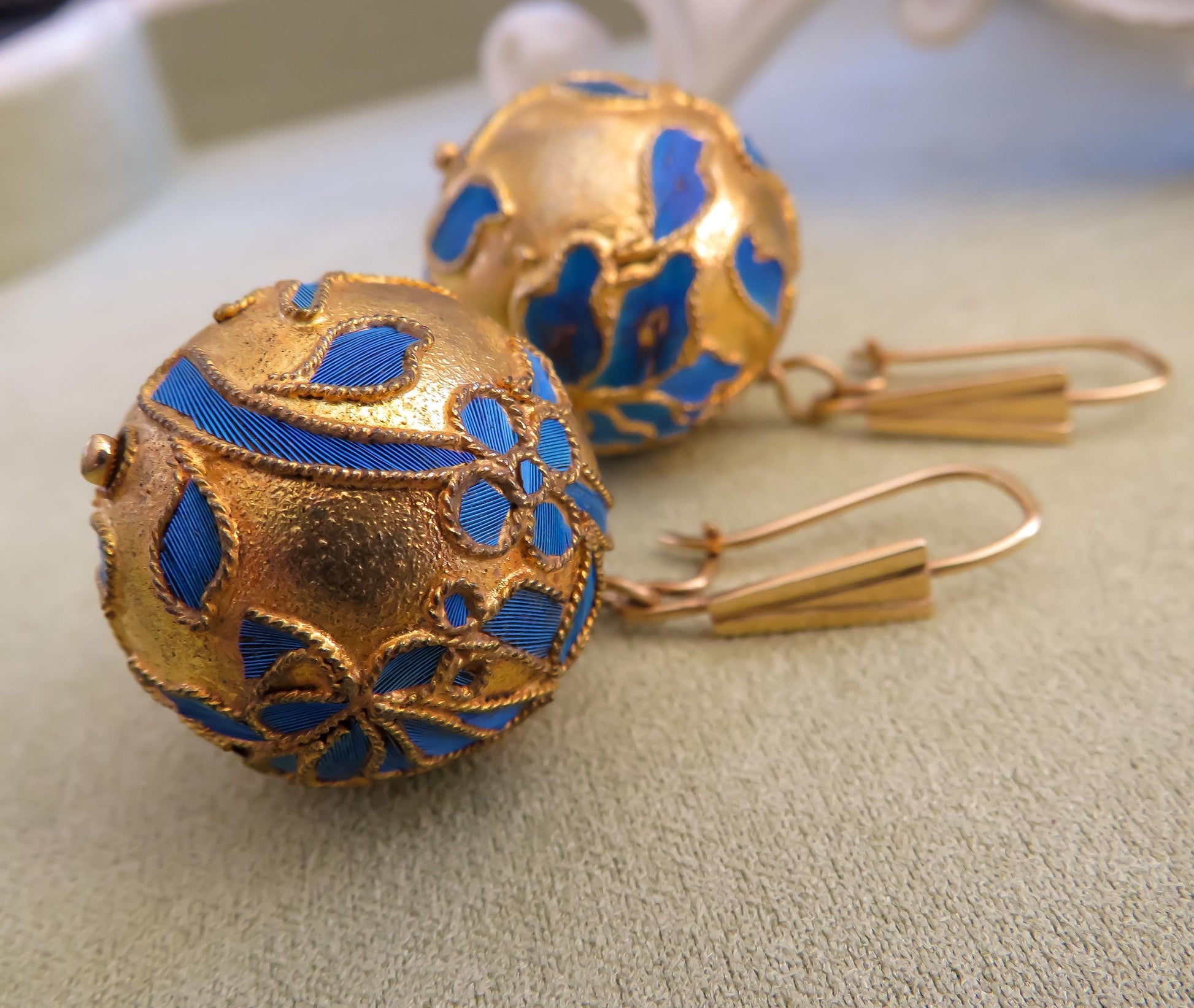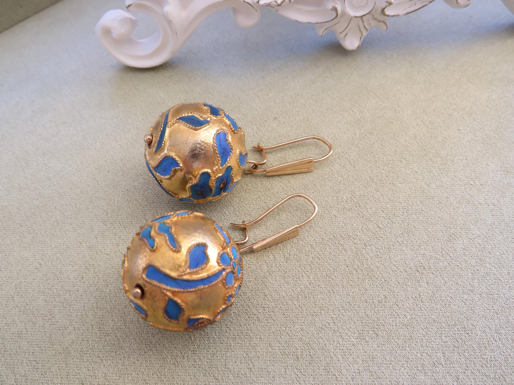 These striking vintage drop earrings feature richly colored kingfisher feathers set into gilt, spherical ball drops, suspended from solid 14K gold ear wires. Bold yet elegant, they have an unmistakable old-world charm and a glow that’s impossible to replicate with modern materials.