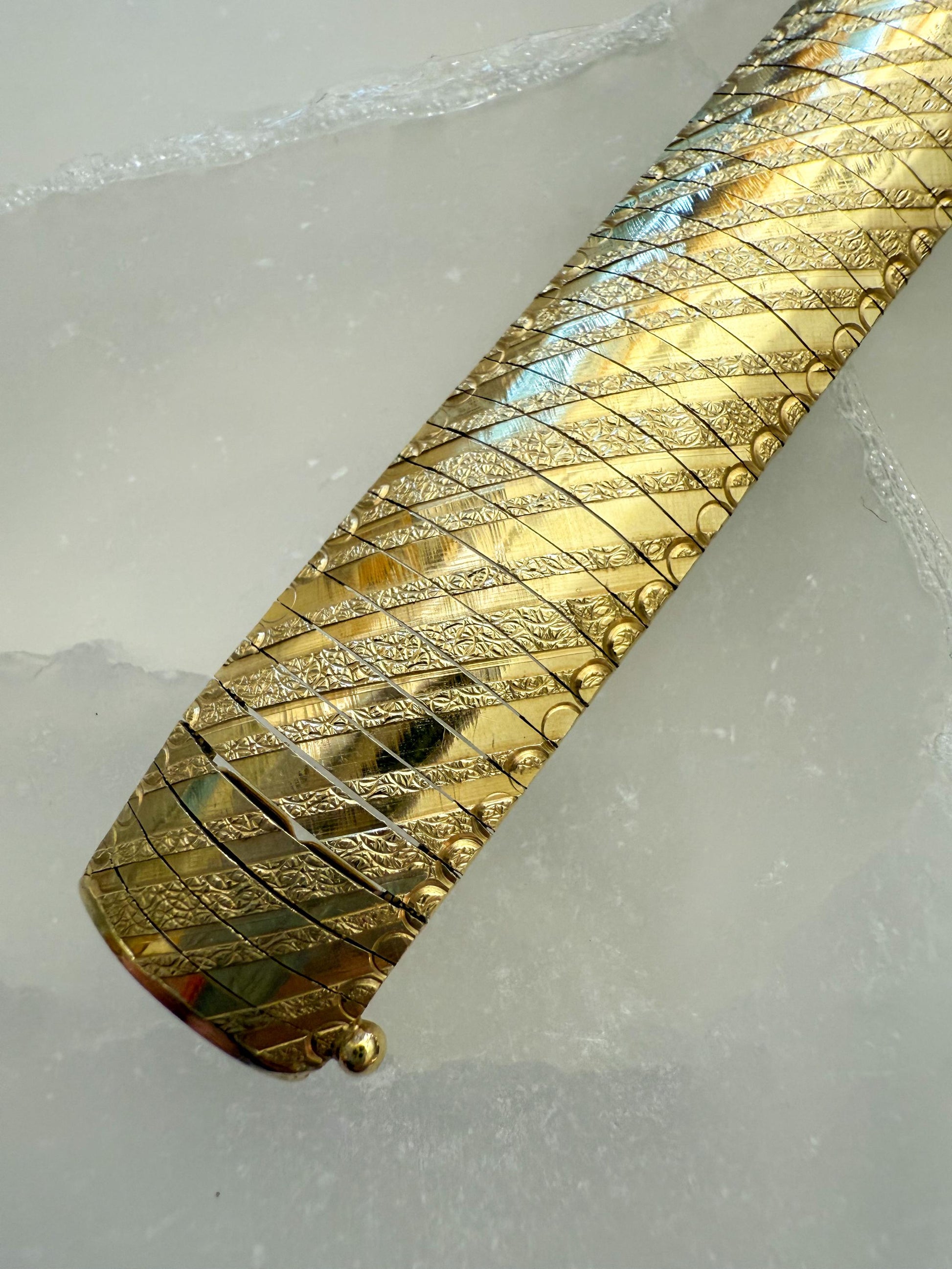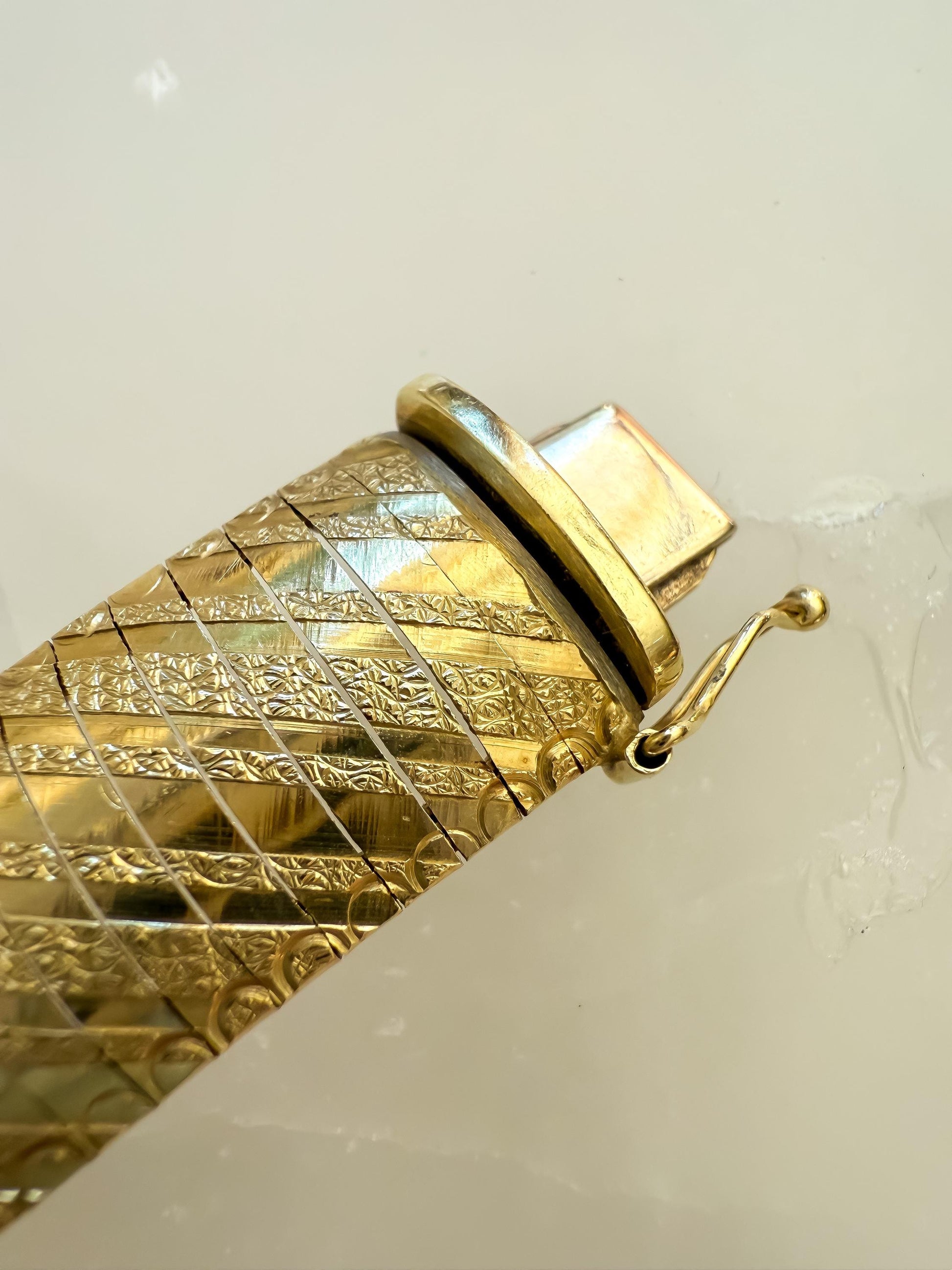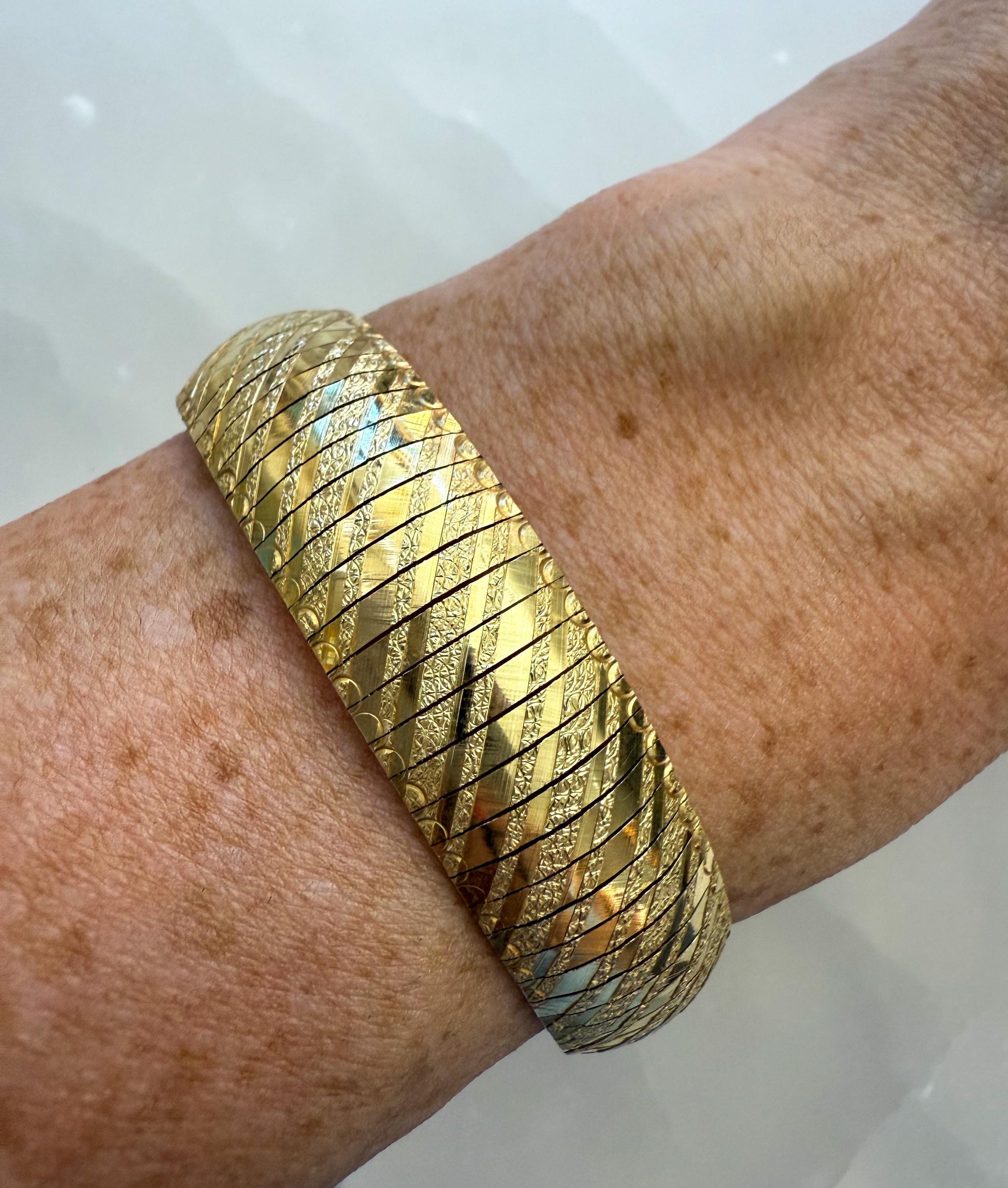 This bold and beautifully detailed vintage estate bracelet is crafted in rich 14K yellow gold and features an elegant, high-polish diamond-cut pattern that catches the light with every movement.