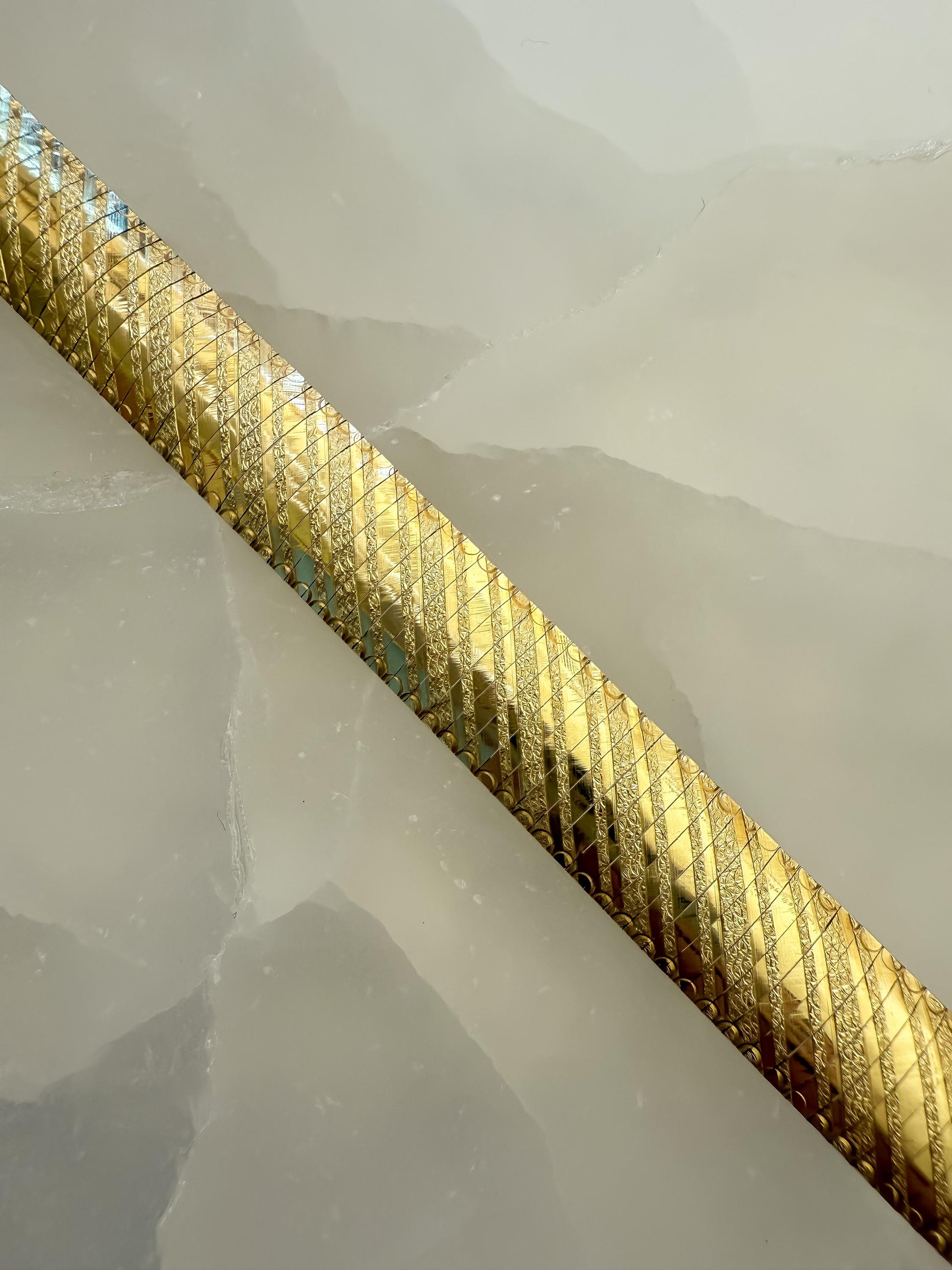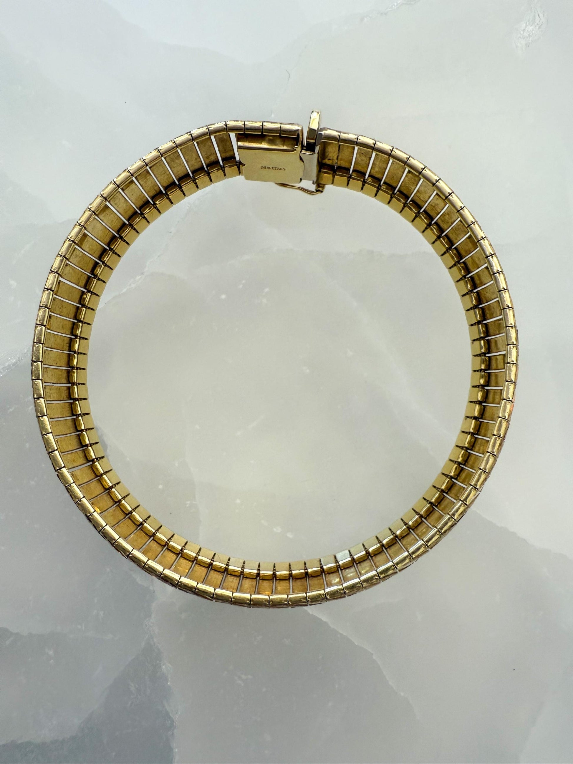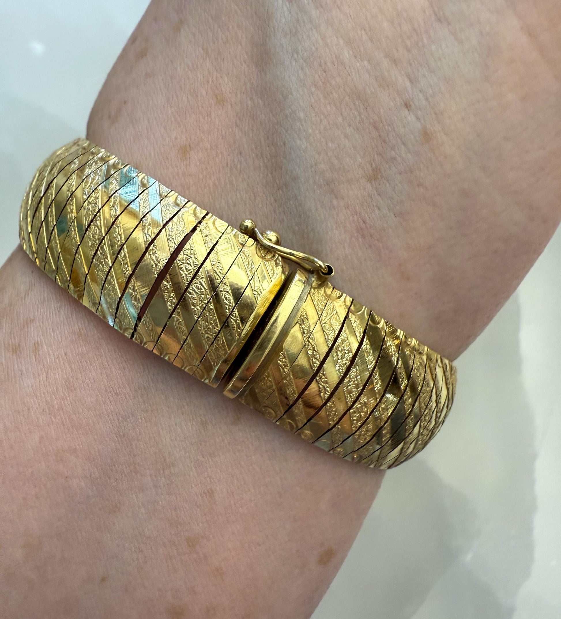 This bold and beautifully detailed vintage estate bracelet is crafted in rich 14K yellow gold and features an elegant, high-polish diamond-cut pattern that catches the light with every movement.