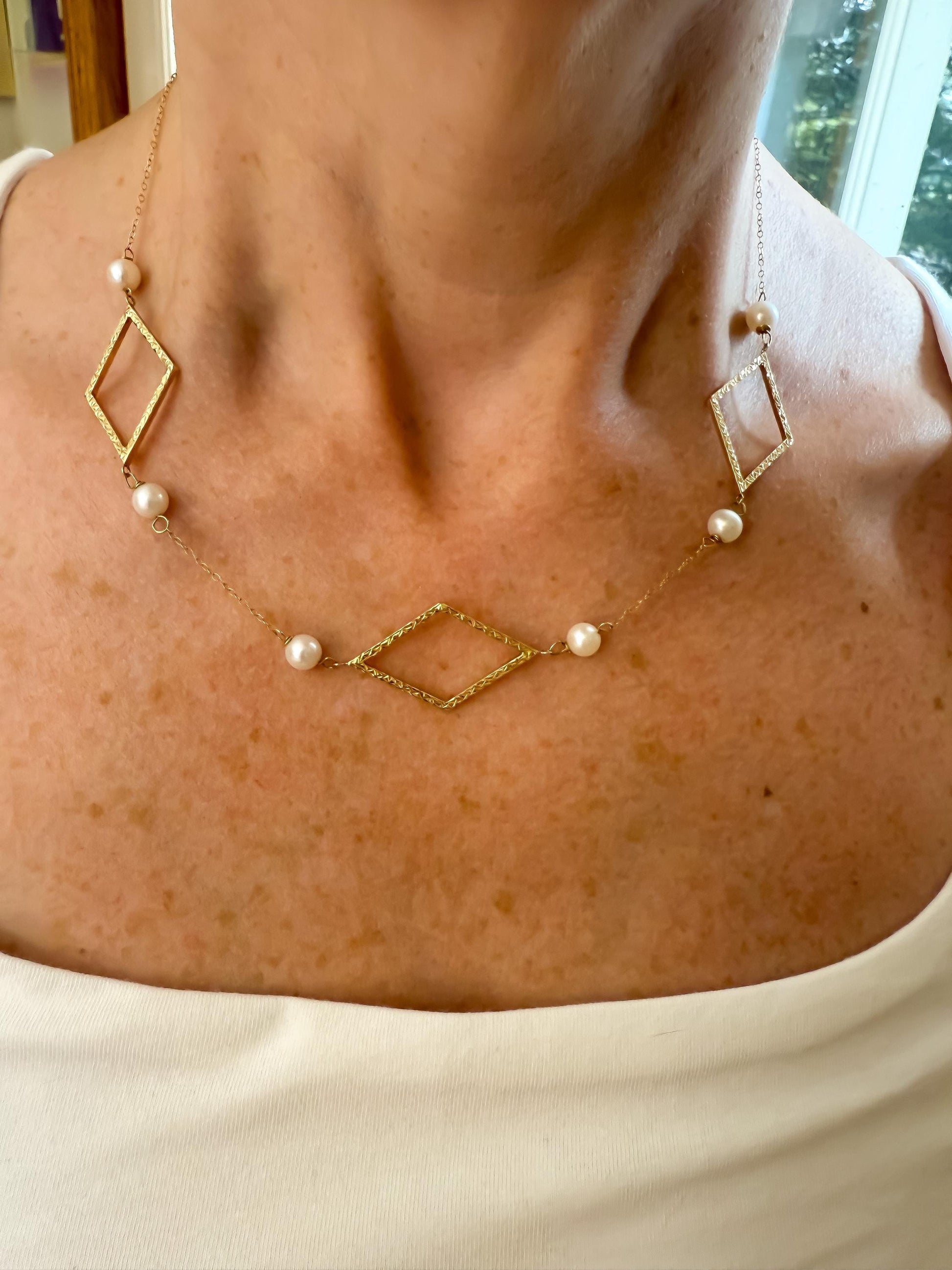 14K Gold Necklace with Glass Pearls & Diamond-Shaped Filigree Links | 17” Delicate Chain | Vintage-Inspired Layering Necklace