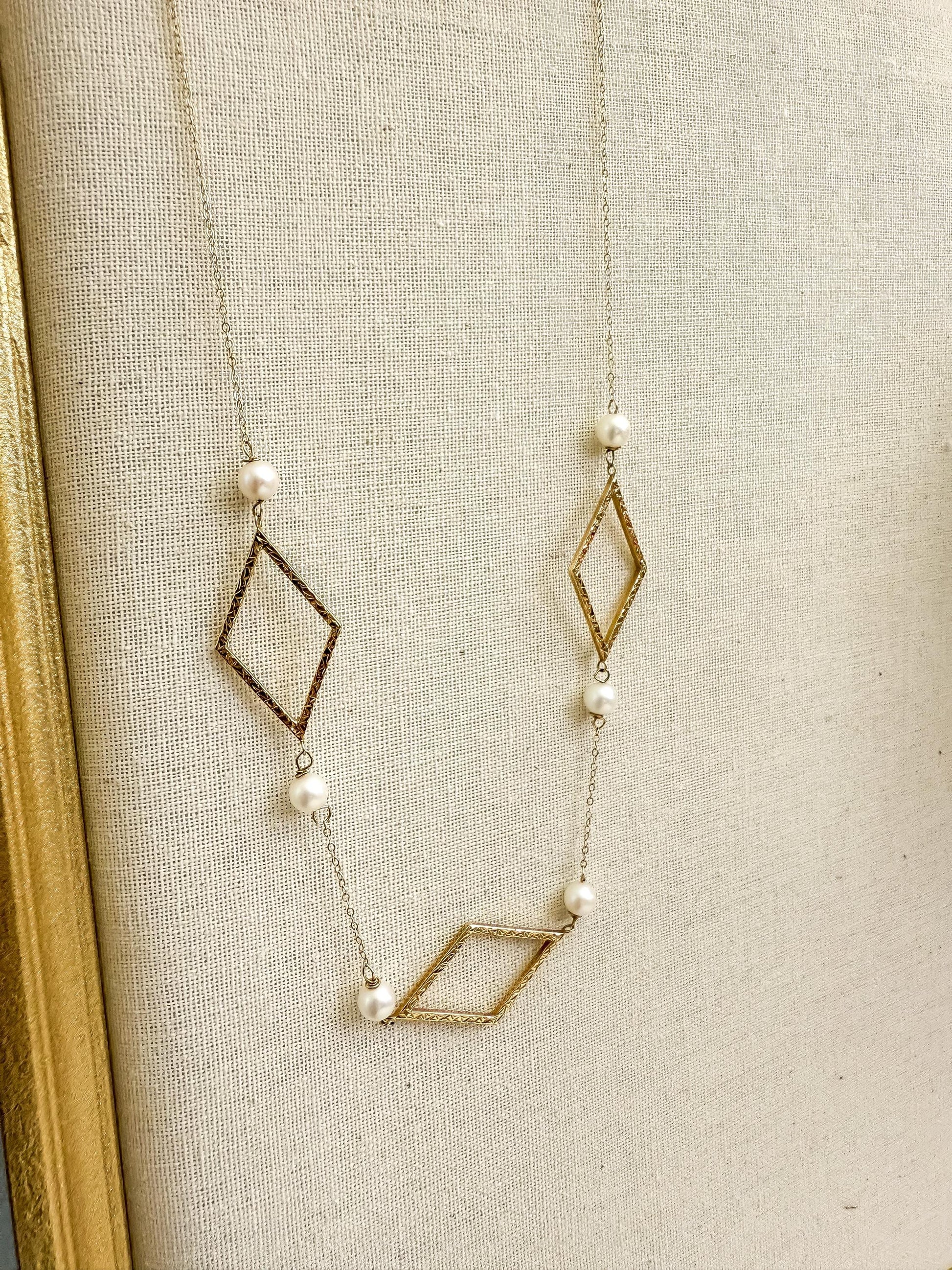 This delicate 14K gold necklace is an elegant nod to vintage design, featuring openwork diamond-shaped filigree links paired with luminous glass pearls. At 17 inches in length, it’s a perfect piece to wear on its own or layered with your favorite chains for a more curated look.