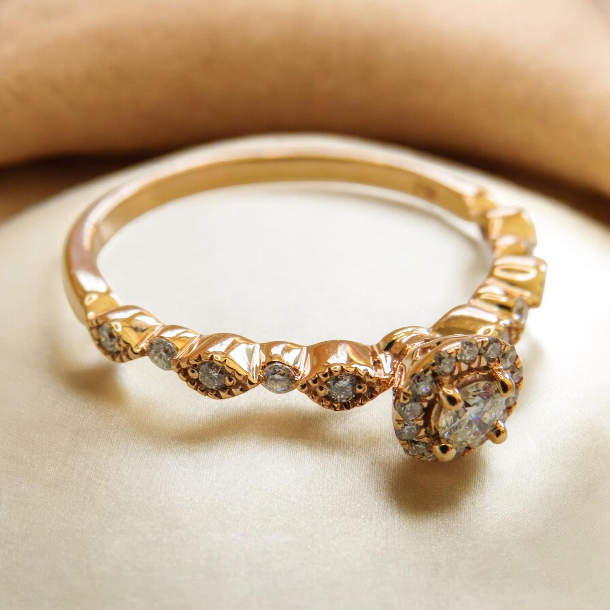 At its heart glows a brilliant 0.10-carat diamond, cradled in a graceful halo of sparkling accent diamonds. The band features an enchanting, vintage-inspired design, with gentle, organic ripples set with additional diamonds that shimmer with every movement.