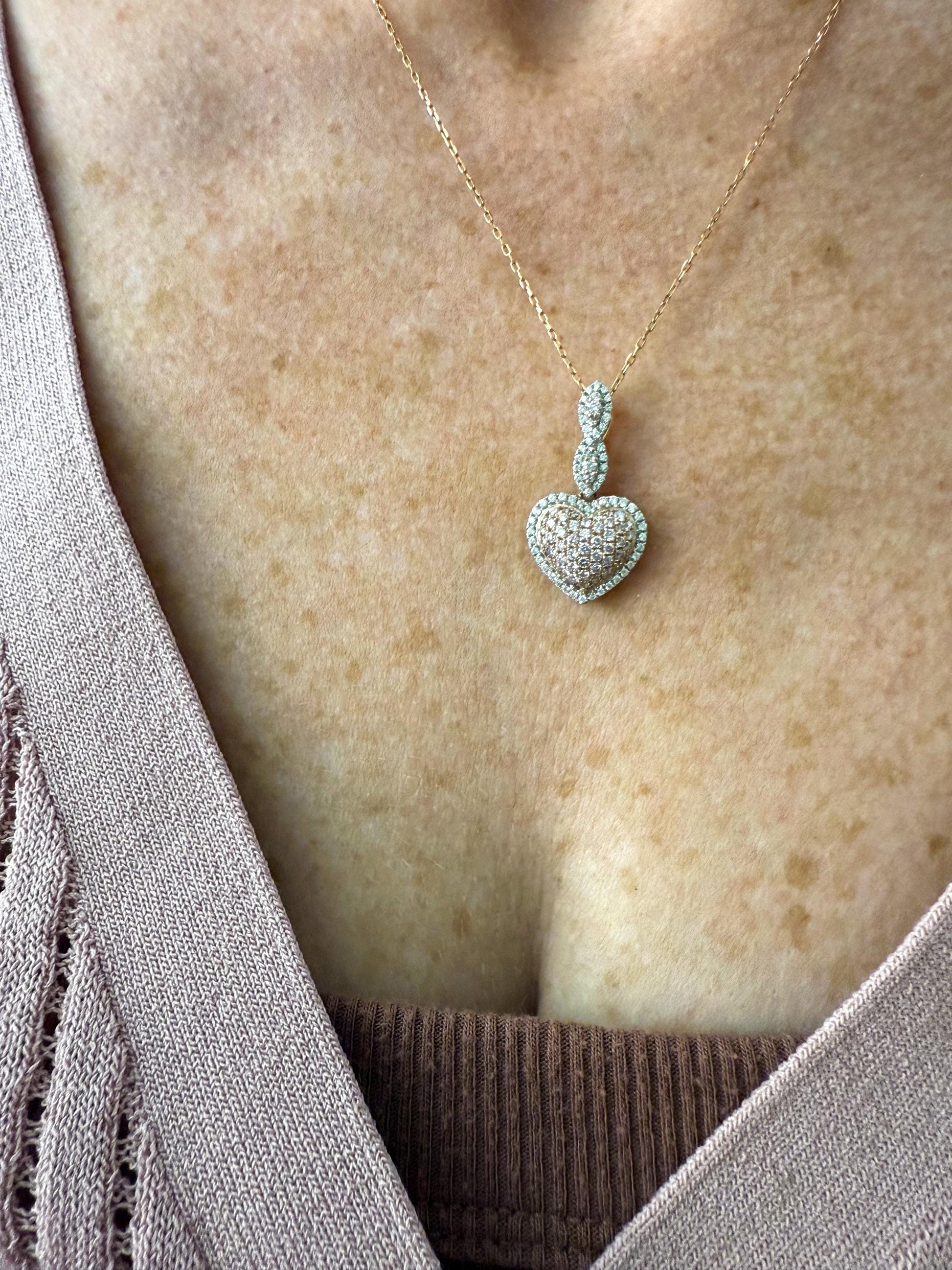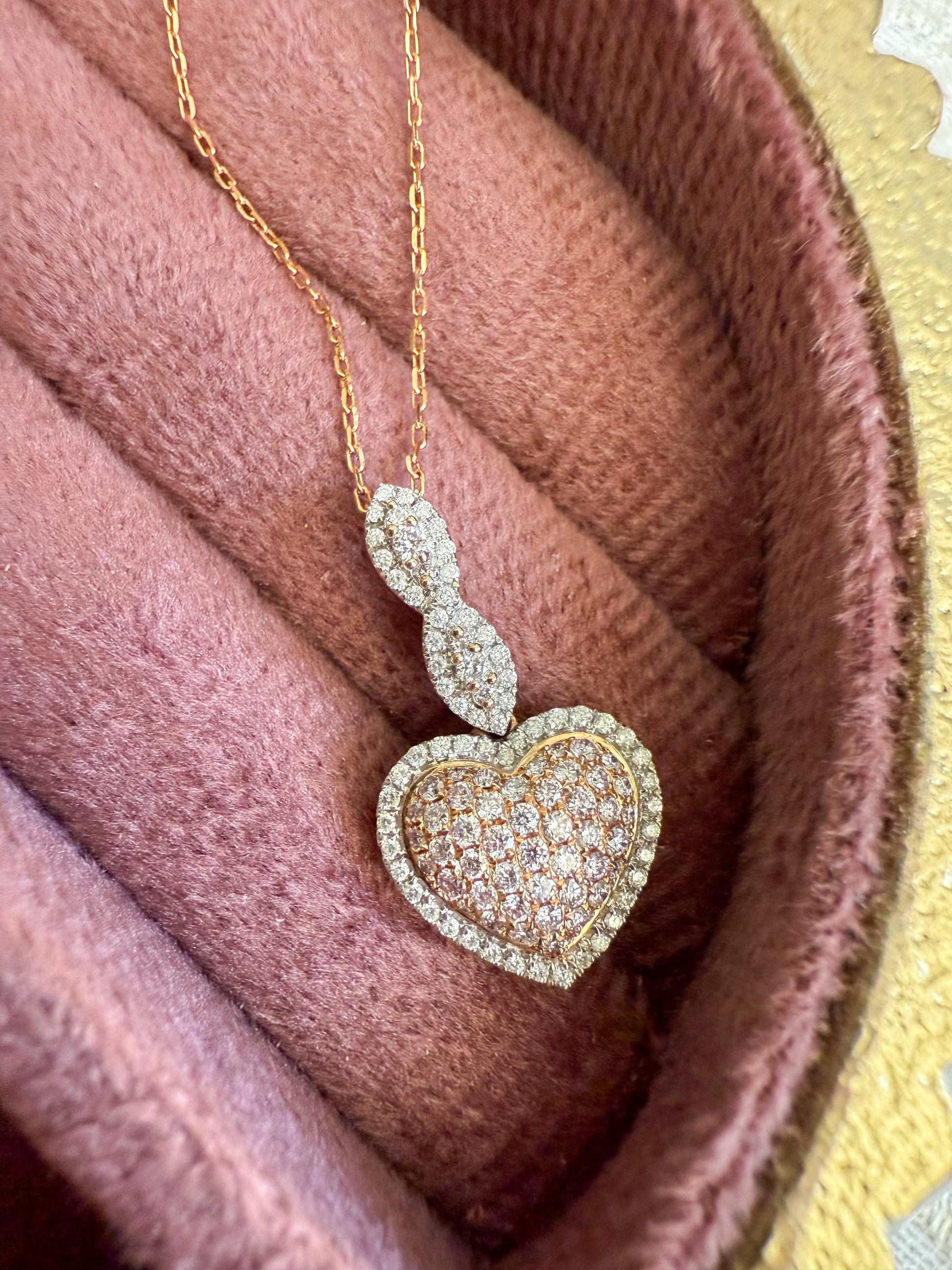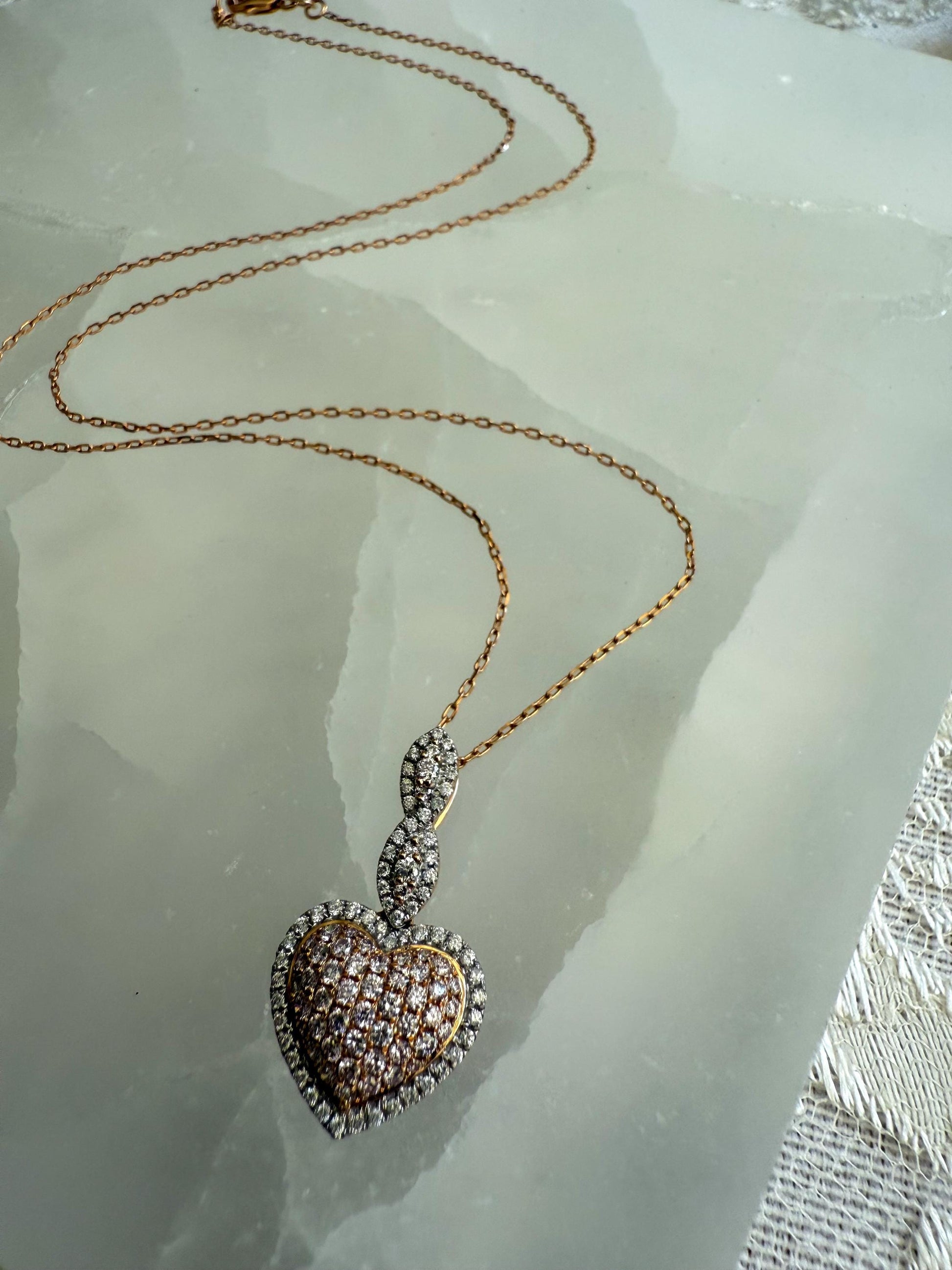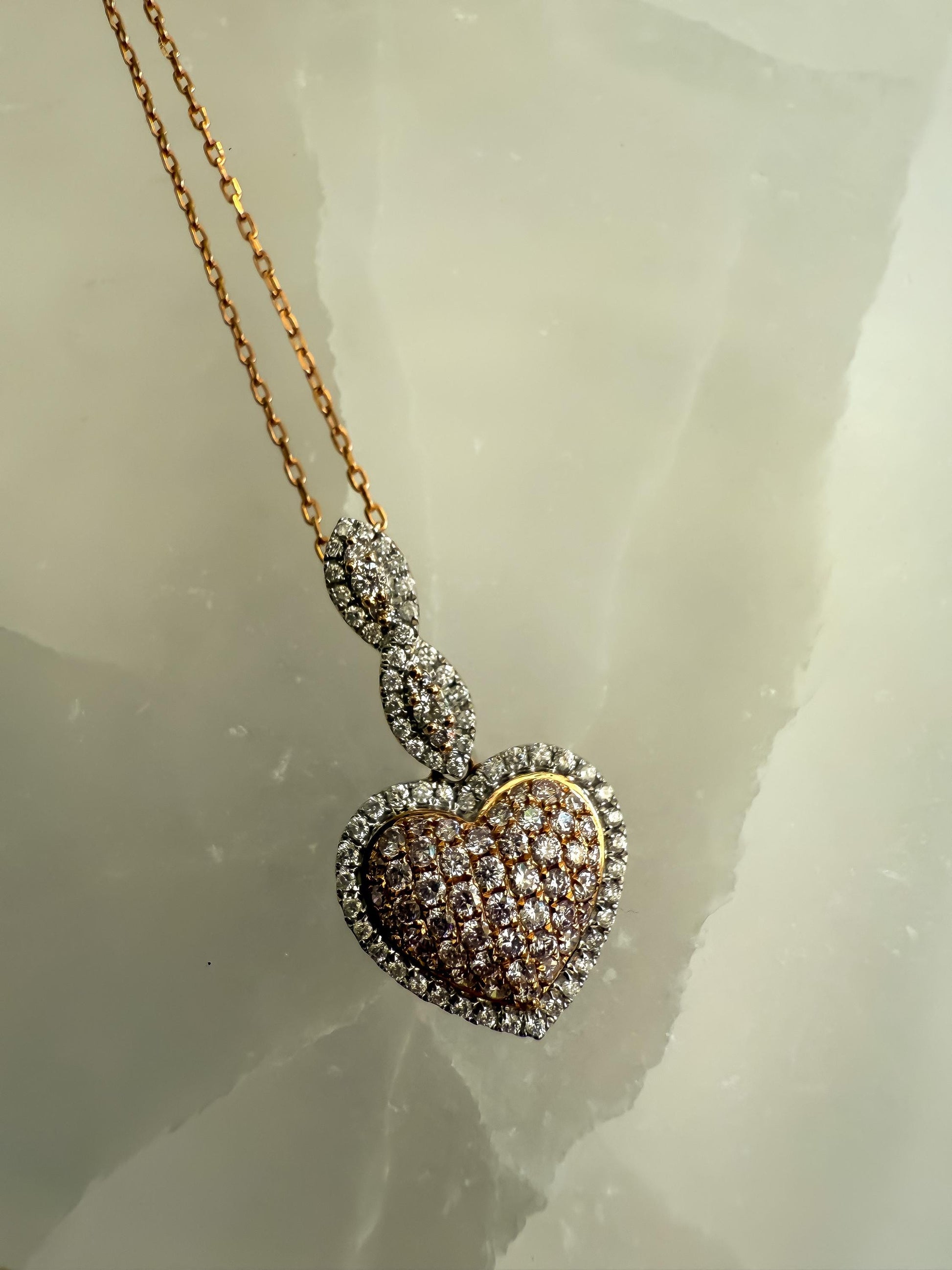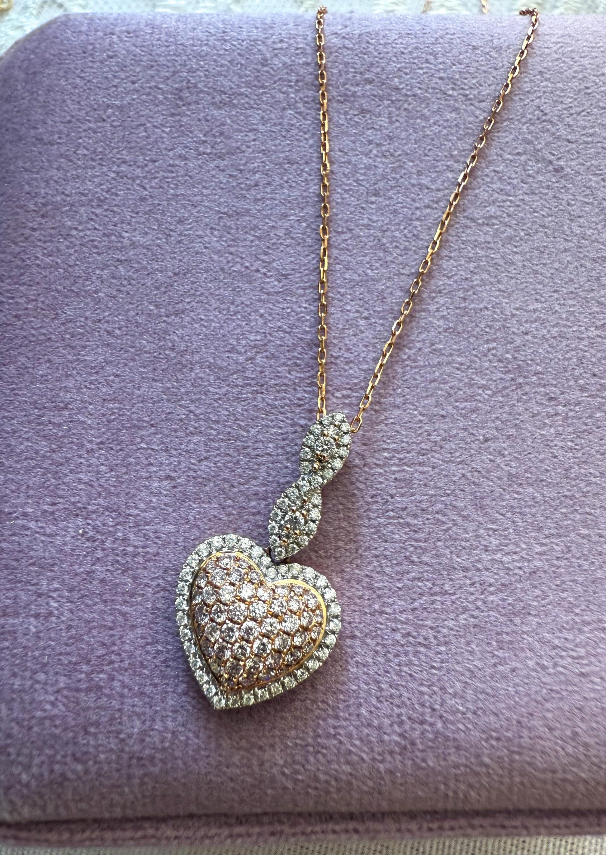 Romantic and luxurious, this 14K rose gold necklace features a dazzling heart-shaped pendant set with a mix of natural pink and white diamonds. The warm blush tones of rose gold beautifully complement the sparkle of the diamonds, making this piece both elegant and unique.