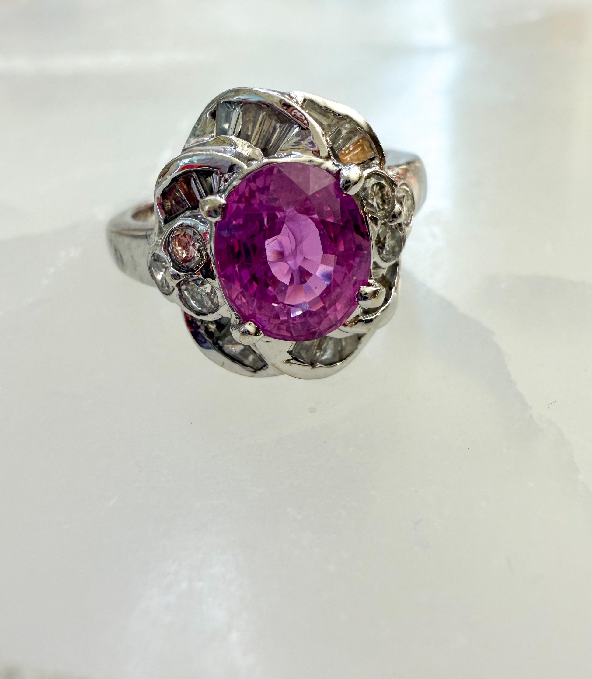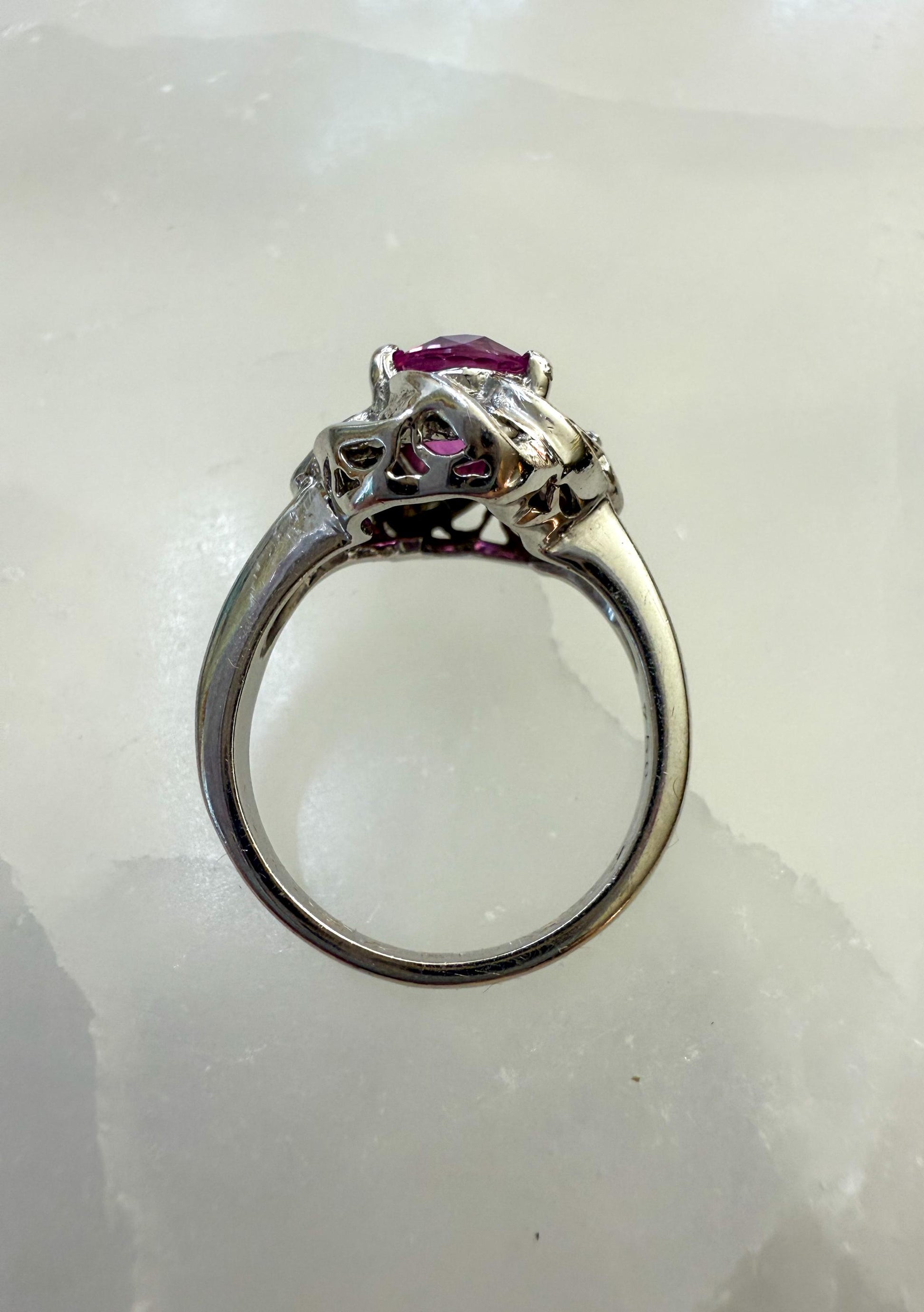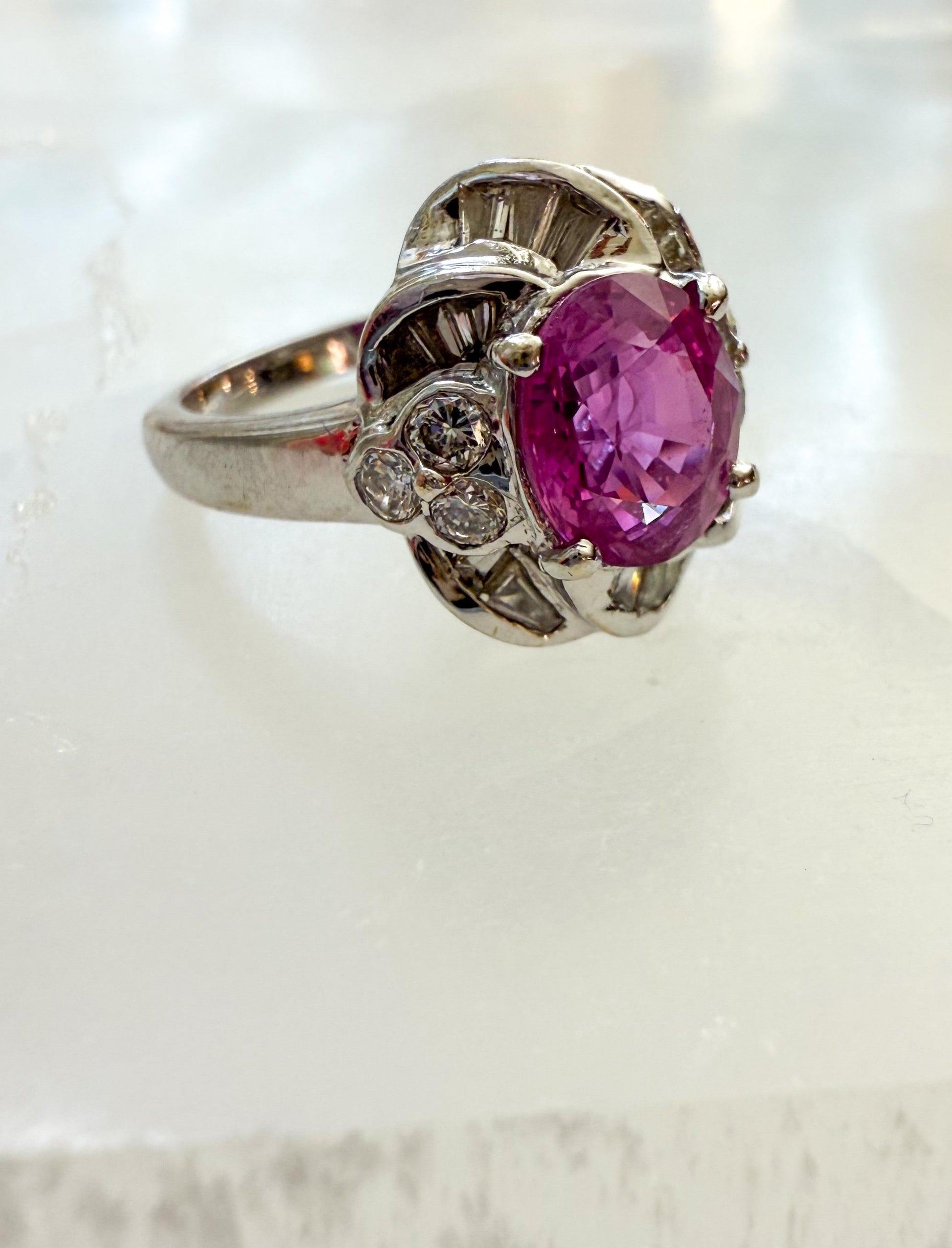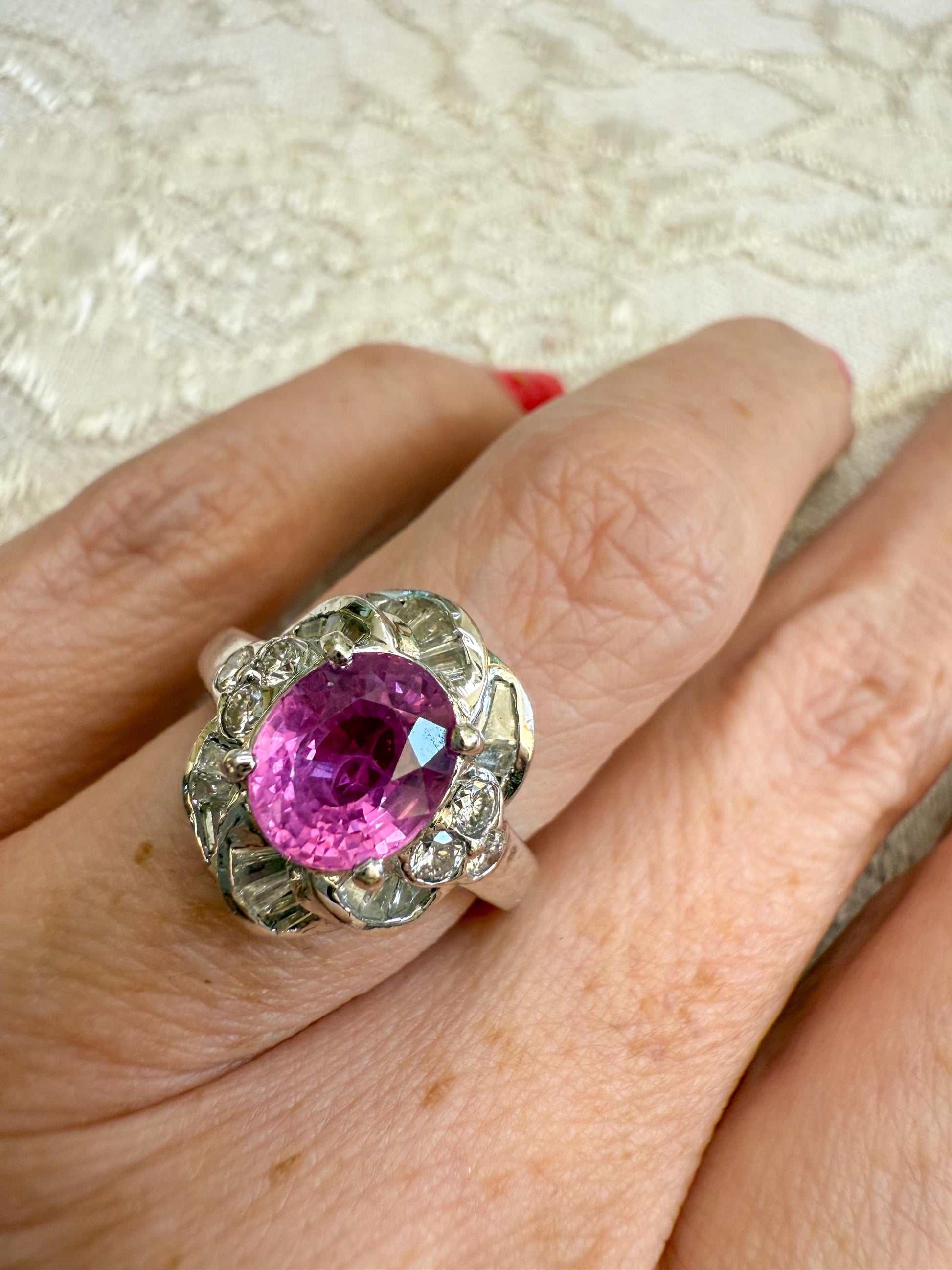This vintage 18K white gold ring is a true showstopper, featuring a vivid pink sapphire surrounded by a sculptural setting of brilliant diamonds.