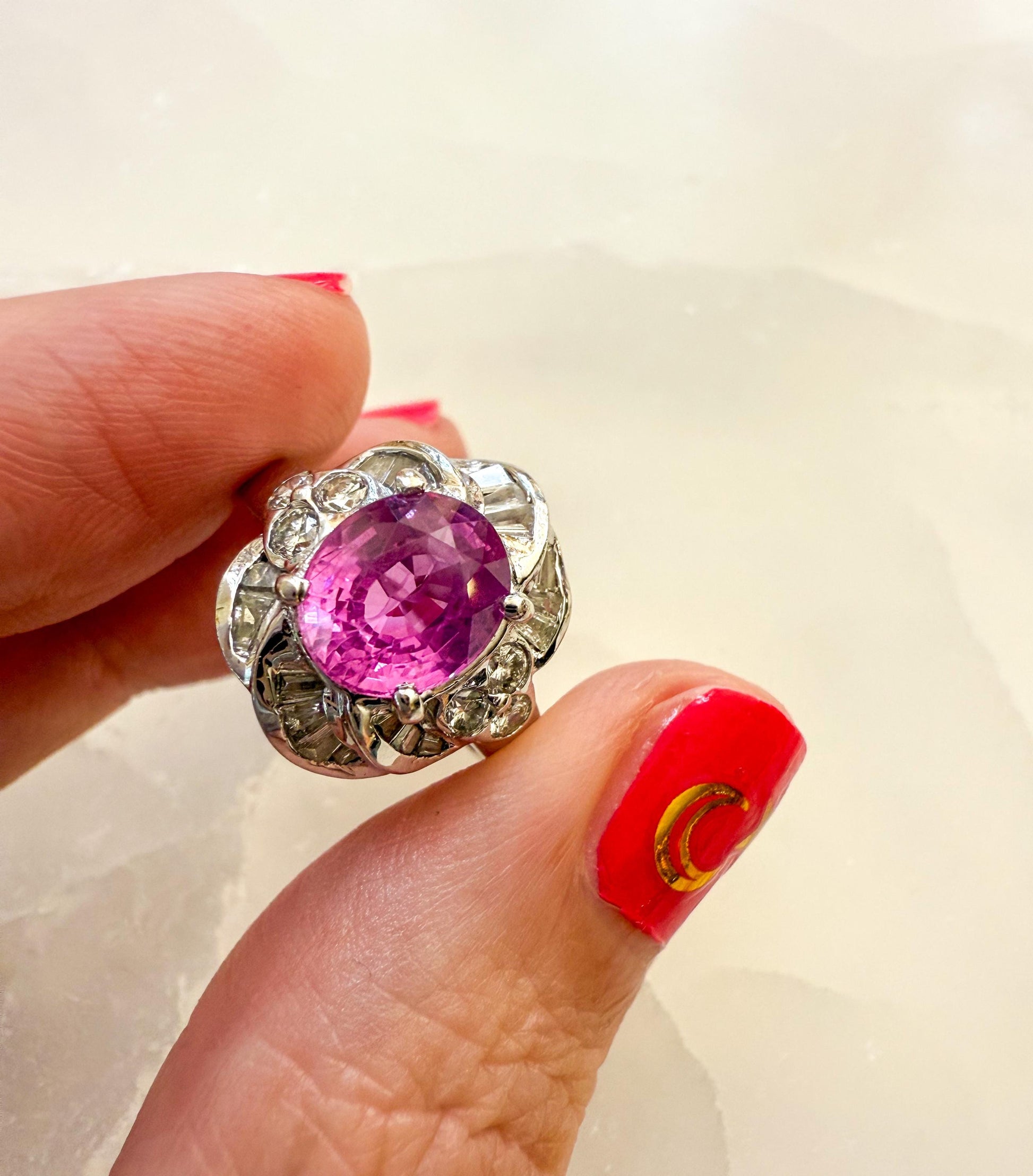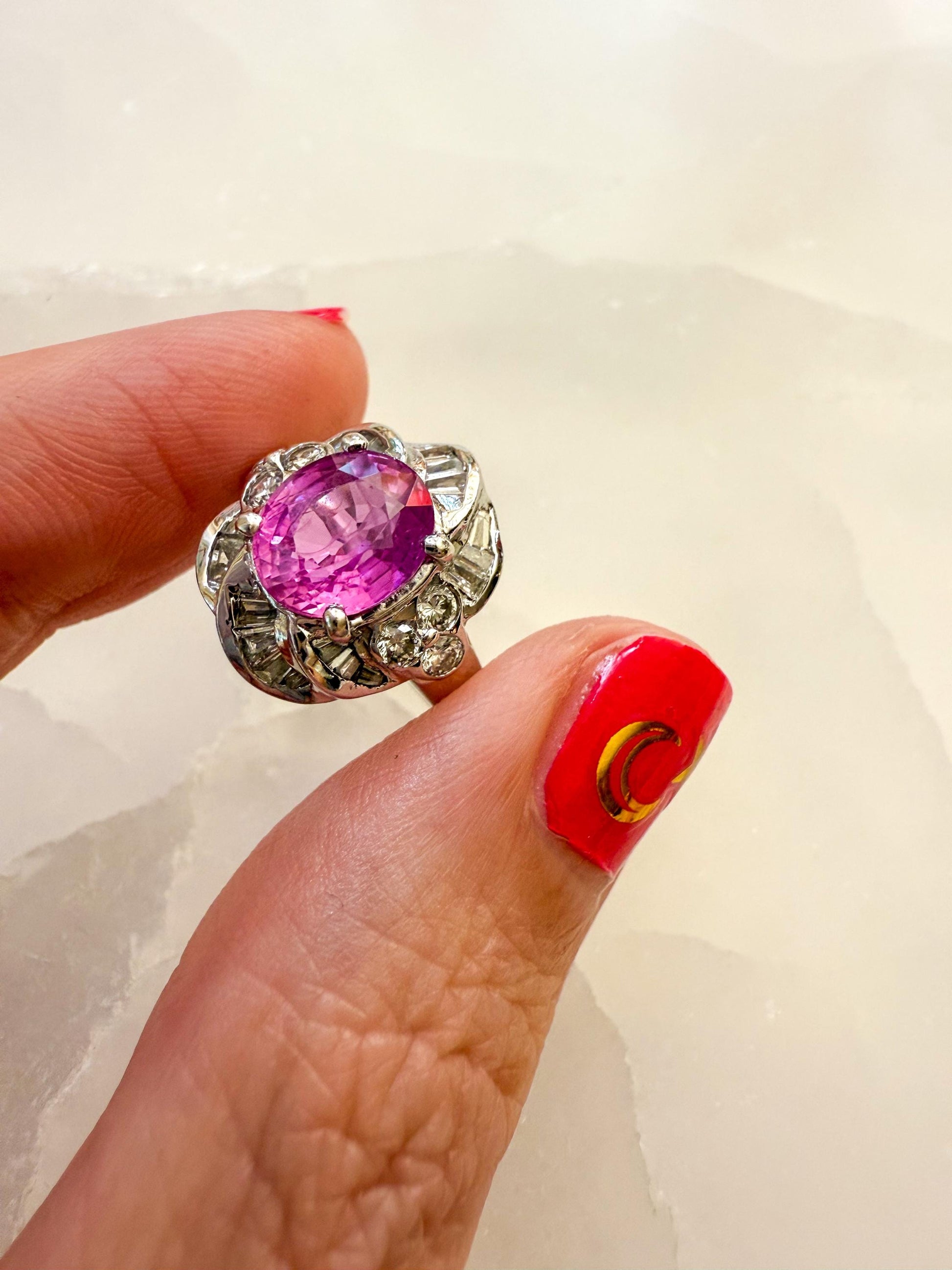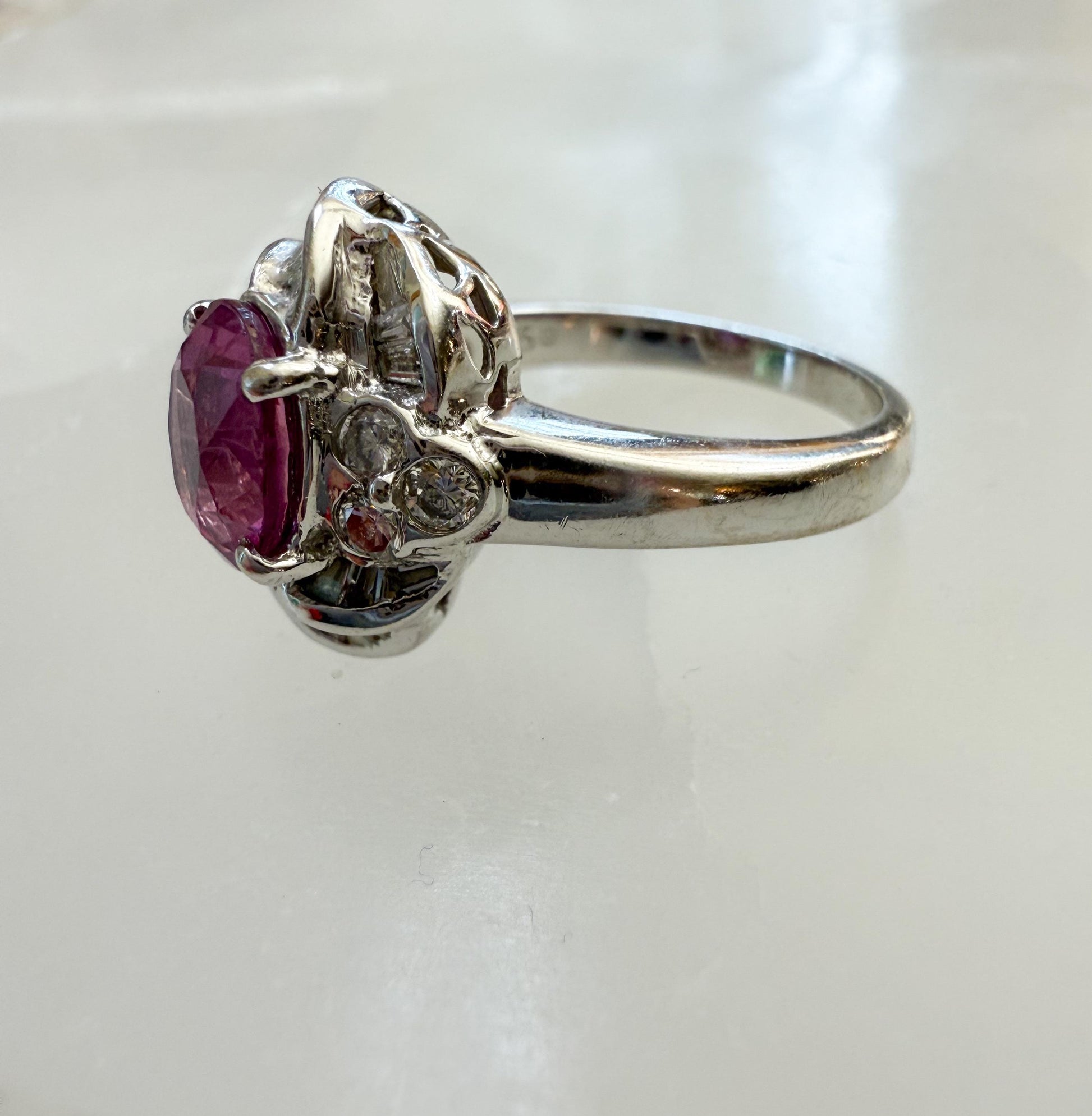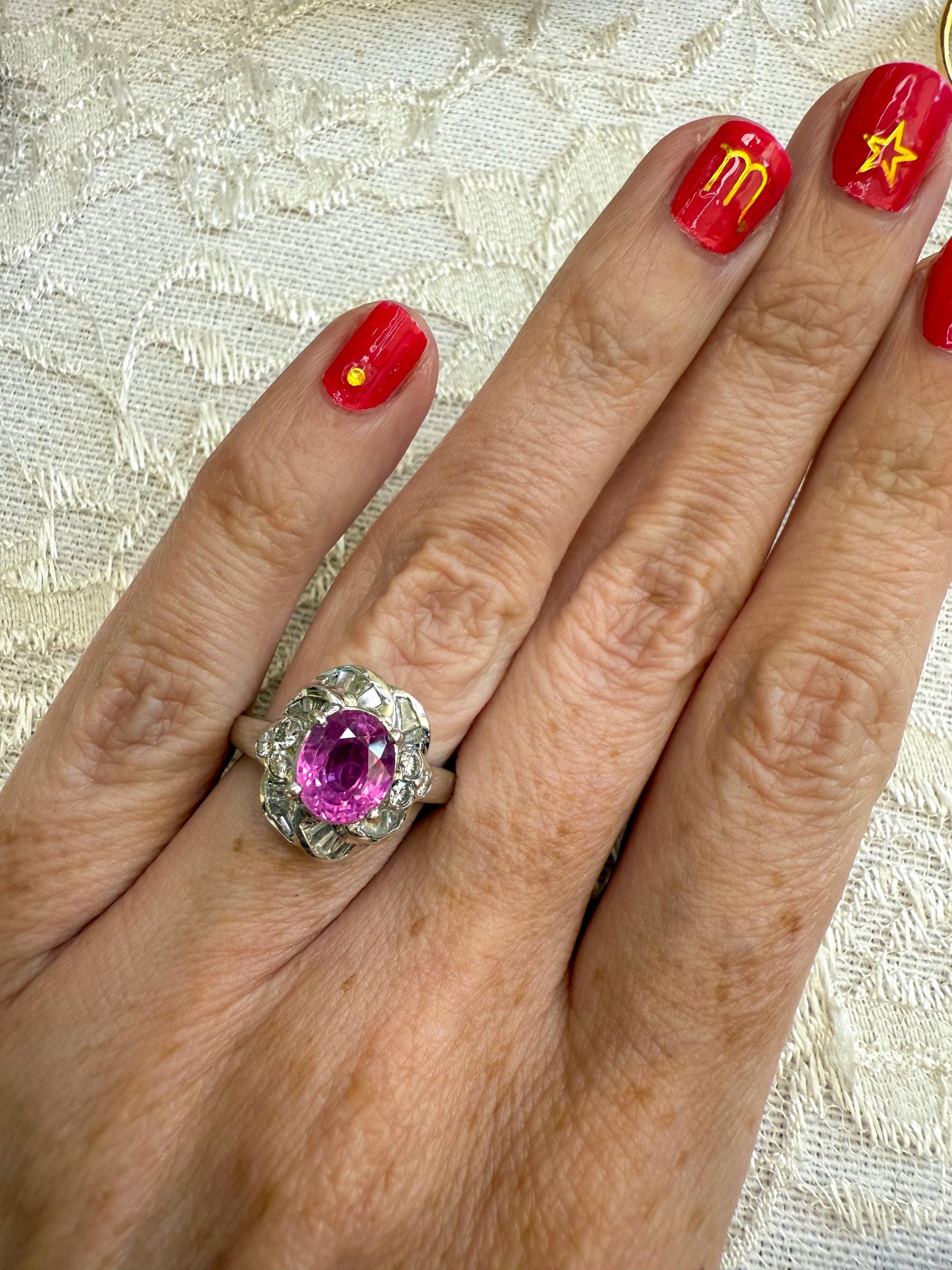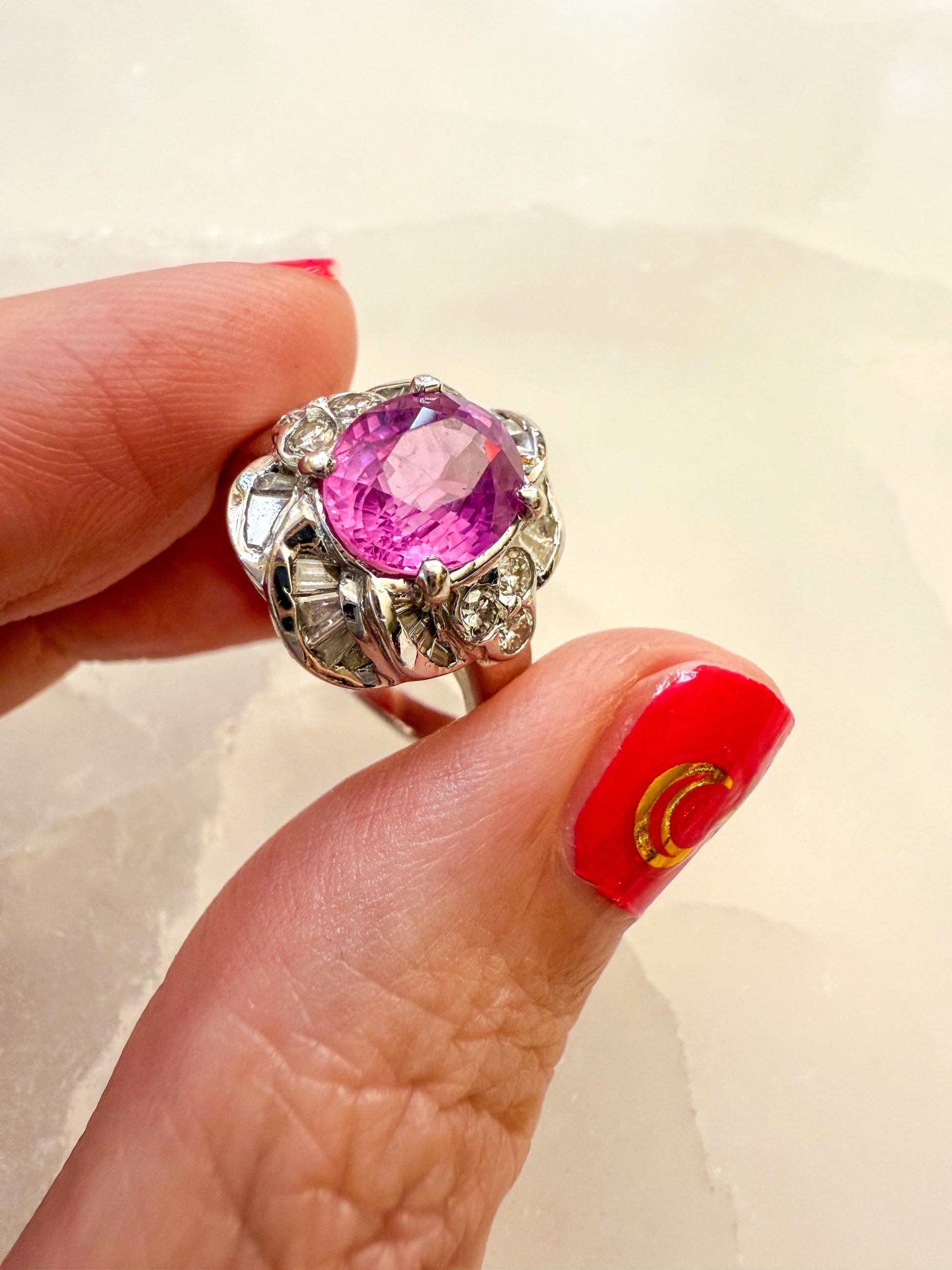 This vintage 18K white gold ring is a true showstopper, featuring a vivid pink sapphire surrounded by a sculptural setting of brilliant diamonds.