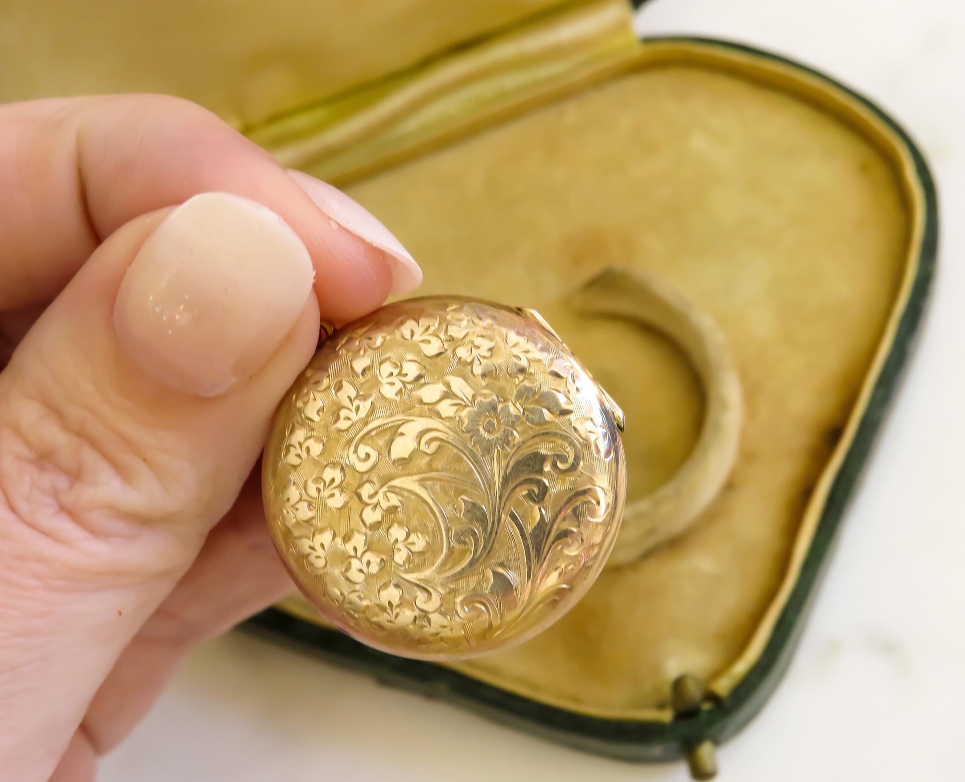 Antique 12K Gold Fill Engraved Round Locket Initialed “AF with Floral Back 1 4g Victorian Charm