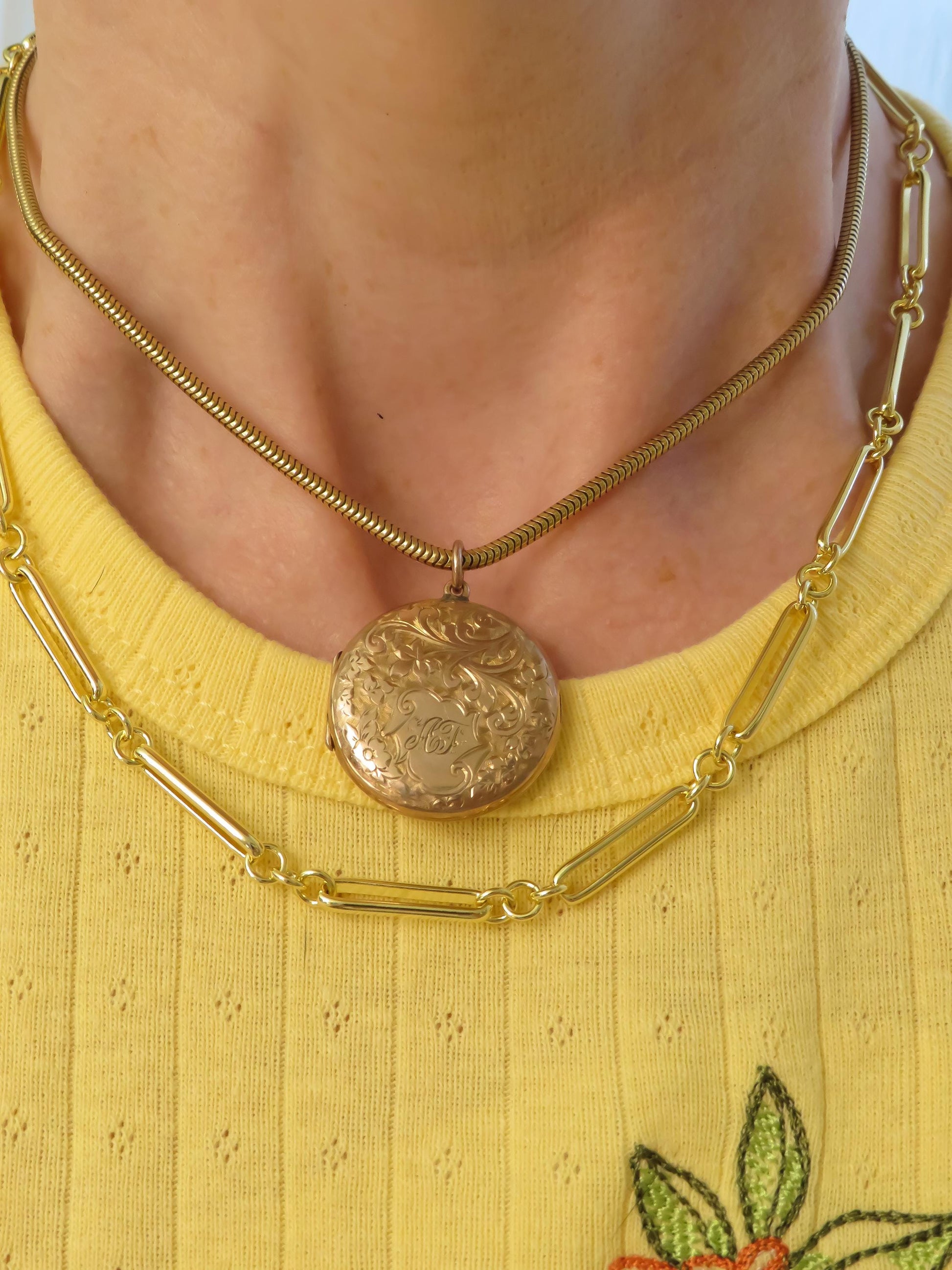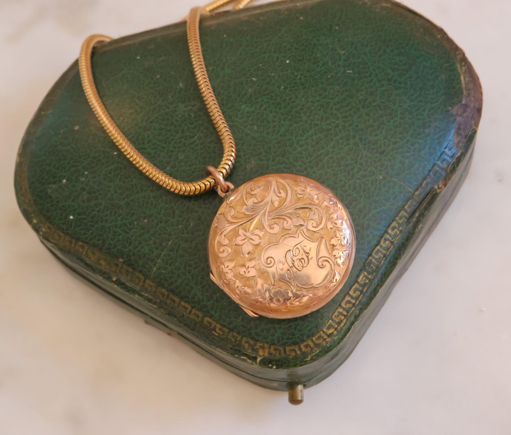 Step back into a more elegant time with this exquisite antique 12K gold fill locket, a cherished keepsake from the late Victorian or early Edwardian era. Beautifully preserved and rich in sentiment, this round locket is a timeless piece of wearable history.