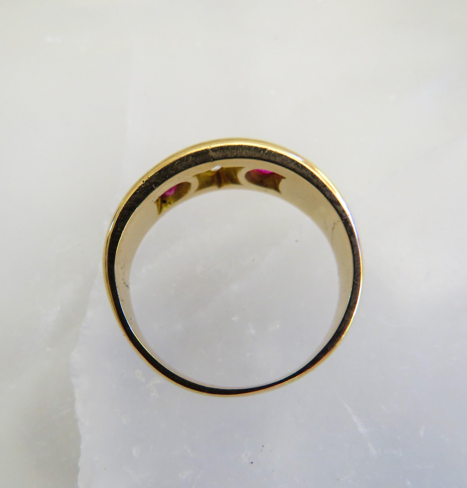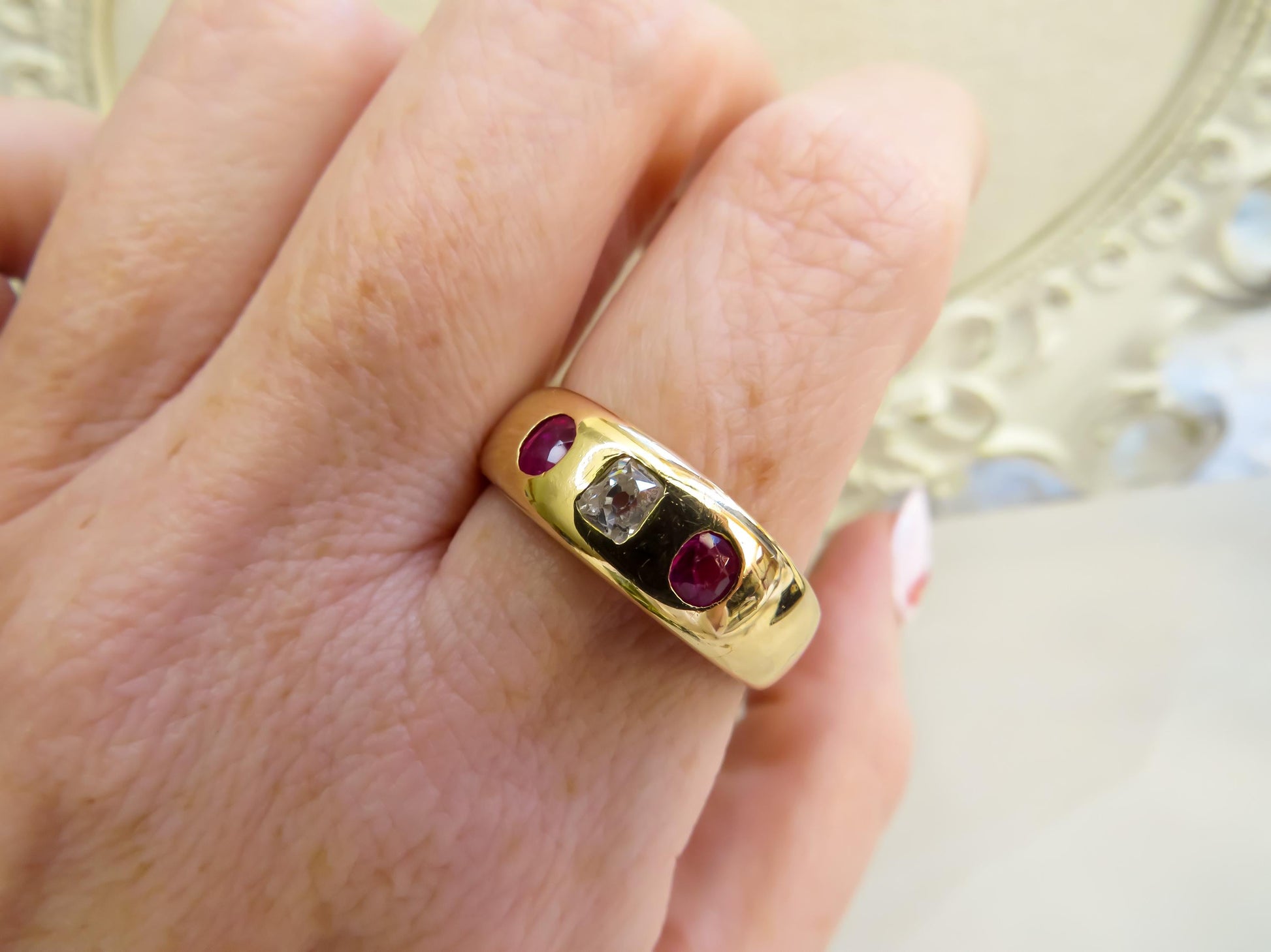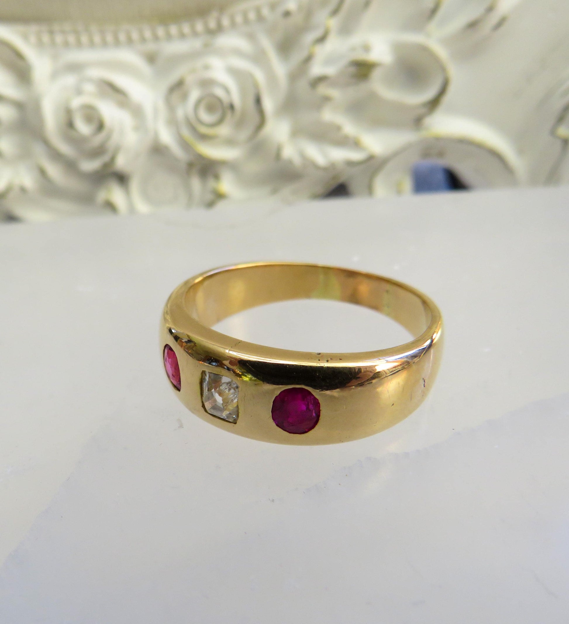 Antique 18K Gold Old Mine Cut Diamond & Ruby Trilogy Ring