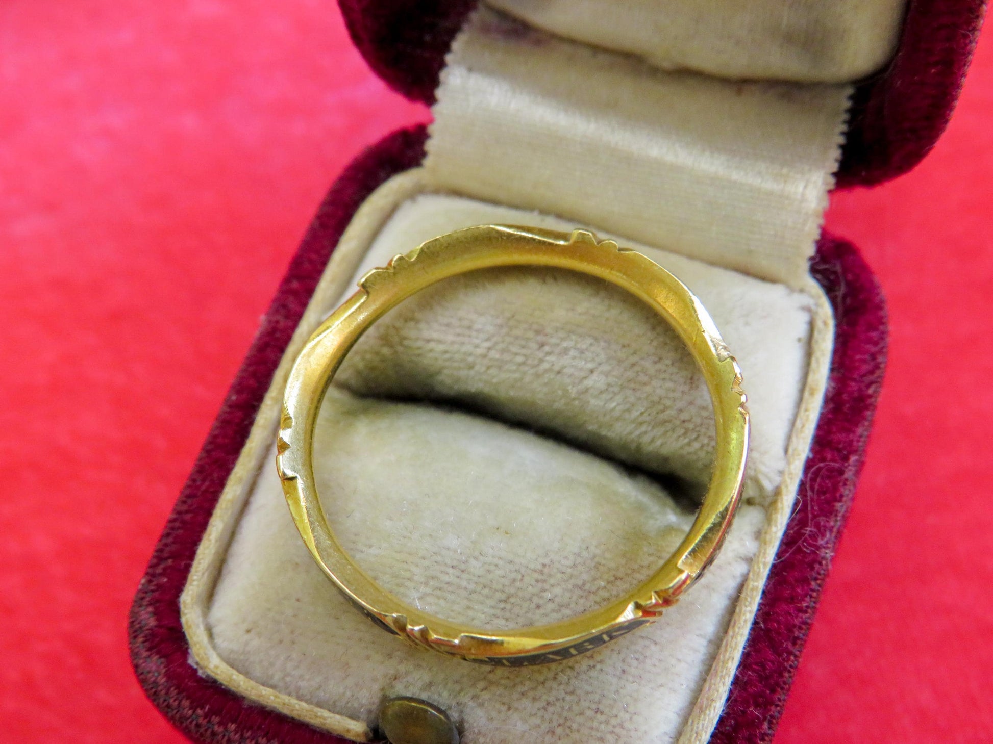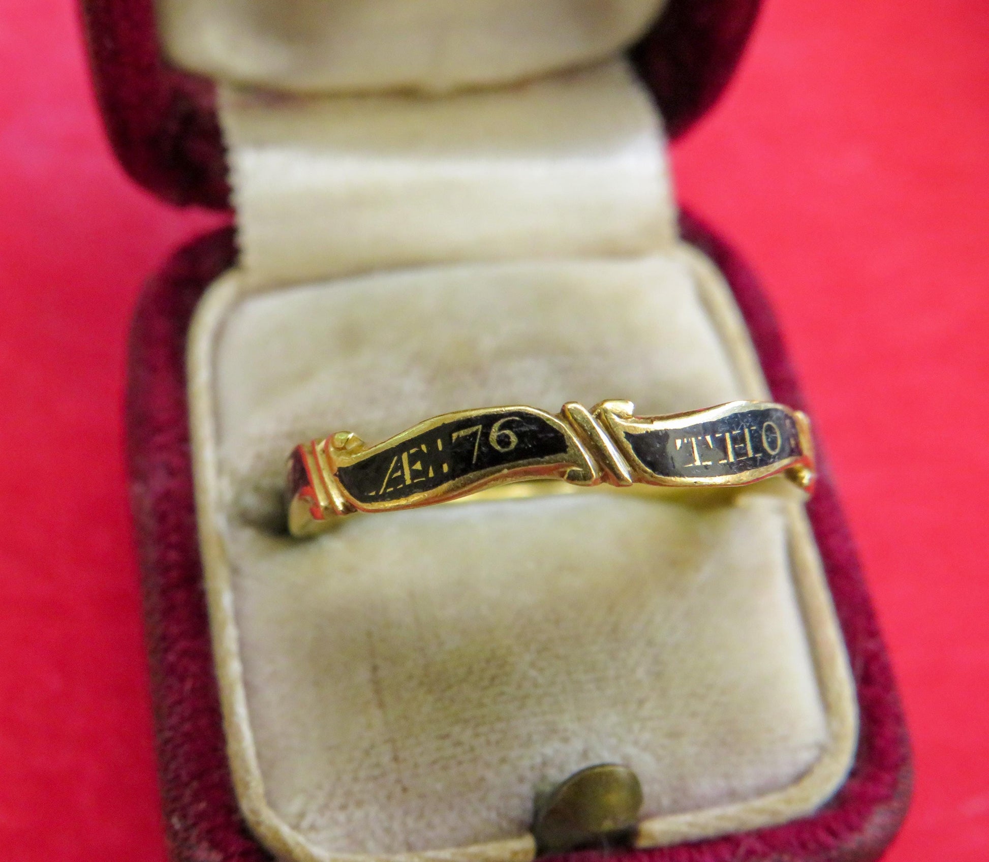 This striking Georgian mourning ring dates to 1777 and is a beautiful example of 18th-century memorial jewelry. Crafted in solid 18K gold and weighing 3.48 grams, it features a band of original black enamel in very good antique conditionan uncommon find for a piece of this age.