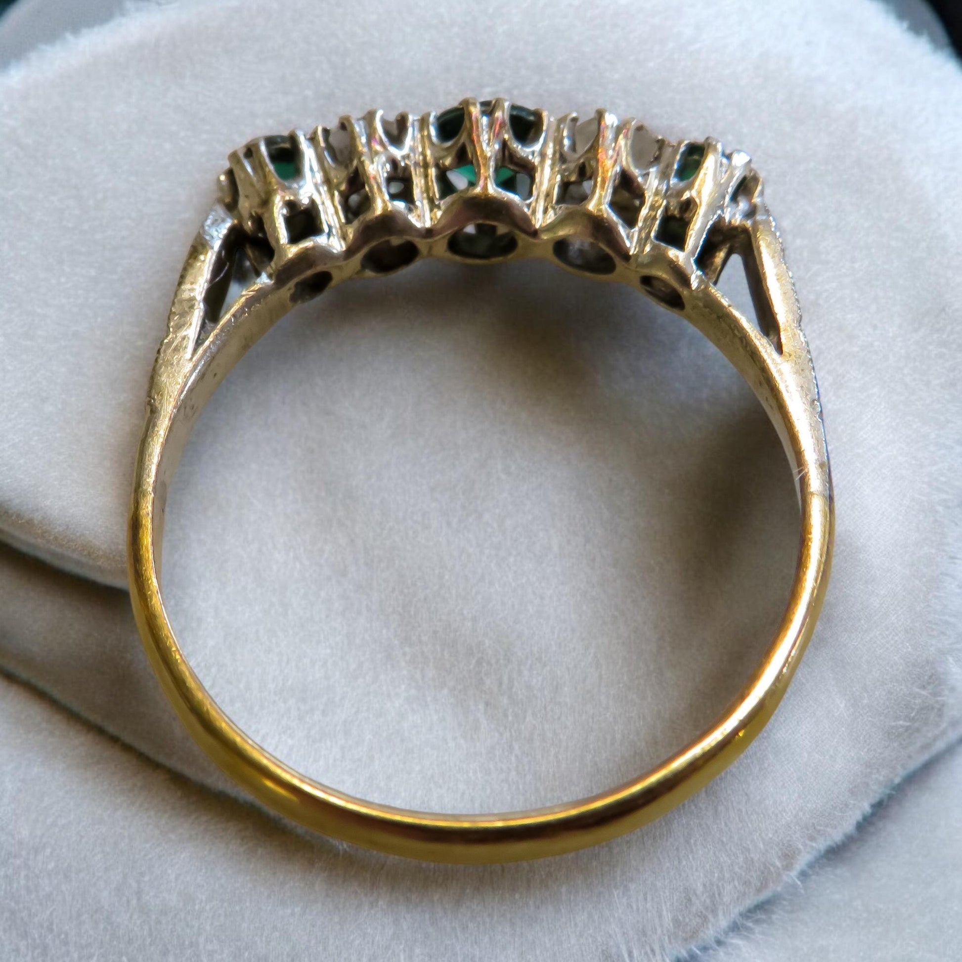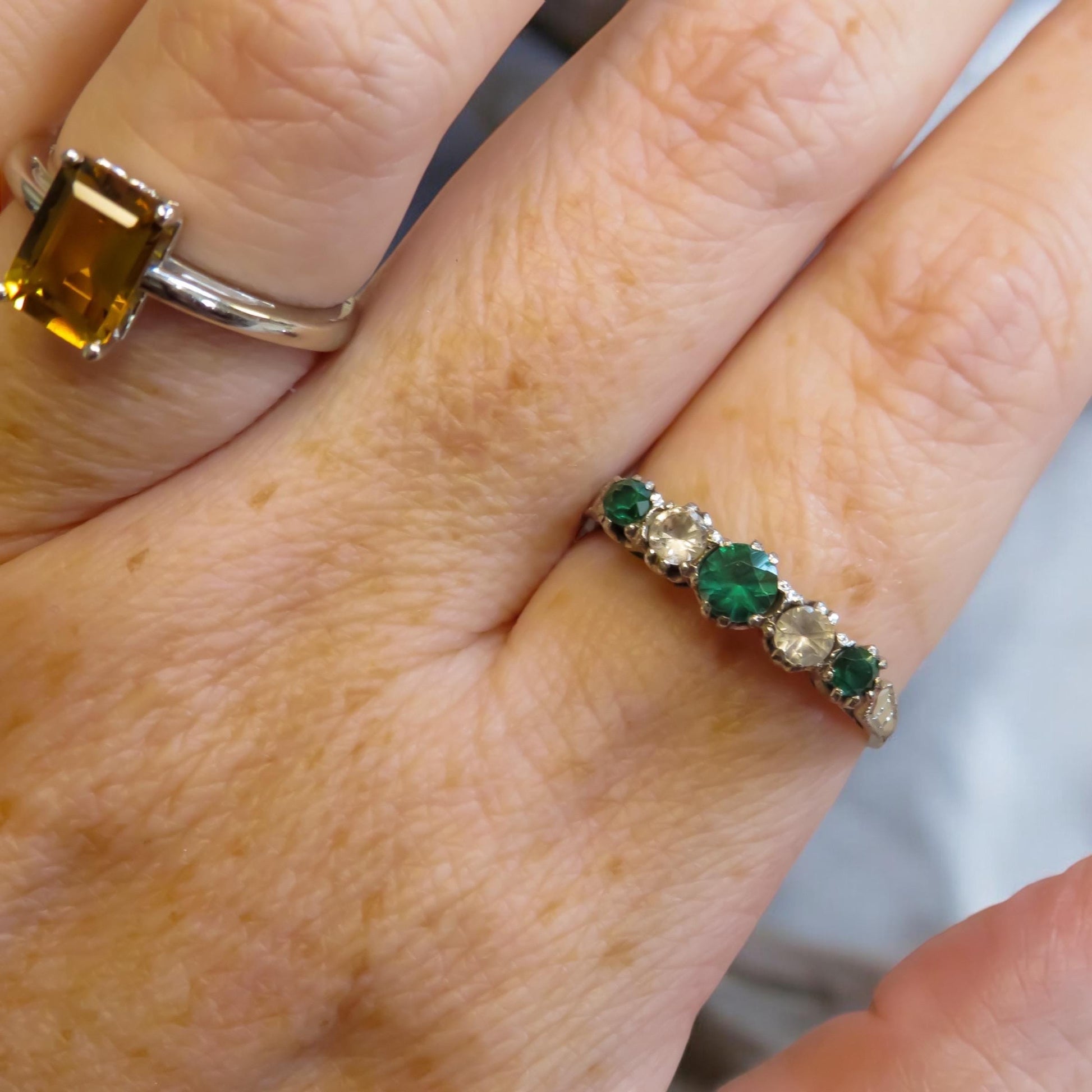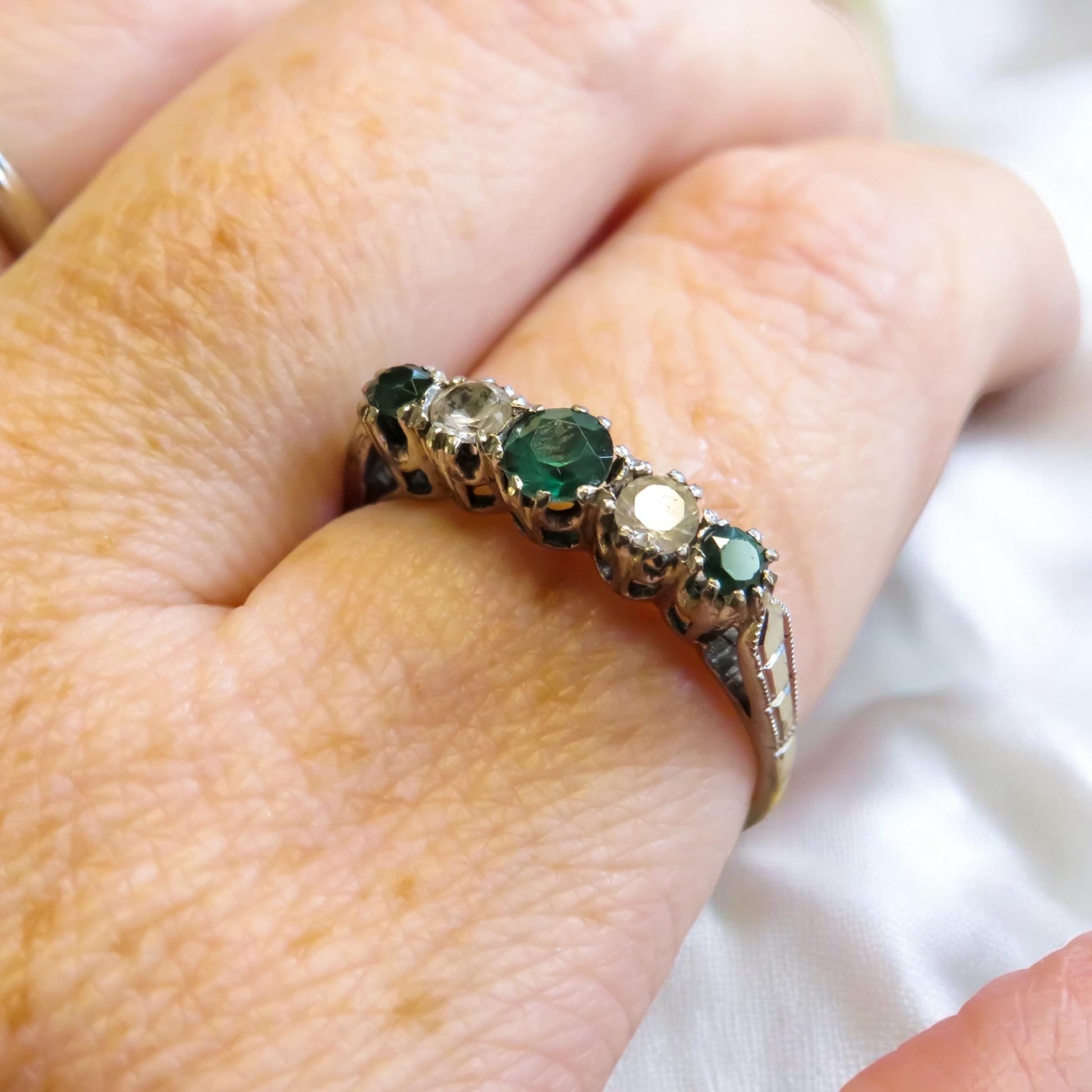 This stunning antique ring showcases a delicate row of vibrant, created green spinel and sparkling white topaz stones, set in a timeless design that radiates elegance.