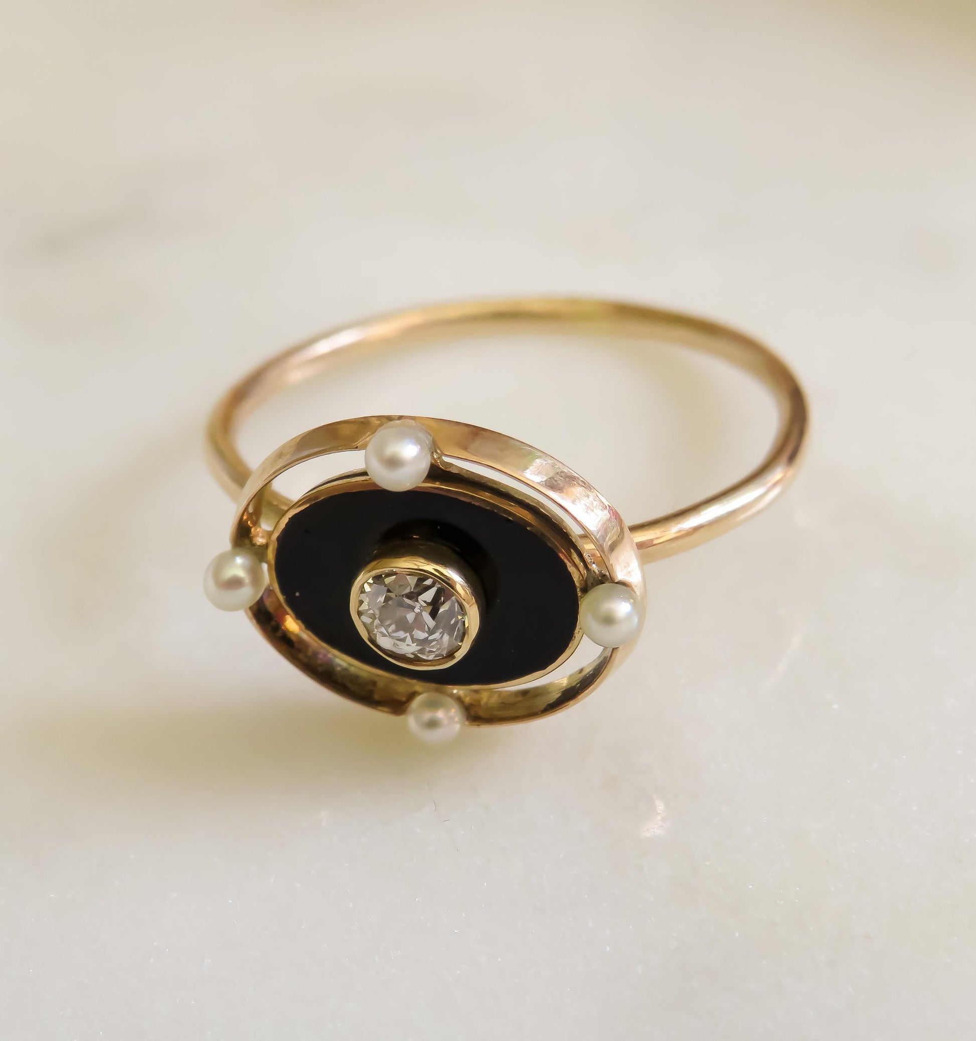 Four dainty seed pearls delicately accent the centerpiece, lending the ring a refined, Victorian grace. The setting is crafted in solid 14K gold, securely bezel-set, and mounted on a slender 10K gold shank for comfort and durability.