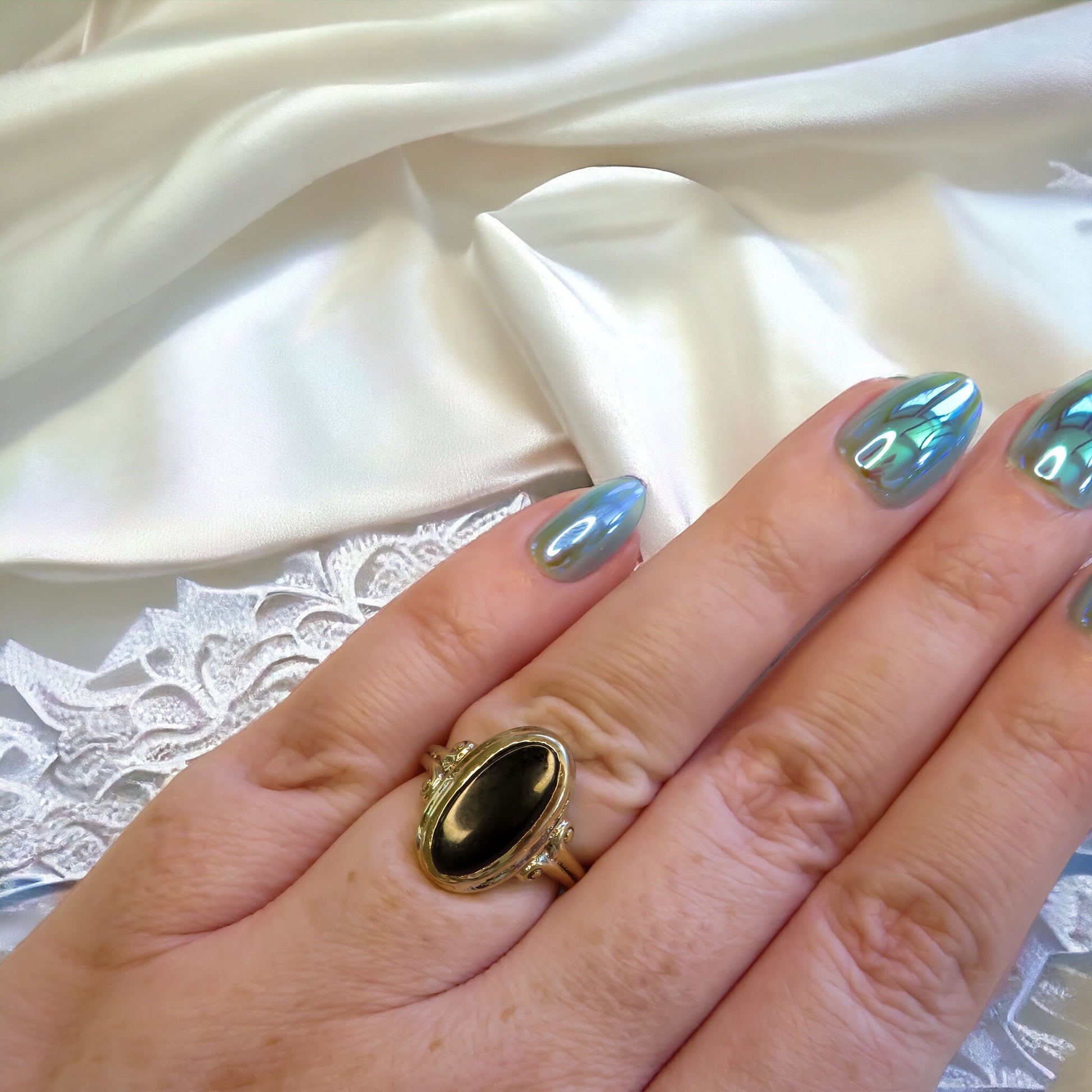 Embrace the allure of yesteryears with this stunning onyx ring.