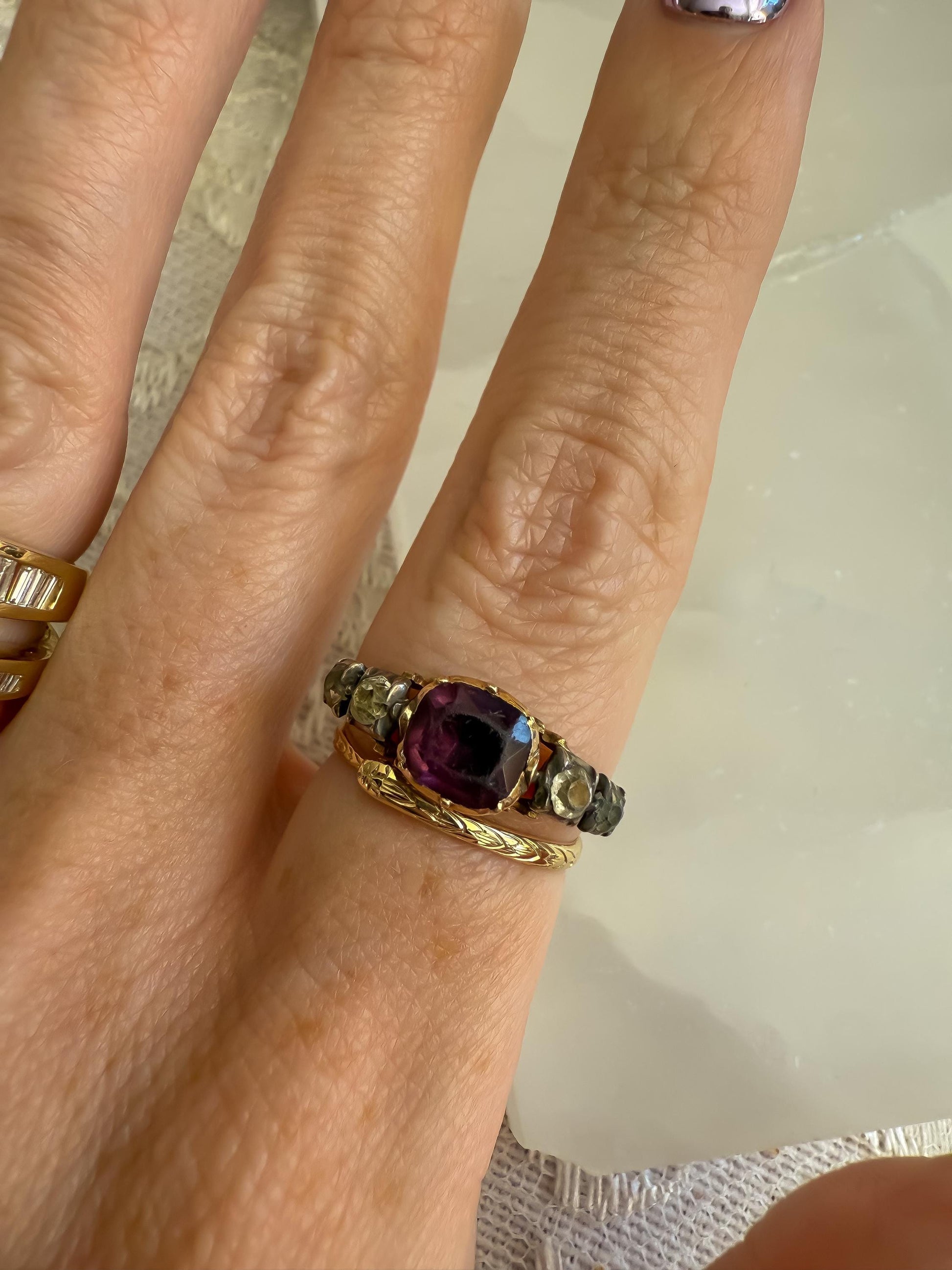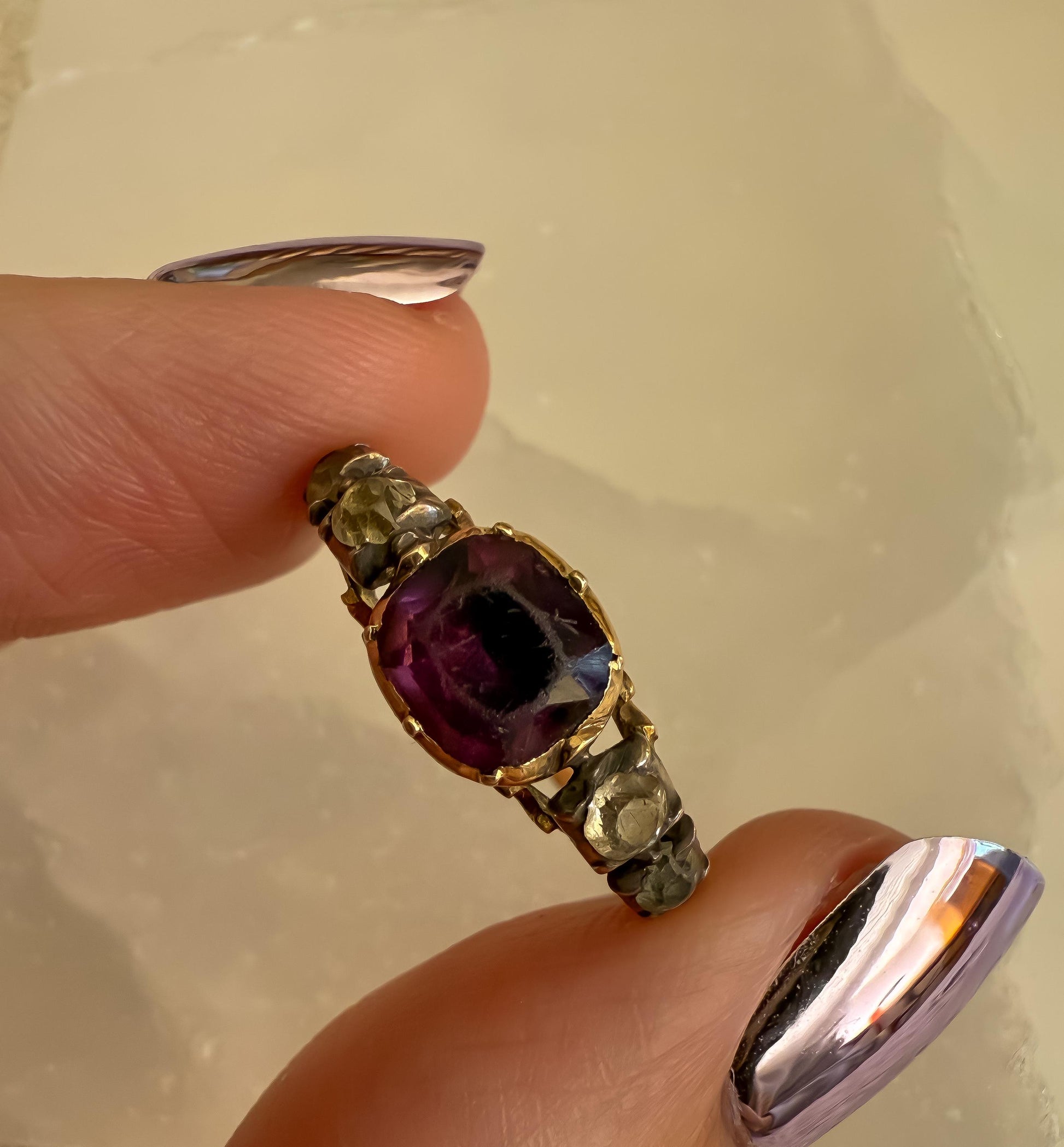 Step back into the romance of the Rococo era with this antique paste ring, crafted with timeless charm and intricate detail. The ring features a vibrant purple paste center stone framed by shimmering clear paste accents, all set in a silver-topped 14K gold setting. The soft patina and graceful curves of the design highlight its age and character, making this a true collector’s piece.