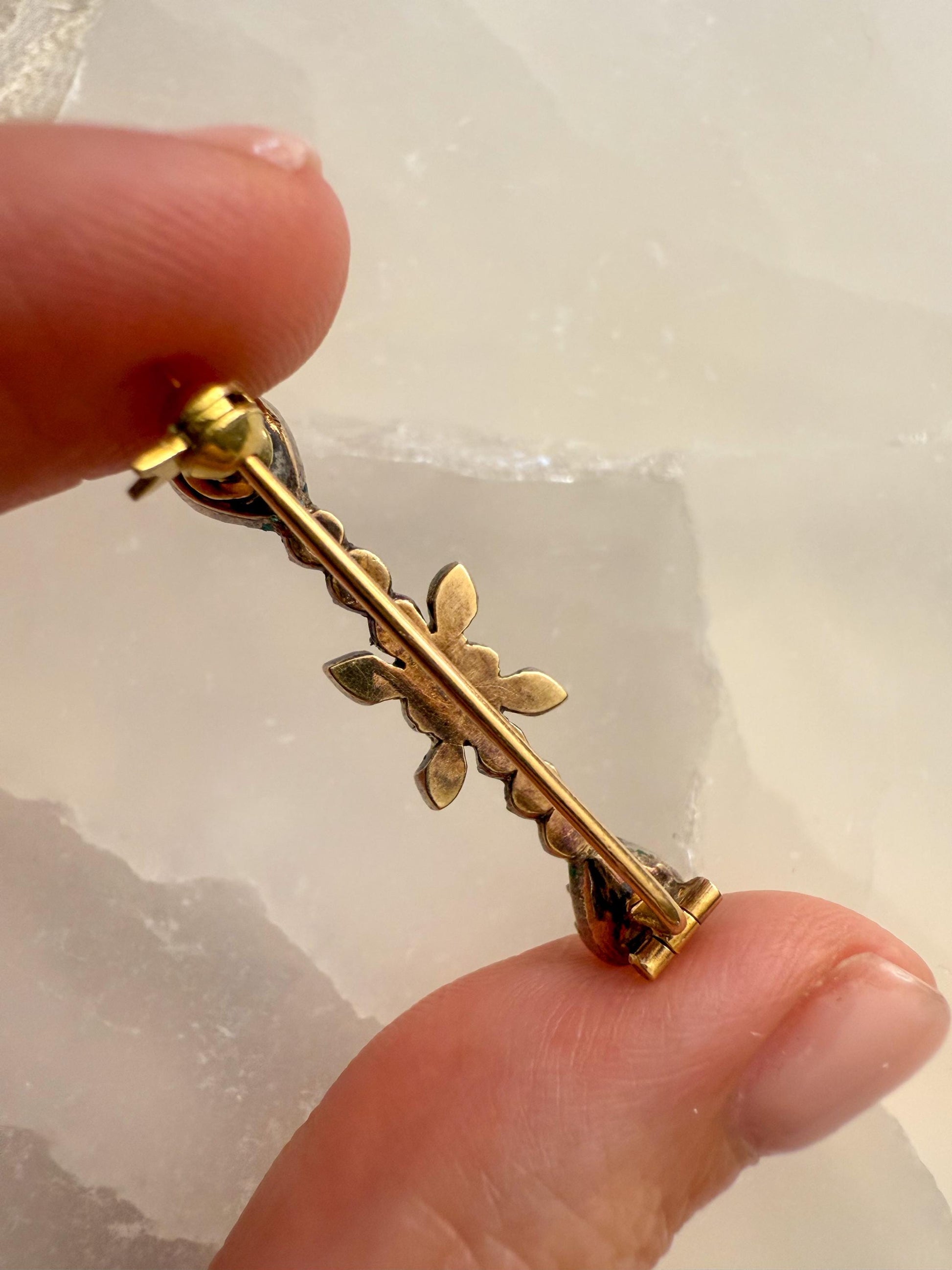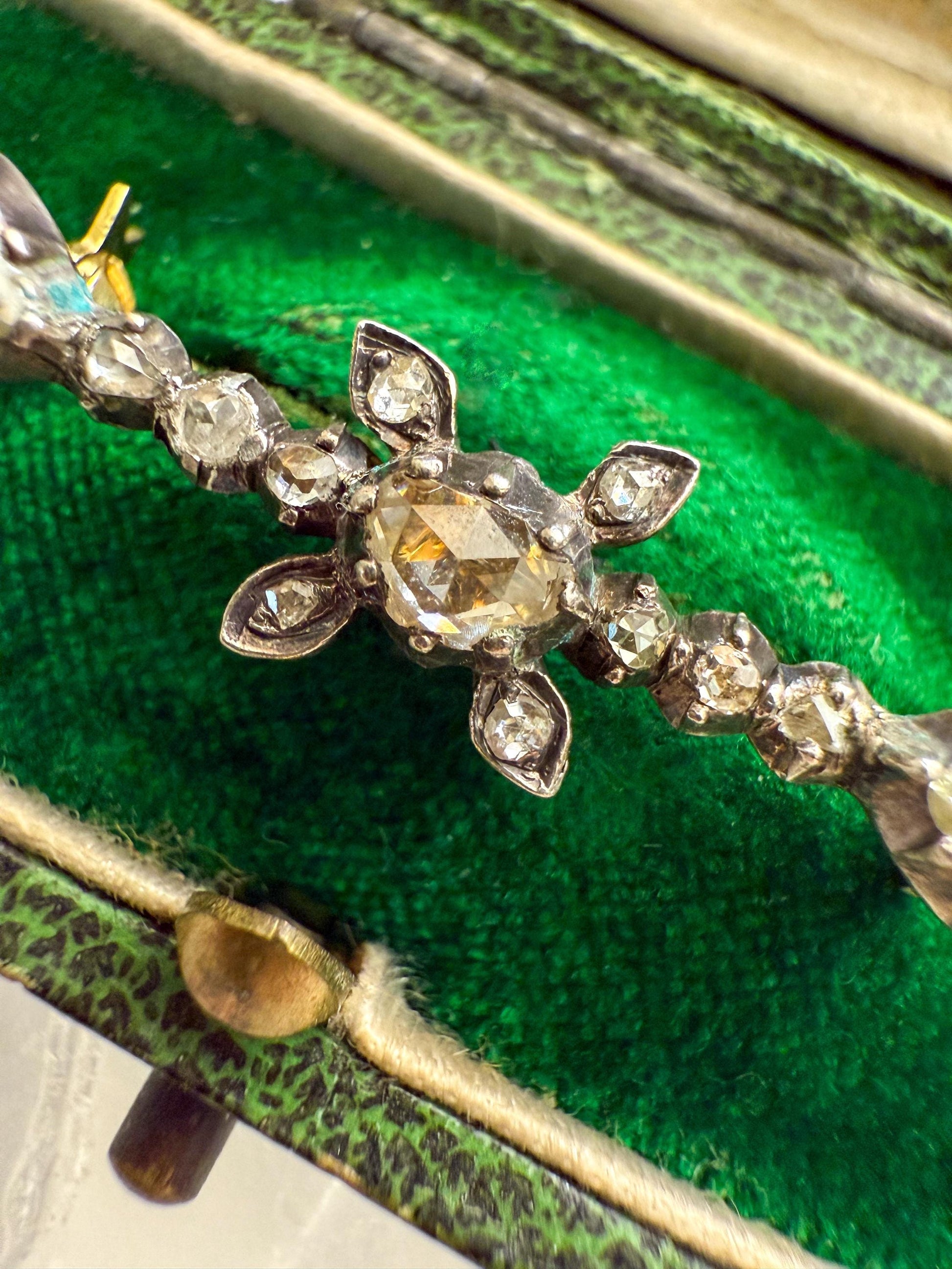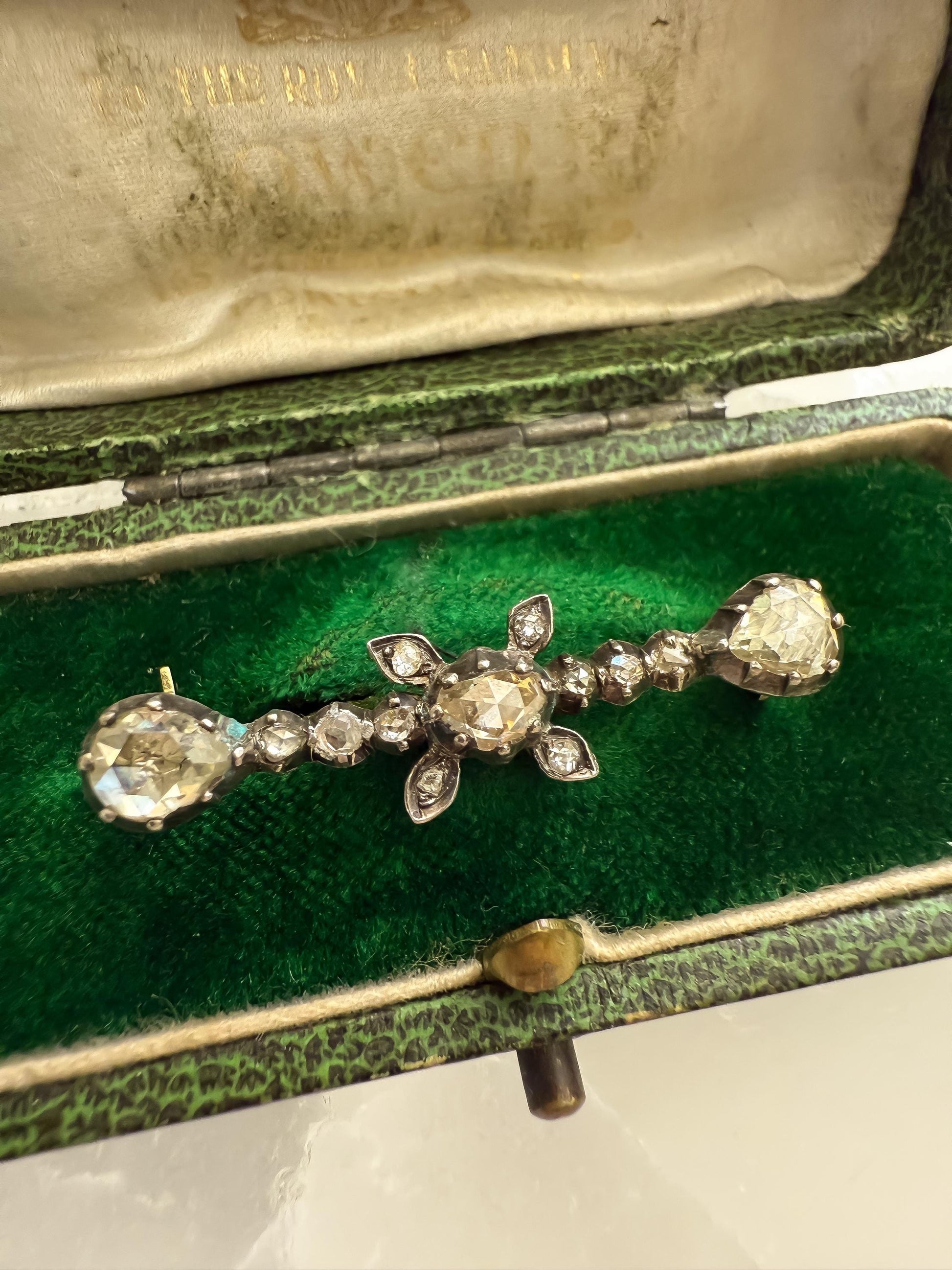 This exquisite antique brooch is a treasure of Georgian-to-early-Victorian craftsmanship, showcasing the romantic sparkle of rose cut diamonds in a timeless silver and gold setting. Measuring 1.25 inches in length, the piece is as versatile as it is beautiful—perfect worn as a brooch, used as a chain extender, or, with the skill of a jeweler, converted into a pendant.