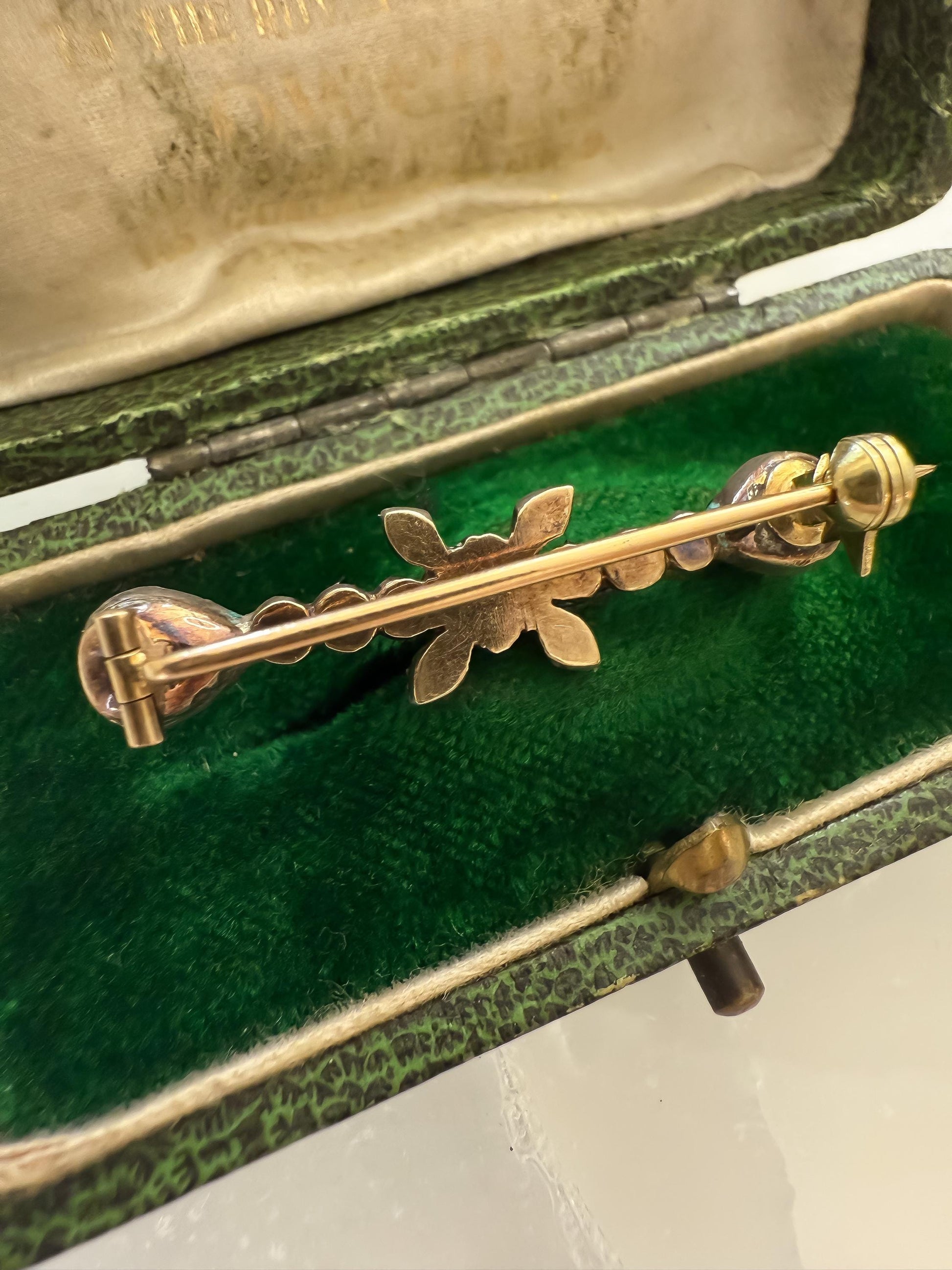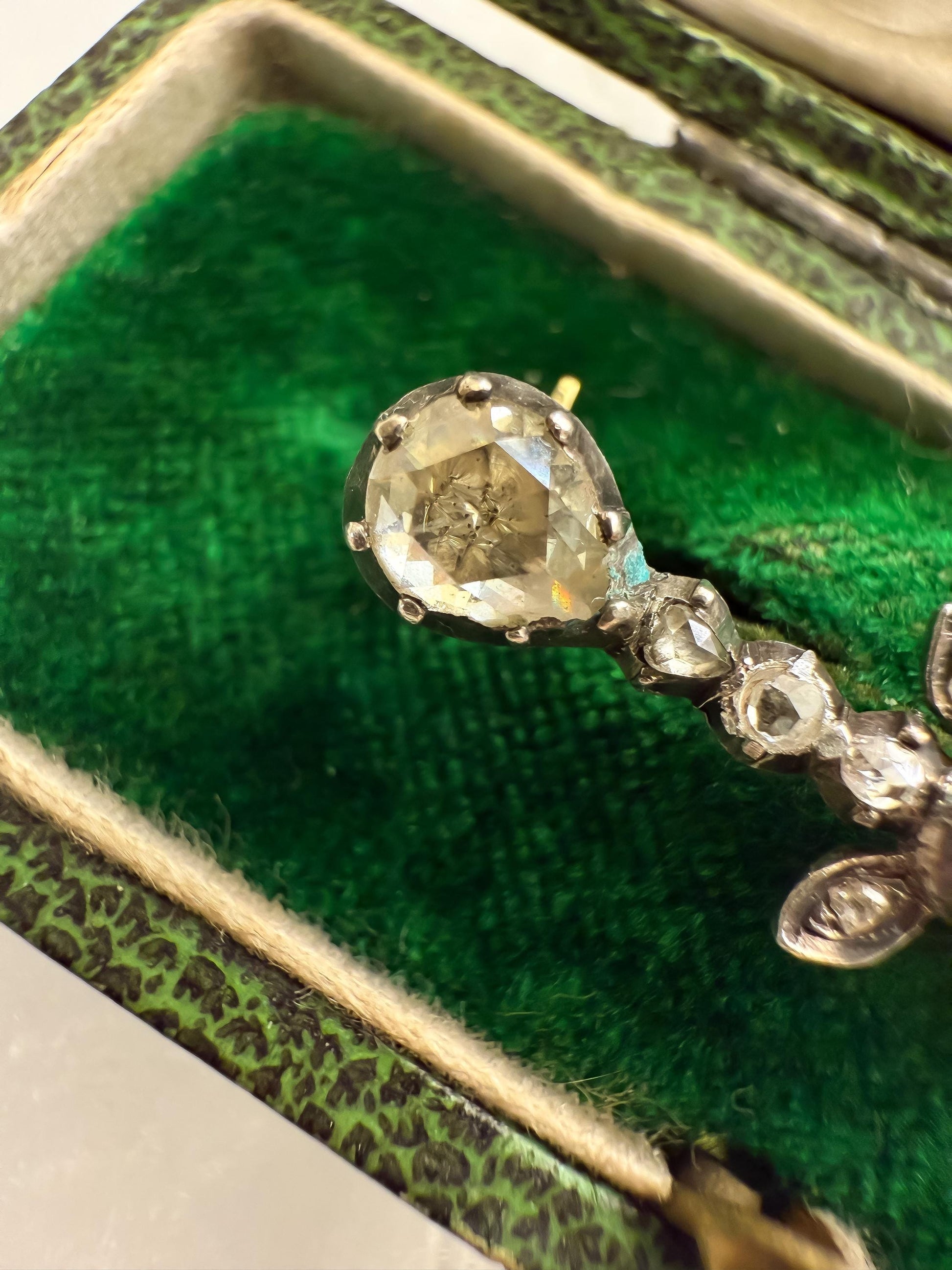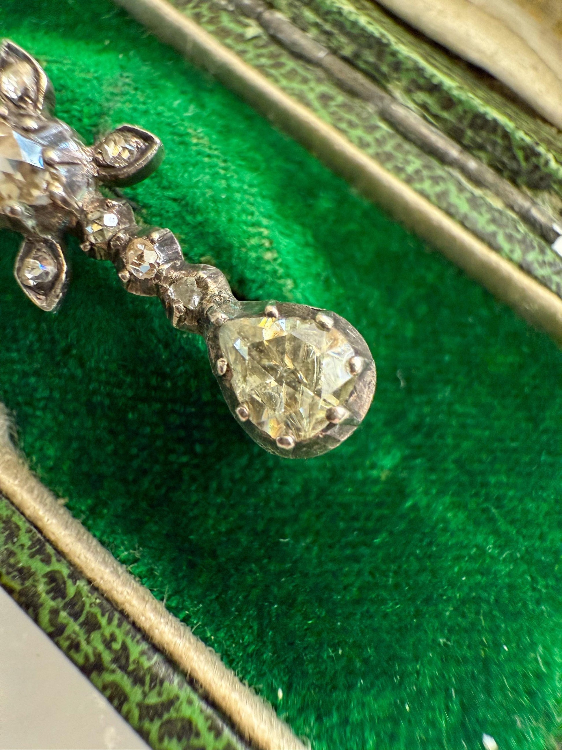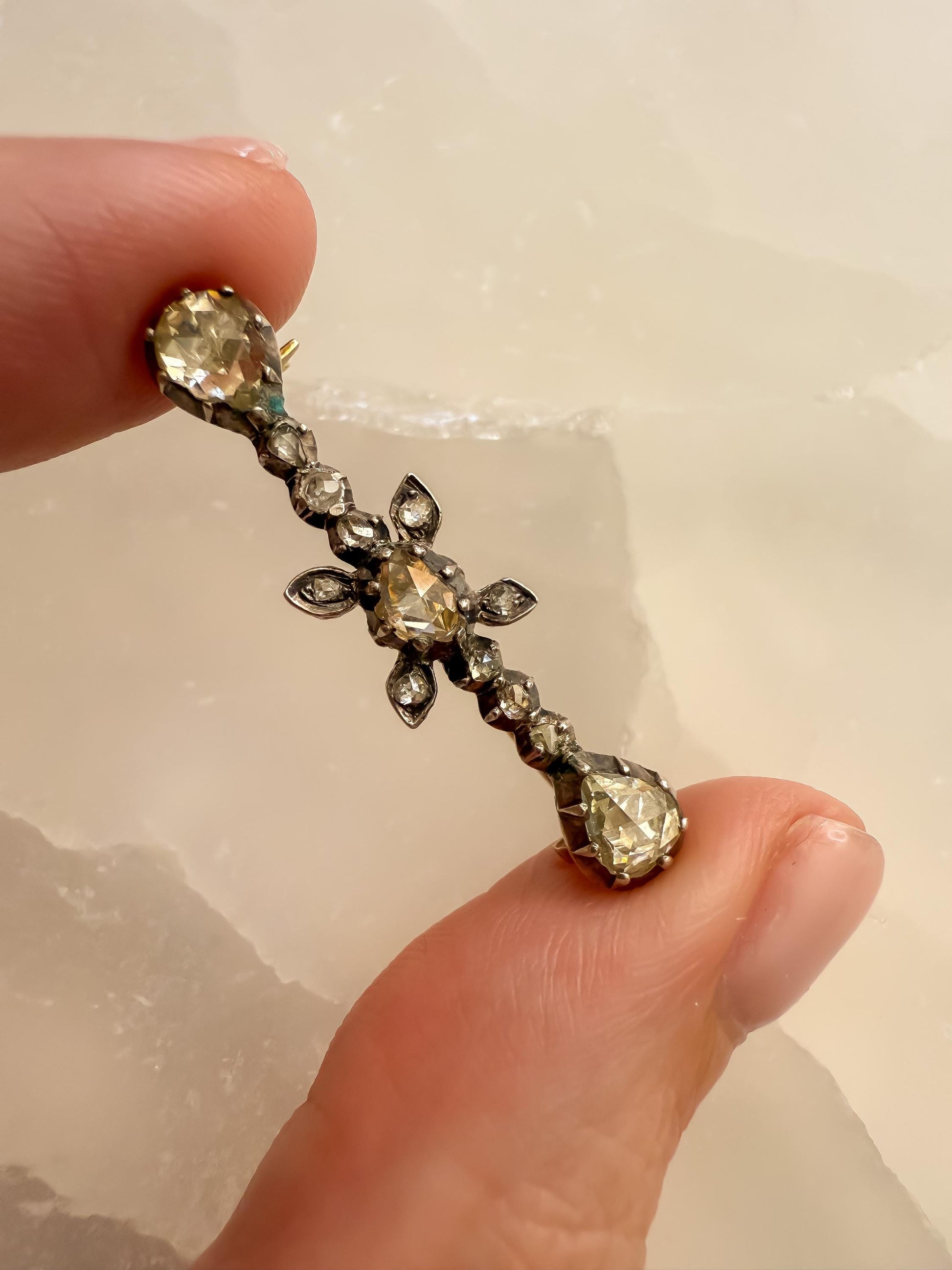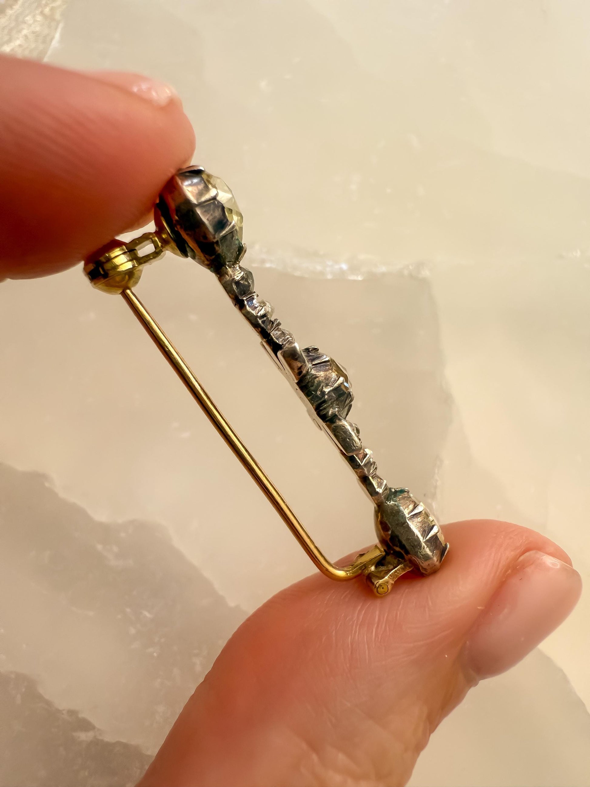 The design features two pear-shaped rose cut diamonds on each end, each facing up at approximately 0.56 carats, with a central rose cut diamond of approximately 0.28 carats. These antique stones have the soft, candlelit shimmer that makes rose cuts so beloved. The diamonds are set in silver and foil-backed, while the pin back is crafted from rich 18K yellow gold—a traditional pairing in fine antique jewelry.