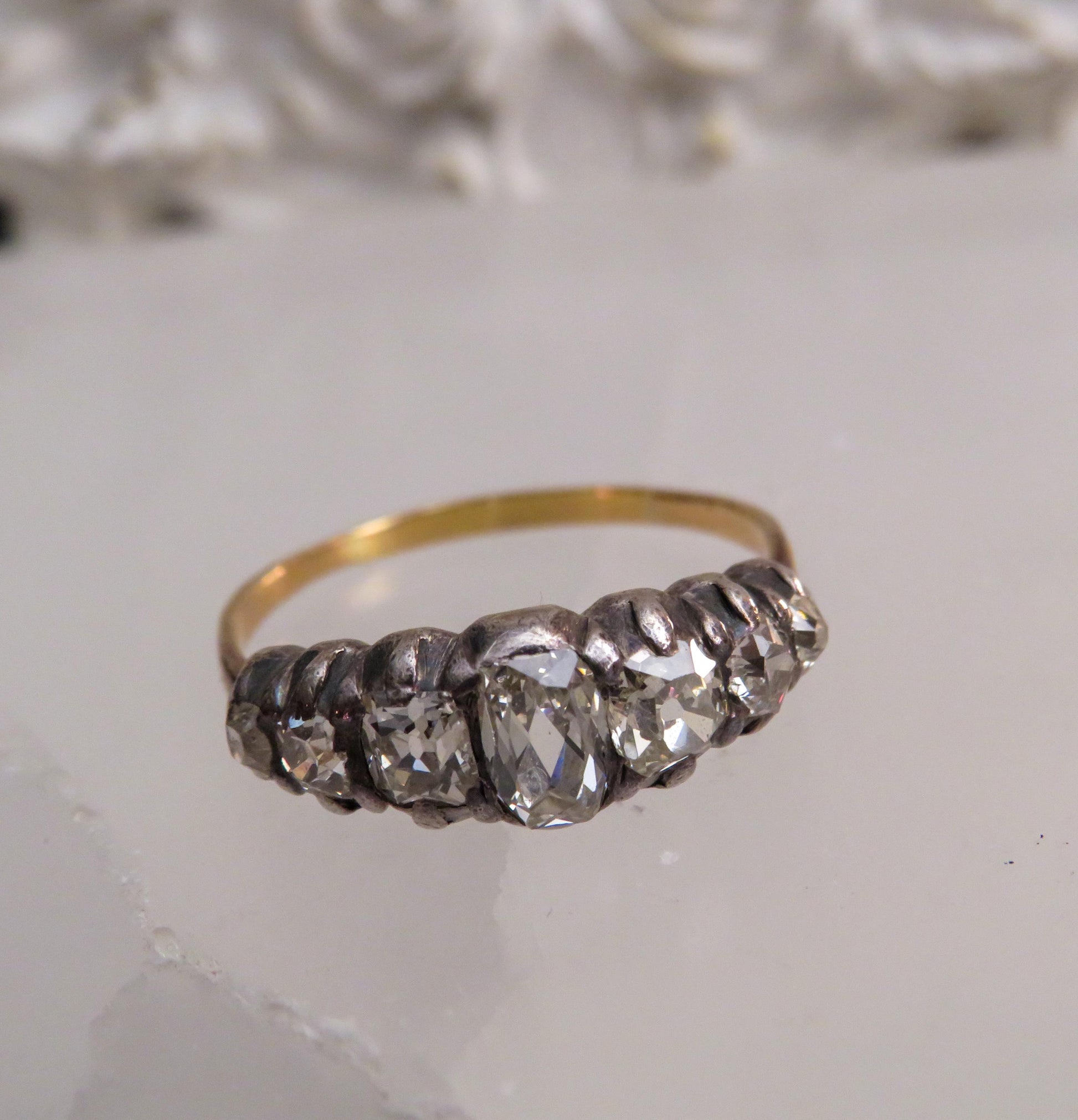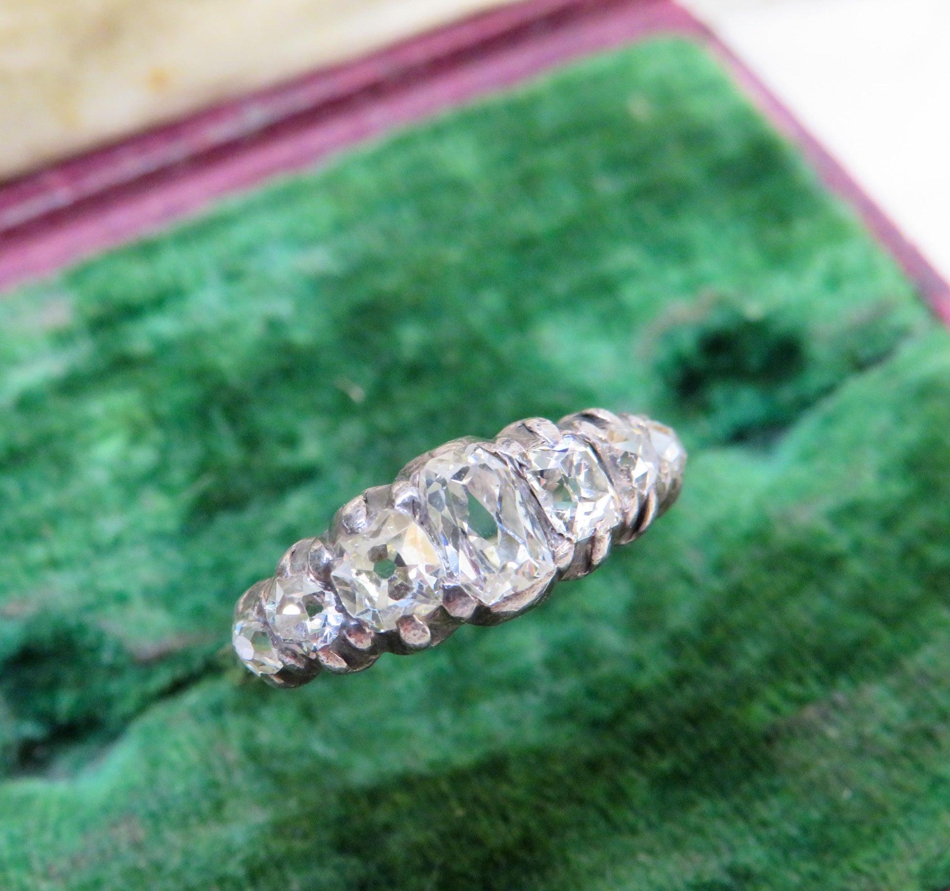 Step into the romance of the early Victorian era with this extraordinary seven-stone diamond ring—an absolute treasure for collectors and antique-jewelry lovers. This piece features a beautifully graduated line of diamonds totaling approximately 1.3 carats, with the largest center stone measuring around .45 carats.