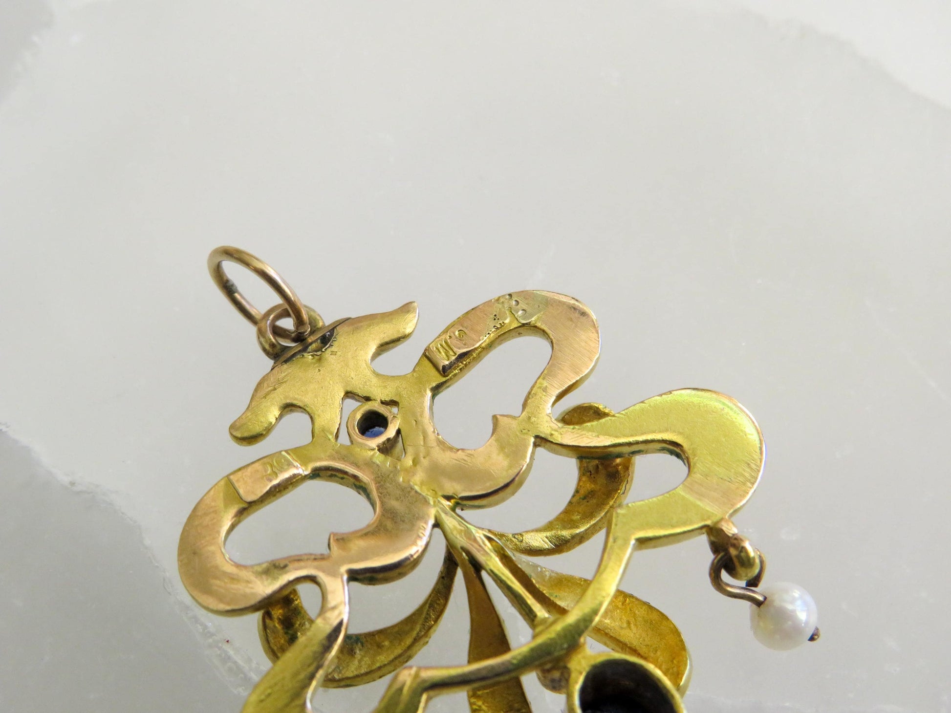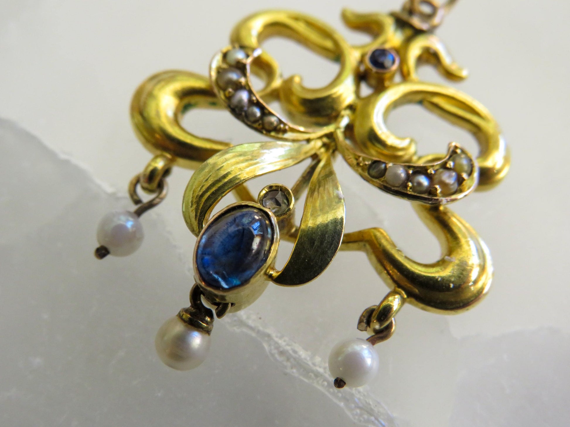 Edwardian 18K Gold Pendant with Sapphire & Pearl Drops