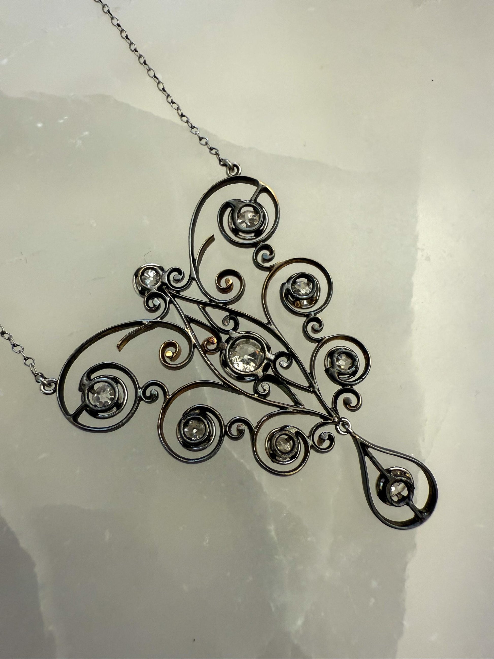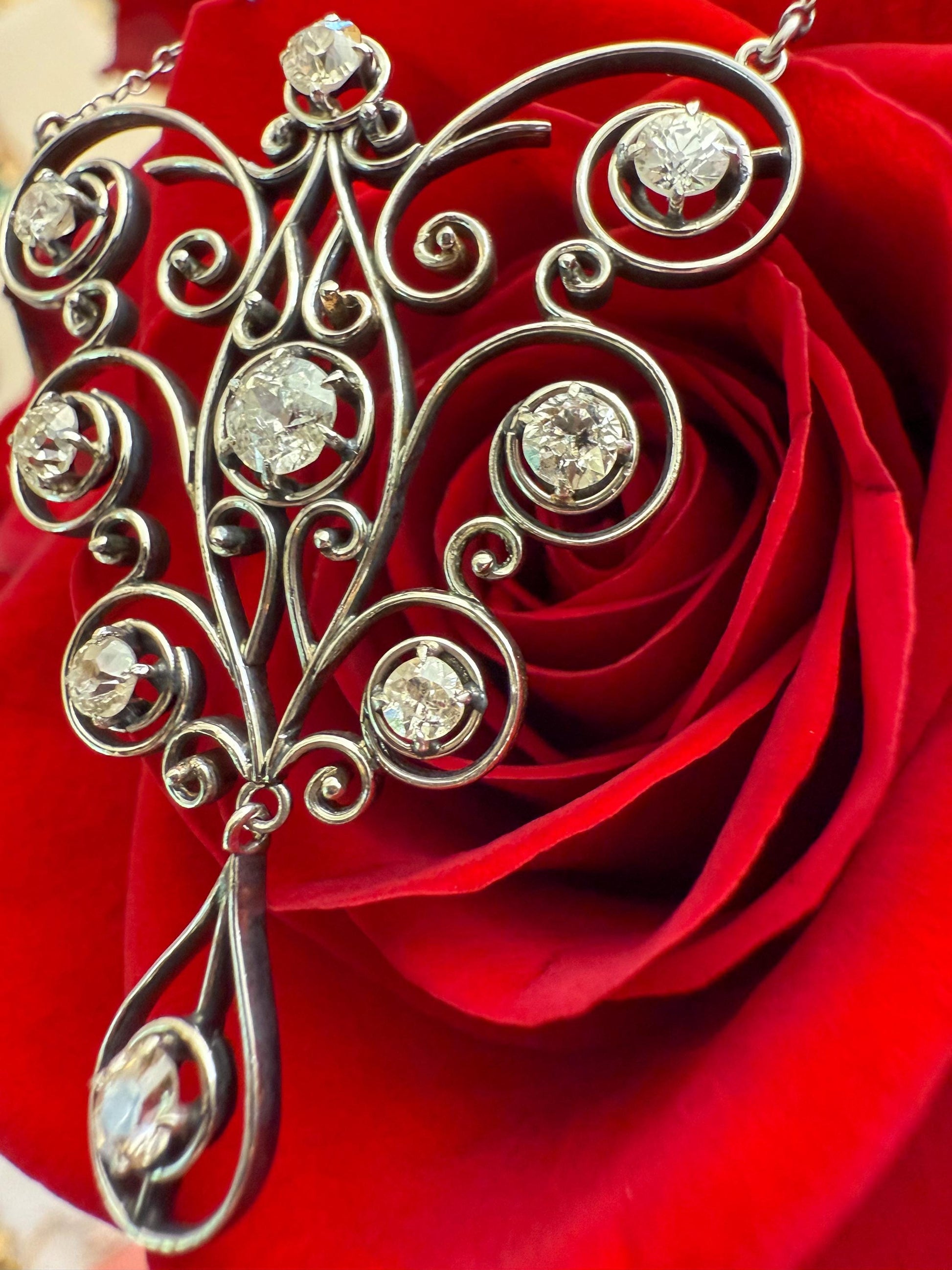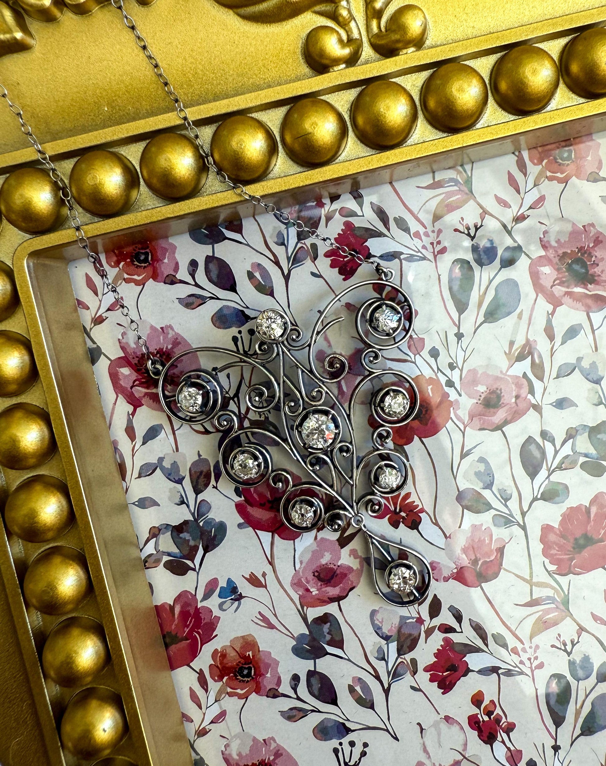 Each diamond was hand-cut over a century ago and tells its own story. Some are crisp and white, others glow with the warmth of age together they create a beautifully balanced sparkle that feels refined, not flashy. The elegant scrollwork design creates a bold presence on the neckline without feeling heavy or overdone.