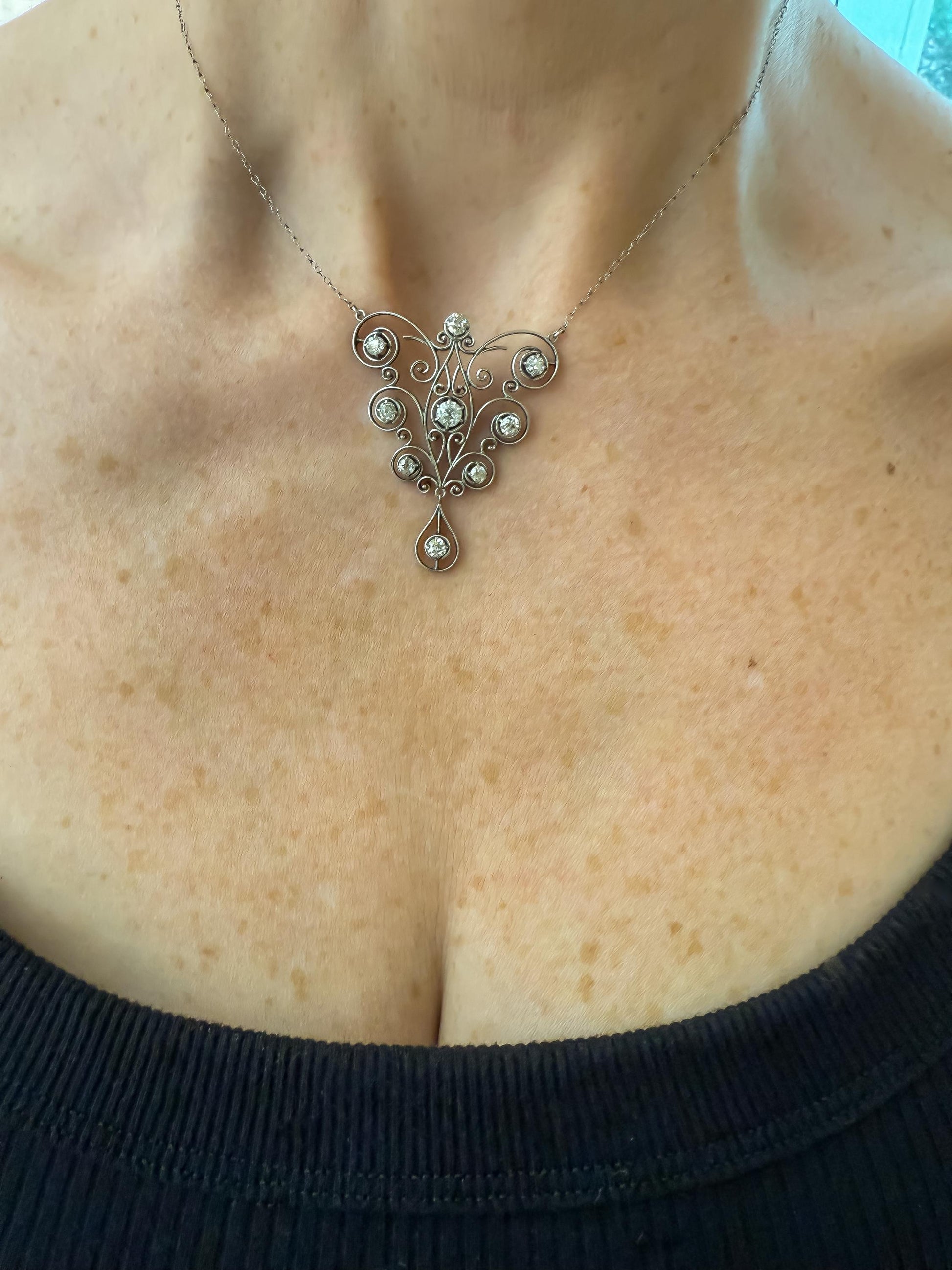 Edwardian Platinum Diamond Necklace | 2ct Old Mine & European Cuts | Antique Filigree Pendant