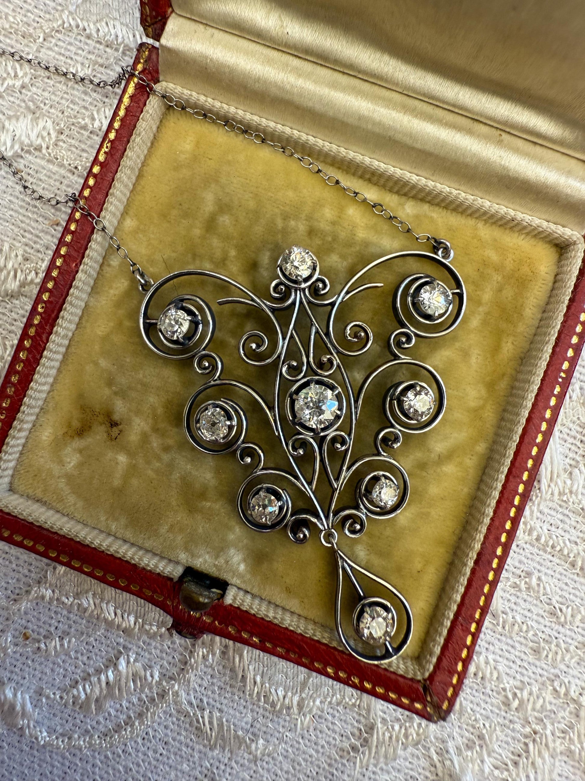 If youre looking for a piece that turns heads and starts conversations, this original Edwardian necklace delivers. Crafted in platinum with about 2 carats of glittering old mine and old European cut diamonds, its a striking example of early 1900s artistry airy, intricate, and full of quiet drama.