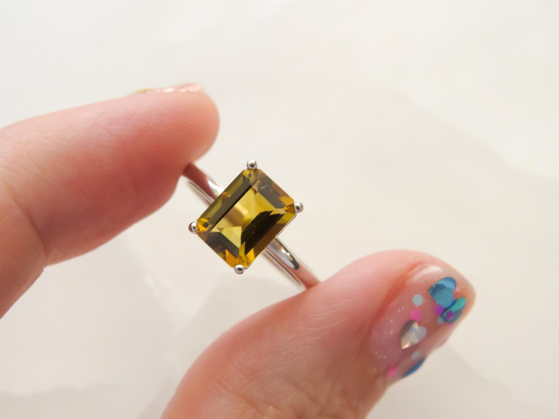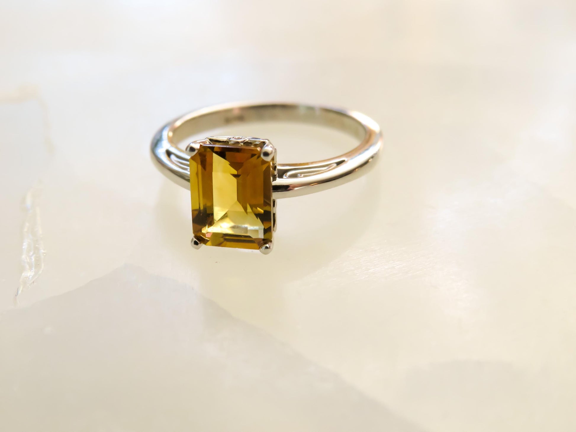 Radiating warm golden light, this 14K white gold ring showcases a captivating emerald-cut citrine weighing 1.5 carats (8mm x 6mm). The crisp step-cut facets of the citrine catch the light with every movement, creating a sophisticated yet inviting glow.