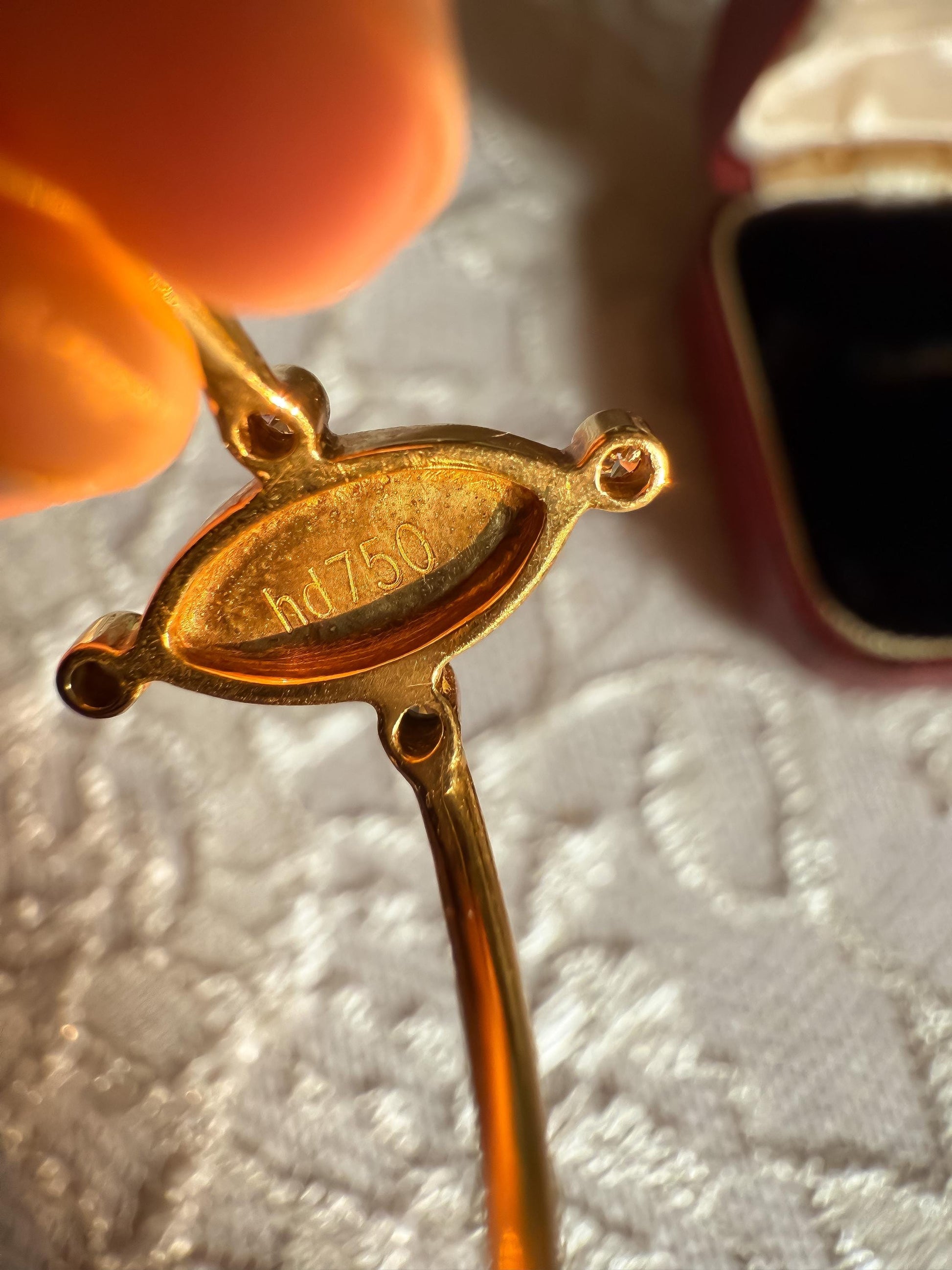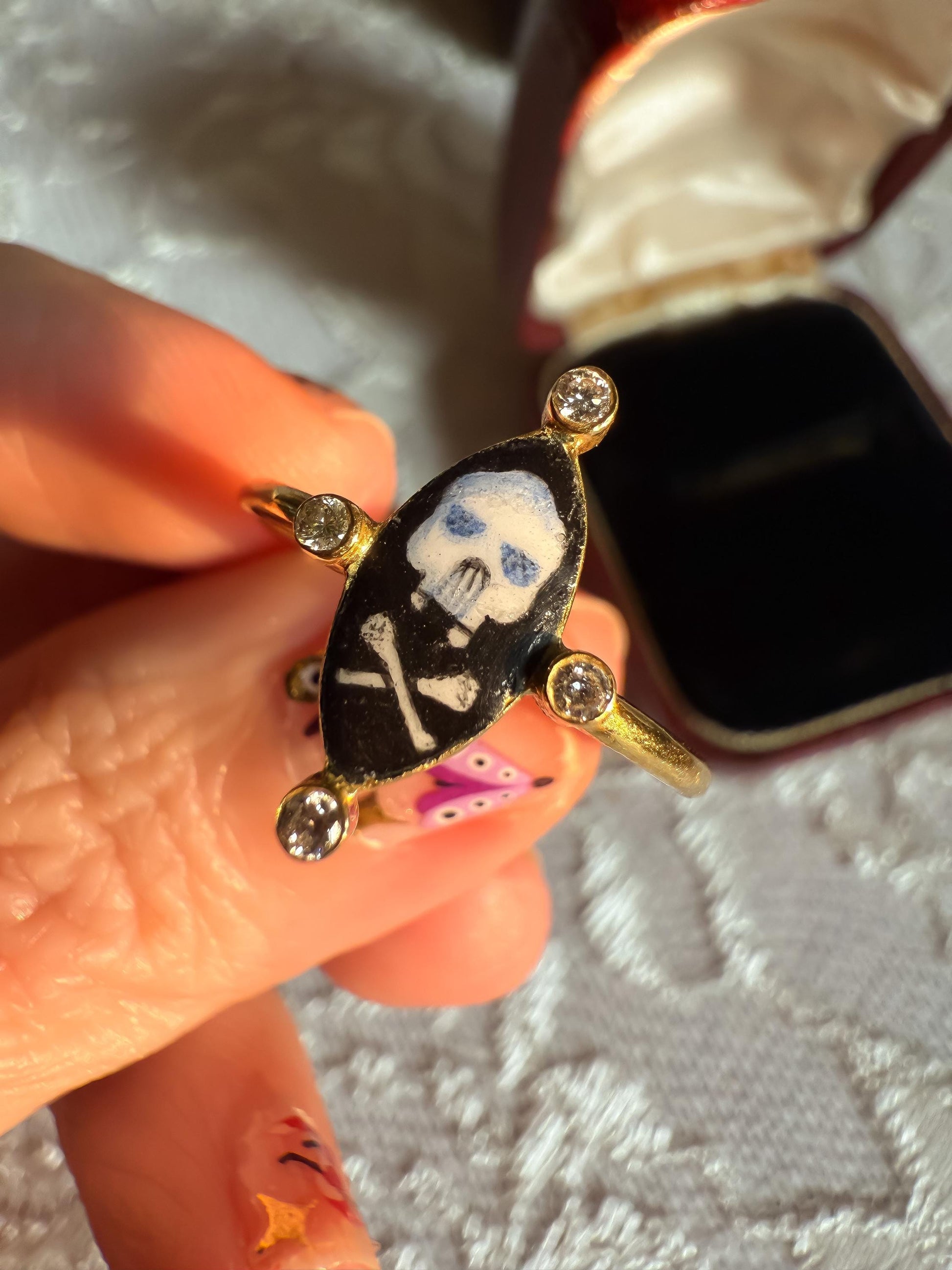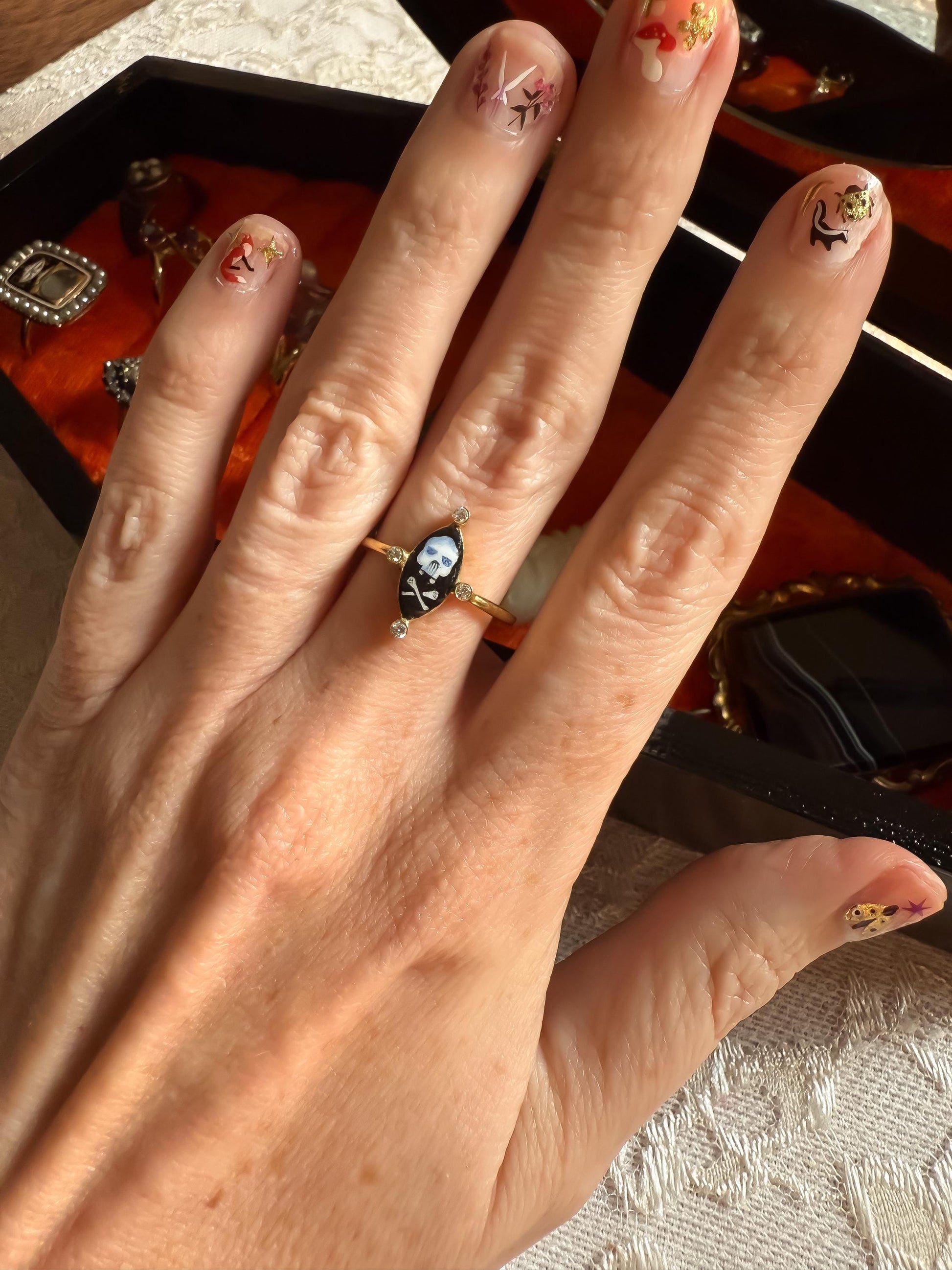 This rare estate ring by celebrated Canadian designer Holly Dyment is a wearable work of art — bold, playful, and exquisitely crafted. Rendered in rich 18K yellow gold, the marquise-shaped centerpiece features an enamel skull and crossbones motif, hand-painted in Dyment’s signature whimsical-meets-macabre style.