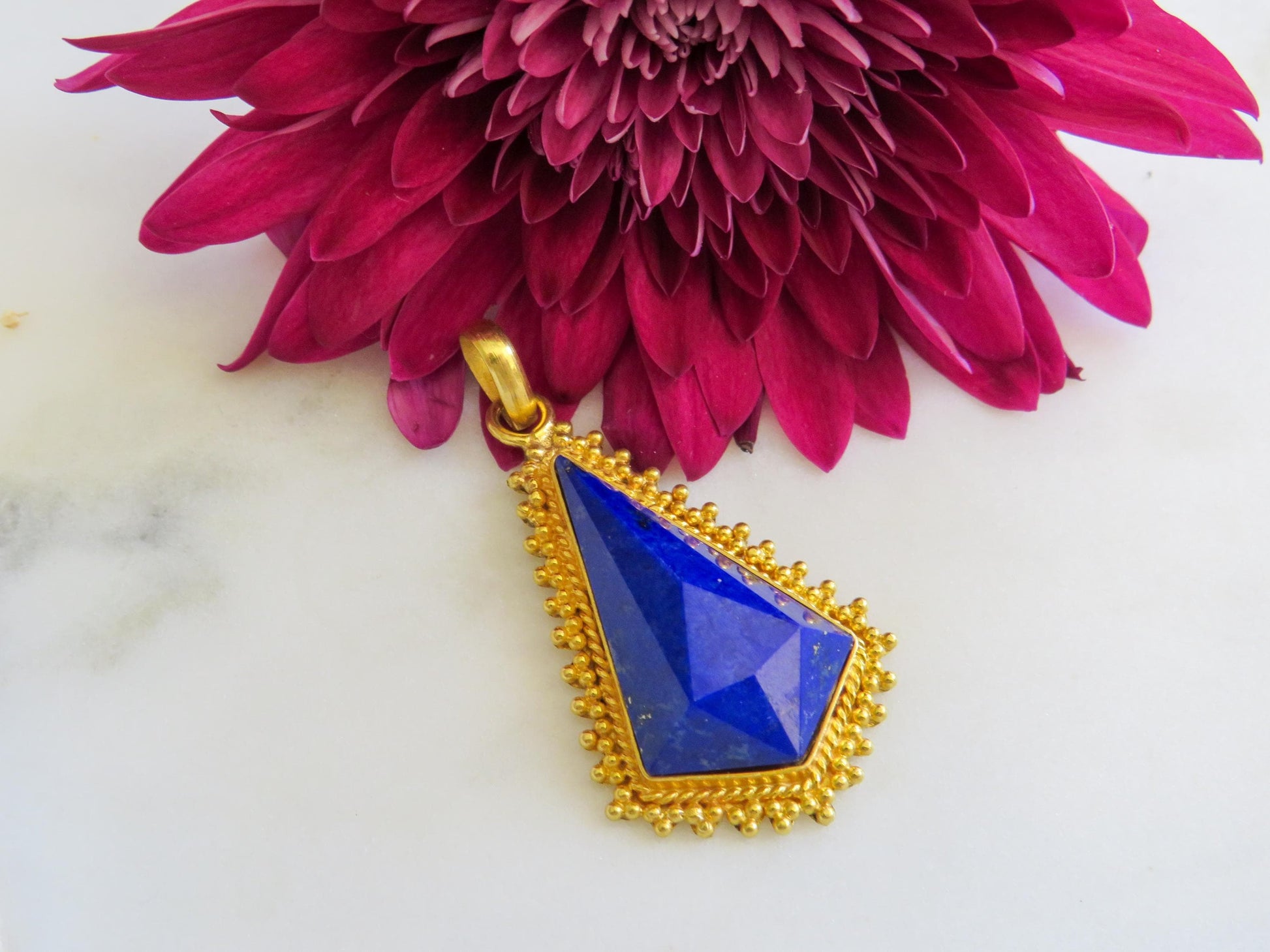 Step into a world of timeless elegance with this regal lapis lazuli and 18K gold pendantan exquisite statement of rich color and intricate craftsmanship. This striking piece features a deep royal blue lapis, faceted to catch the light with every movement, set within a meticulously detailed frame of glowing 18K yellow gold. The ornate granulated border evokes the refined artistry of ancient civilizations, giving the pendant a luxurious, heirloom feel.