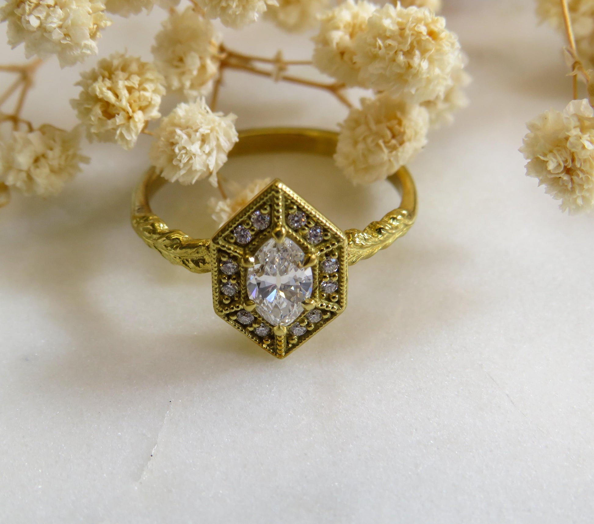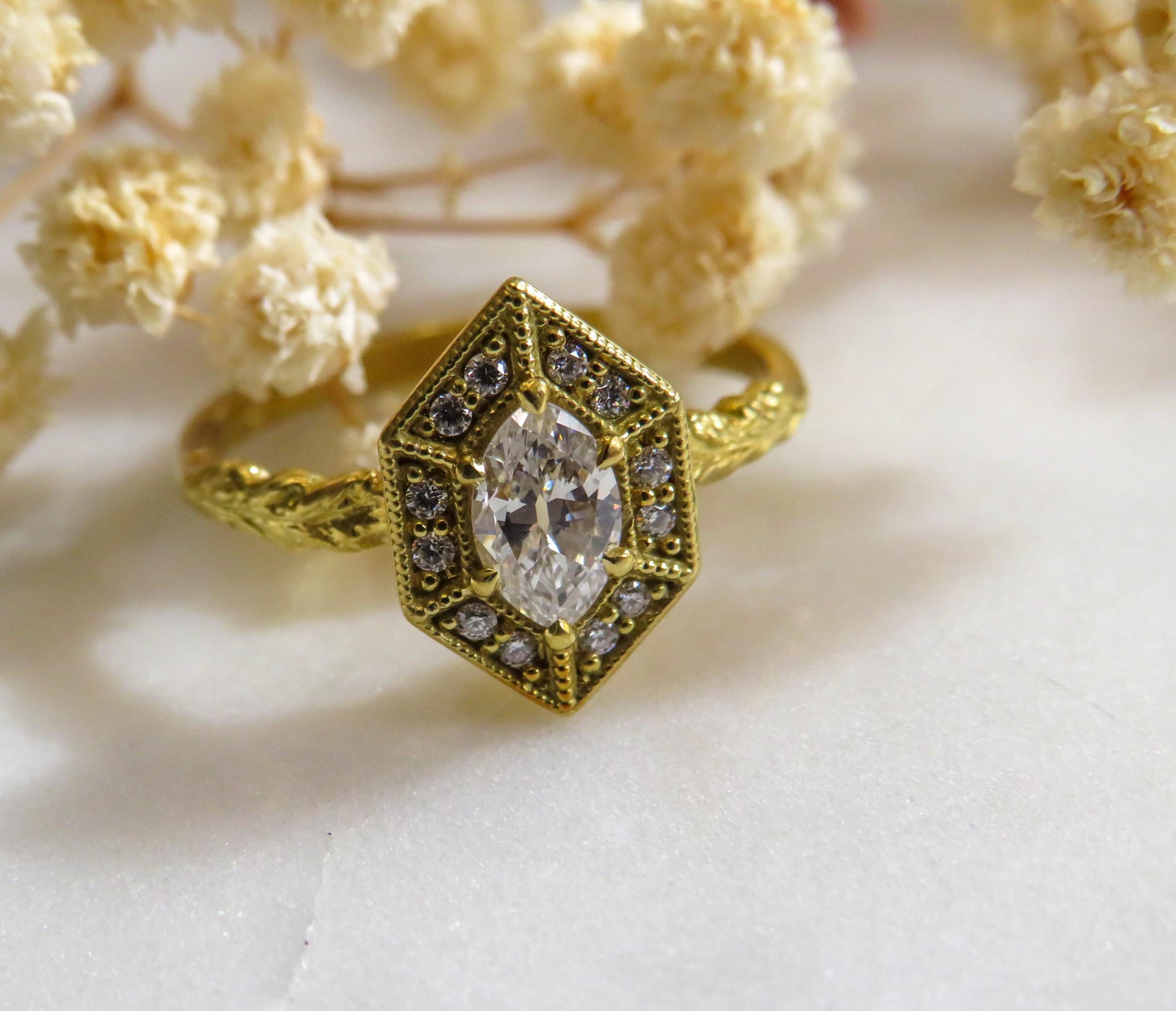 The marquise-meets-oval center stonebeloved for its elongated, graceful shapeis framed in a bold hexagonal halo, adorned with a constellation of sparkling accent diamonds. Milgrain beading and antique-inspired settings lend the ring an Old World charm, while the sculptural, leaf-engraved band adds a whisper of natures beauty.