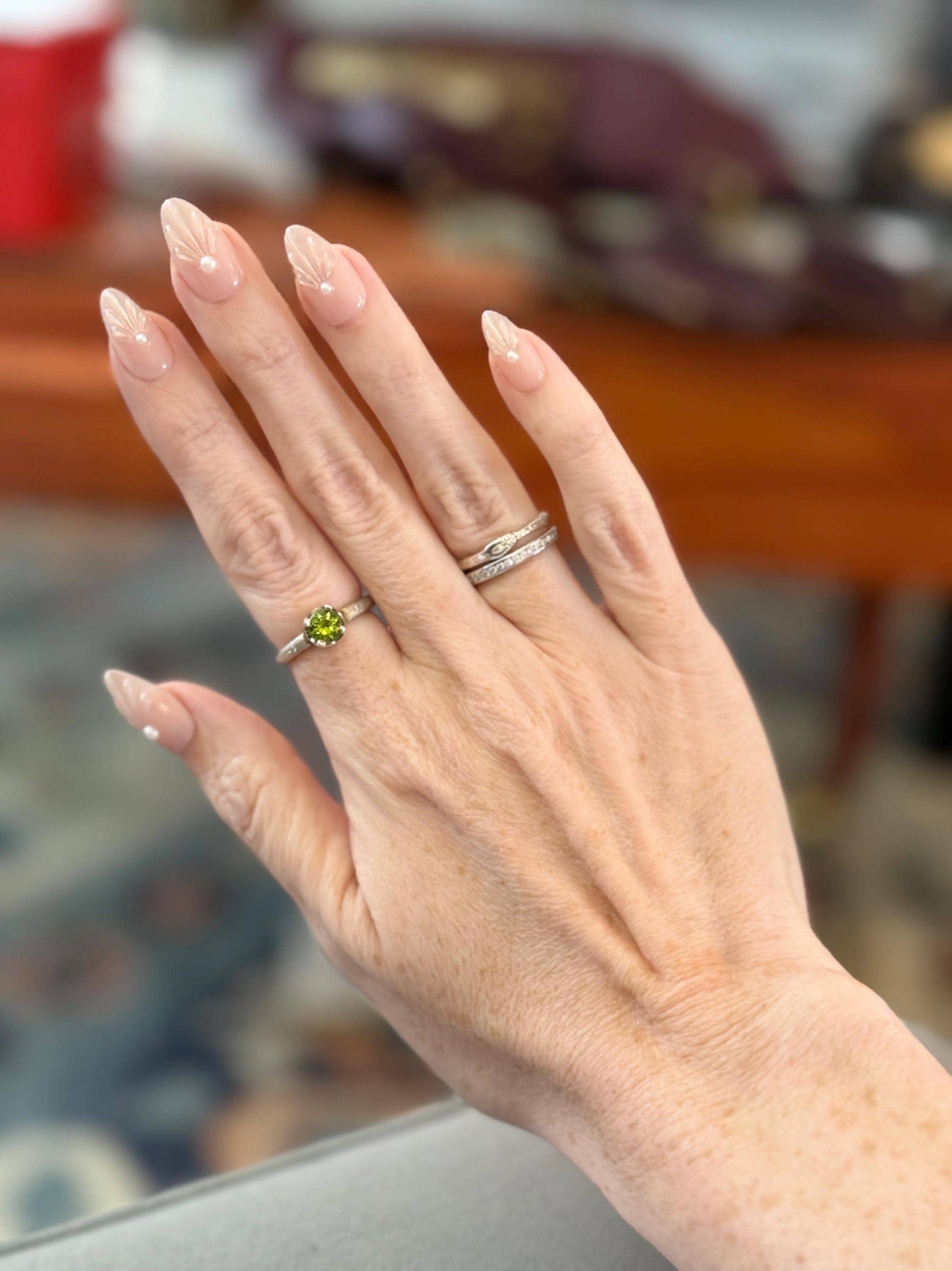Cast in solid sterling silver and weighing 1.6 grams, this delicate yet striking piece is a size 6.5 and features fine details etched directly into the metaleach scale and curve brought to life by artisan hands.