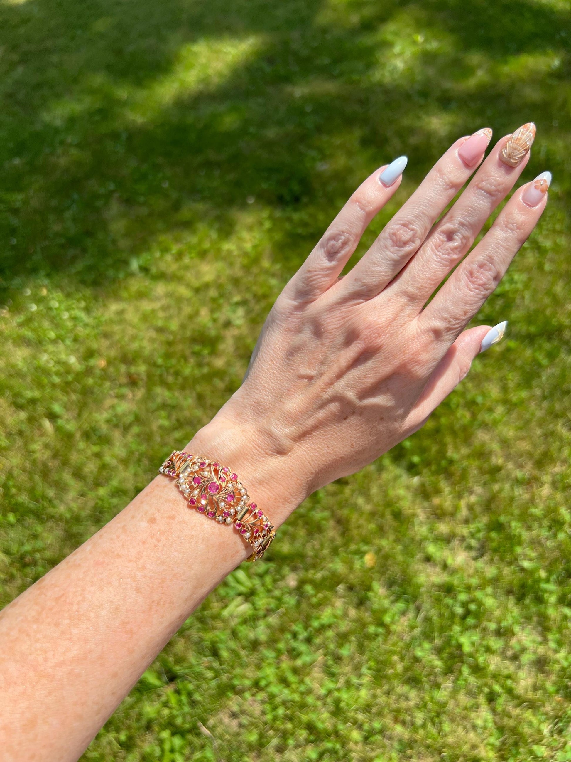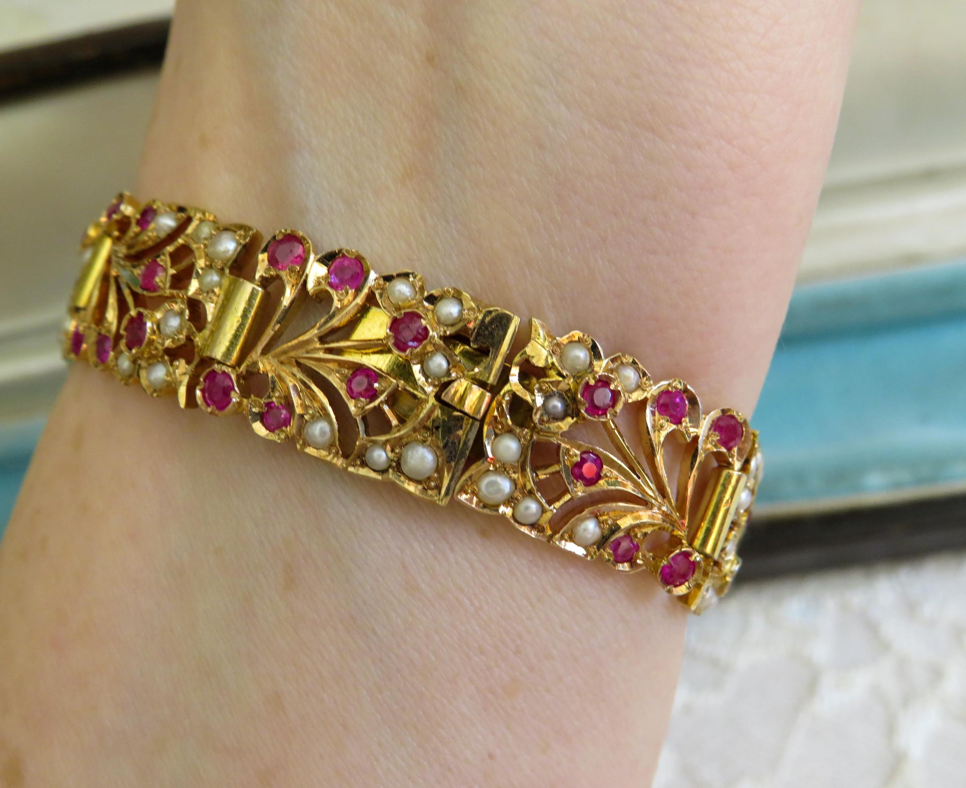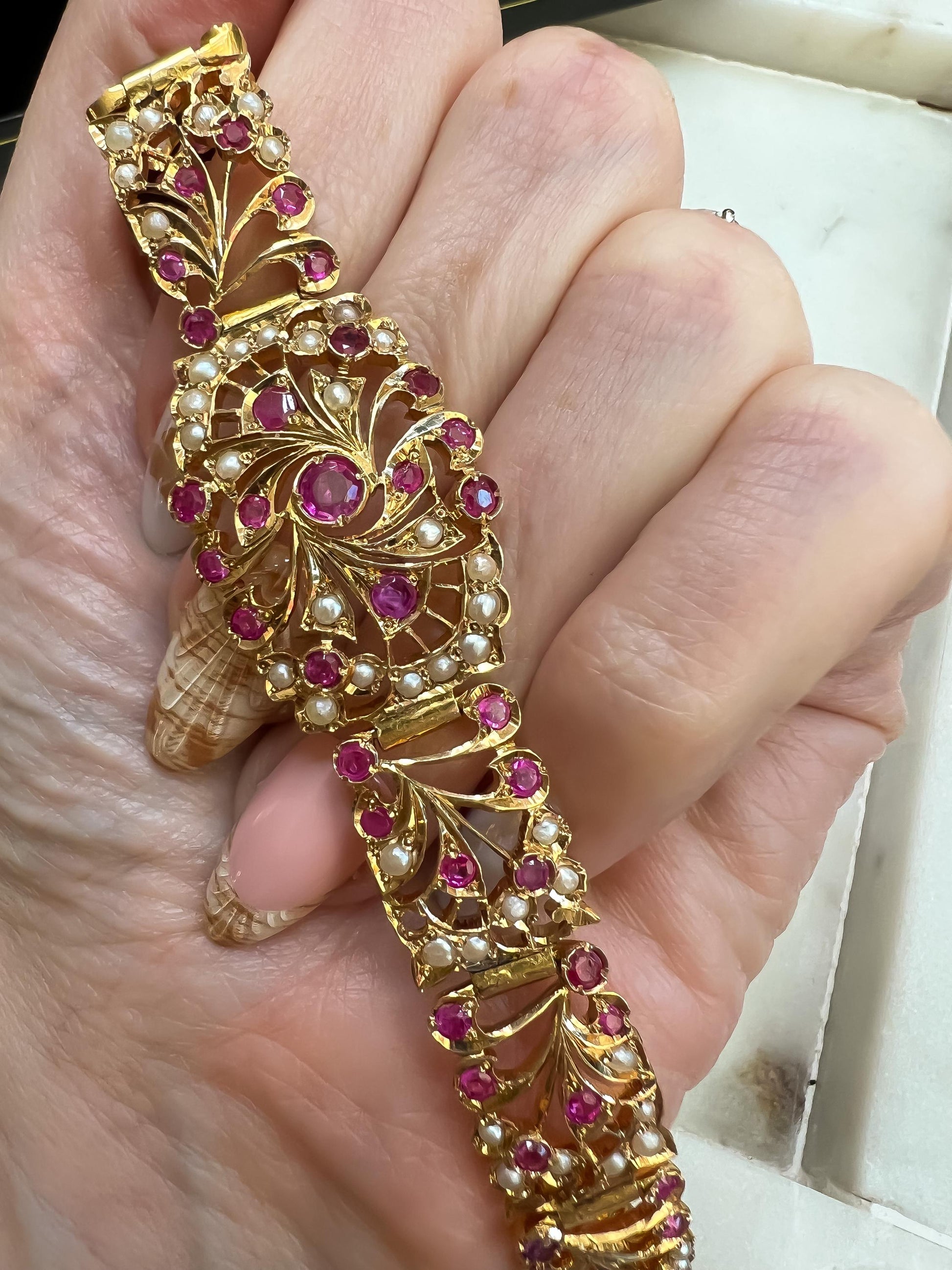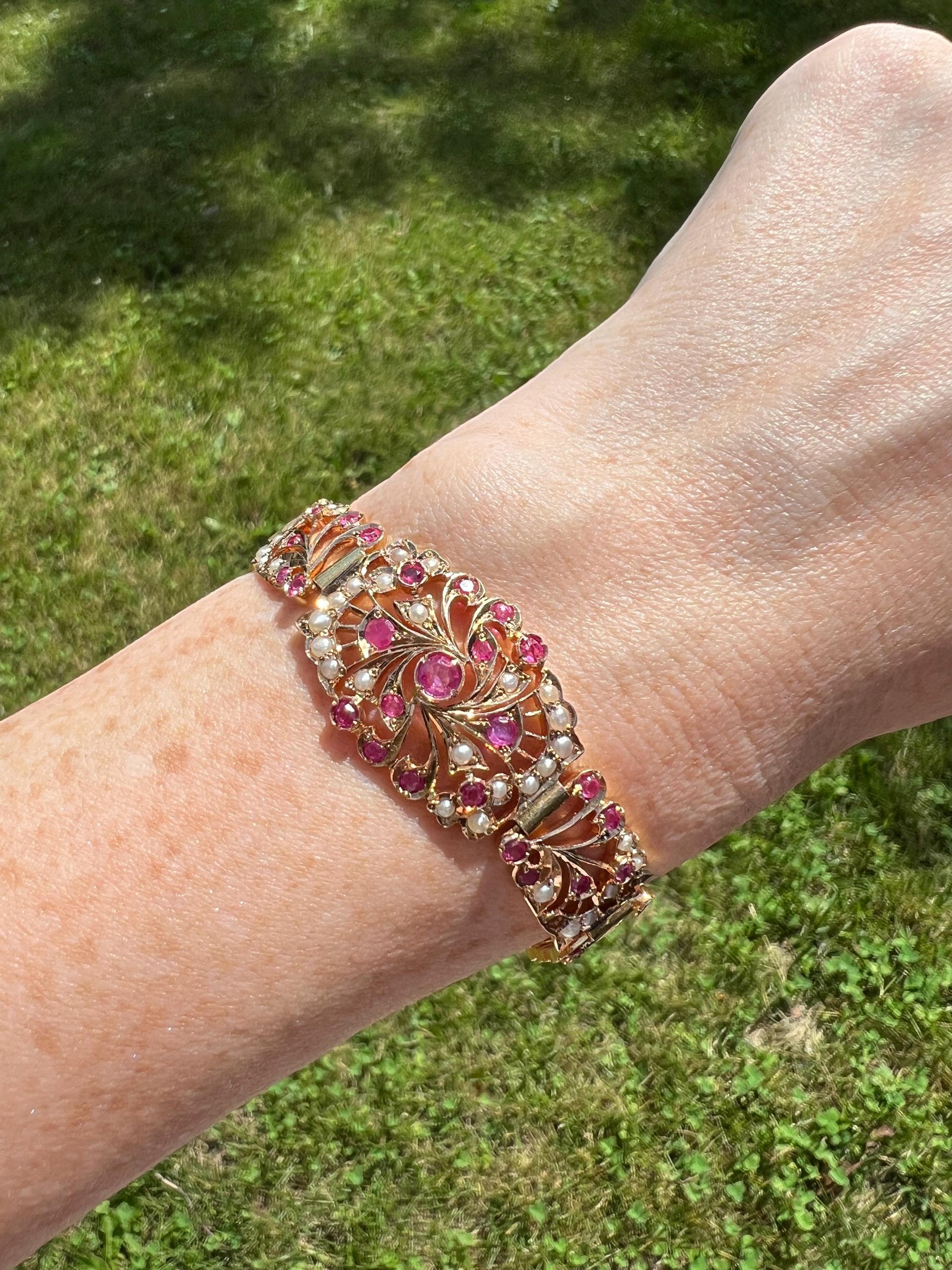 Measuring 7 inches long and weighing an impressive 24.25 grams, this bracelet has a beautiful presence on the wrist without ever feeling too bold. The rubies sparkle with a rich, velvety hue, perfectly complemented by the soft glow of the pearls and the rosy warmth of the gold setting.