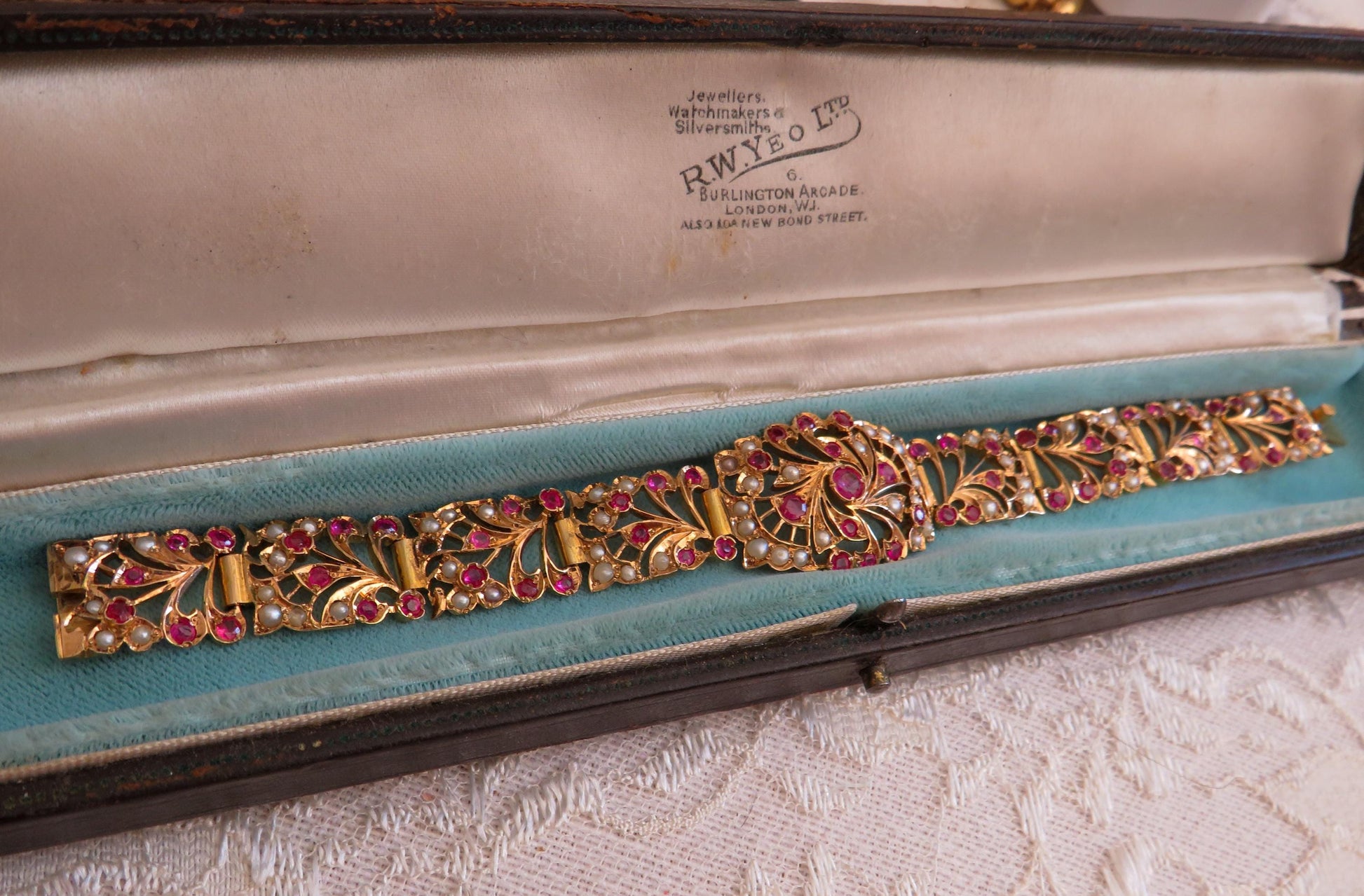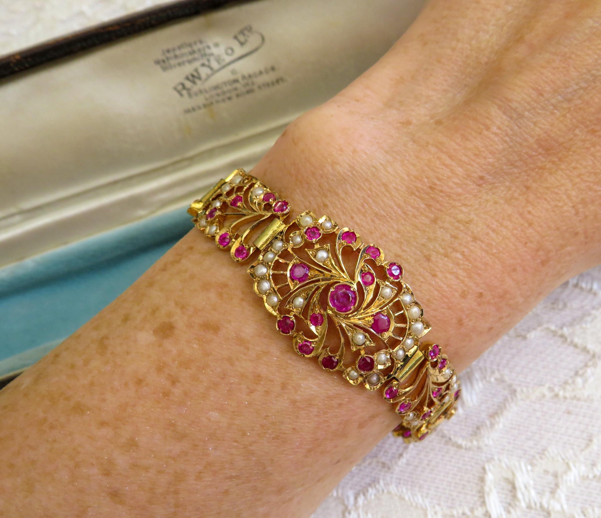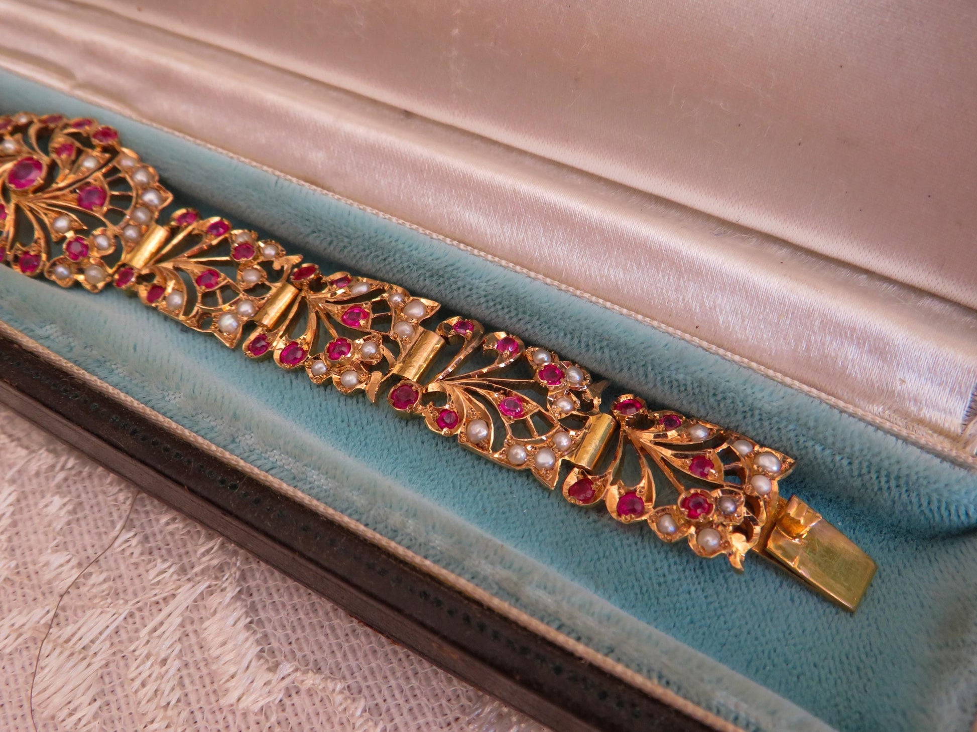 Overflowing with vintage charm and quiet luxury, this antique bracelet is a breathtaking combination of warm 9K rose gold, bright red rubies, and creamy natural pearls. Its design evokes the delicate grace of a bygone eraelegant, feminine, and undeniably timeless.