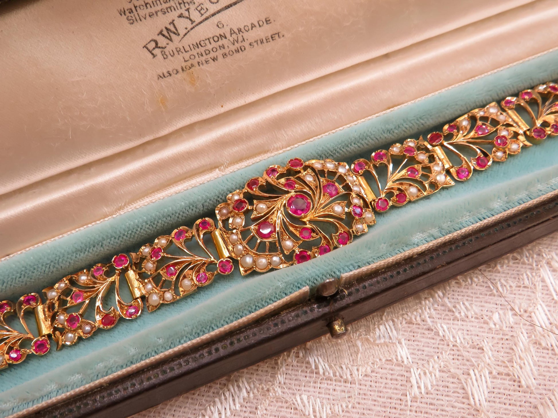 Romantic Antique Ruby & Pearl Bracelet in 9K Rose Gold | 7 | Glowing Heirloom Beauty, 24.25g