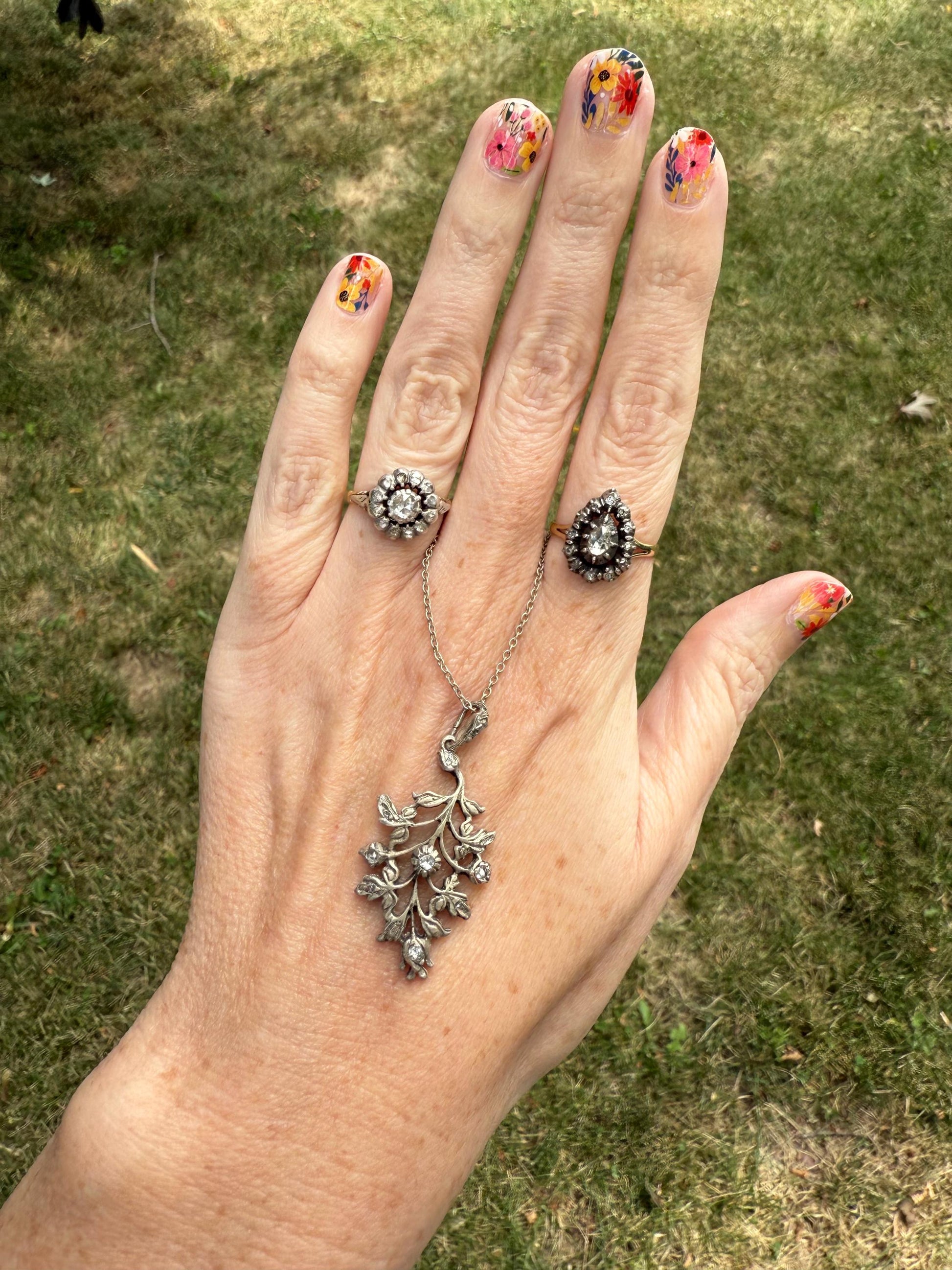 Crafted with a silver-topped 15K gold setting, this piece displays the craftsmanship typical of early 19th-century jewelry. The silver enhances the glow of the diamonds, while the warm gold band provides a subtle contrast. Every detail, from the floral design to the hand-applied settings, speaks to a bygone era of artisanal skill and refinement.