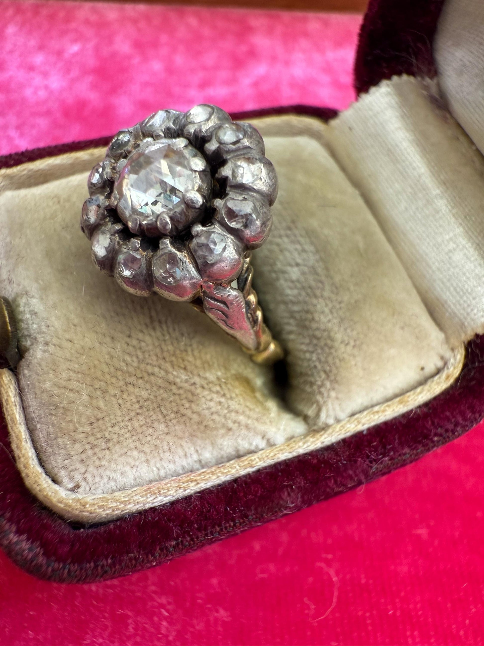 This exquisite antique daisy ring is a rare Georgian-era treasure, set with glimmering rose cut diamonds in a classic flower cluster motif. The diamonds, all foil-backed and delicately hand-cut, offer a soft, romantic shimmer that only antique stones can provide. With a total face-up presence of approximately 0.50 carats, this ring captures the timeless charm of the past.