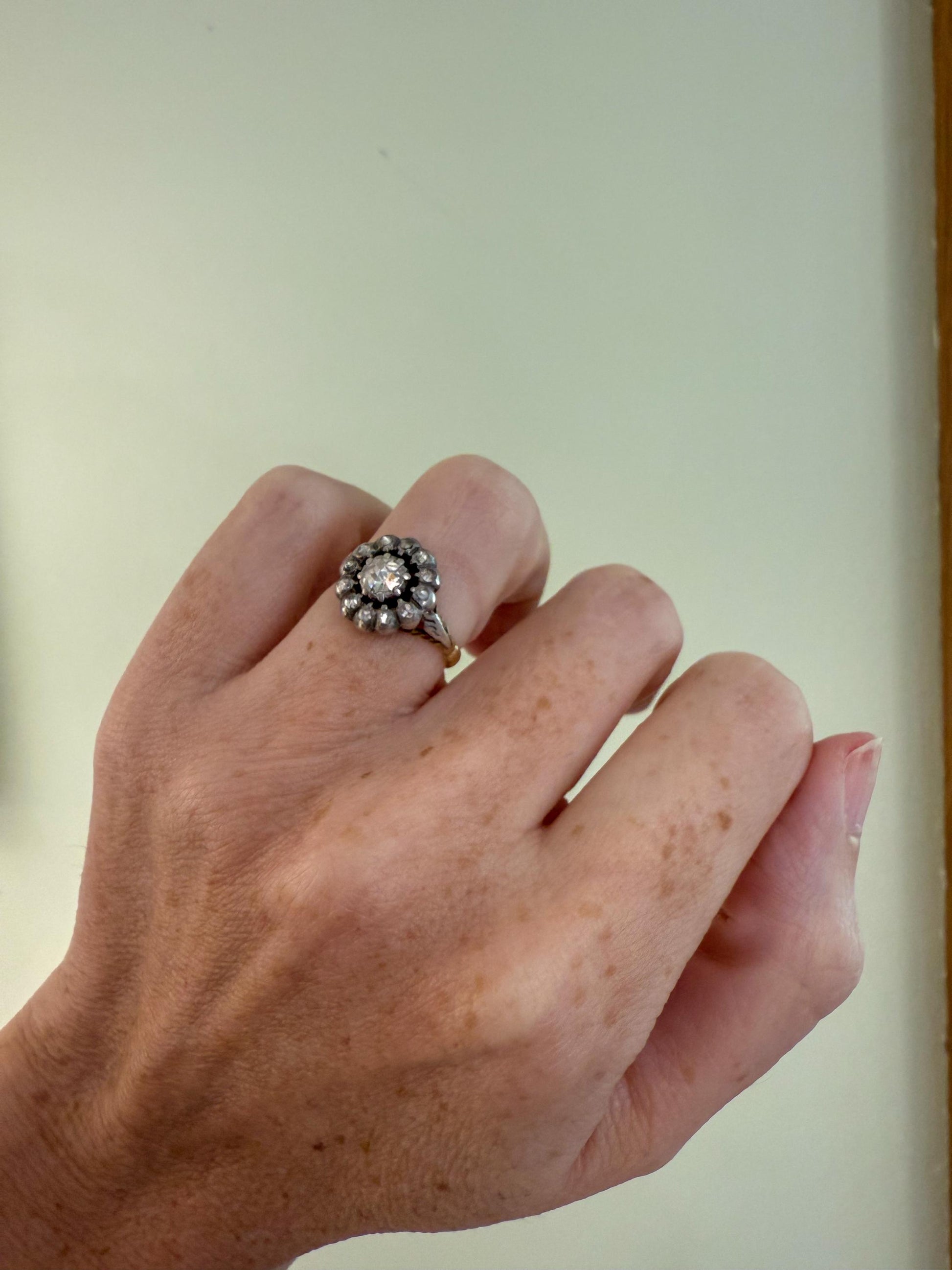 Rose Cut Diamond Daisy Ring | Silver-Topped 15K Gold | Georgian Era Foil-Backed Diamonds | Size 5