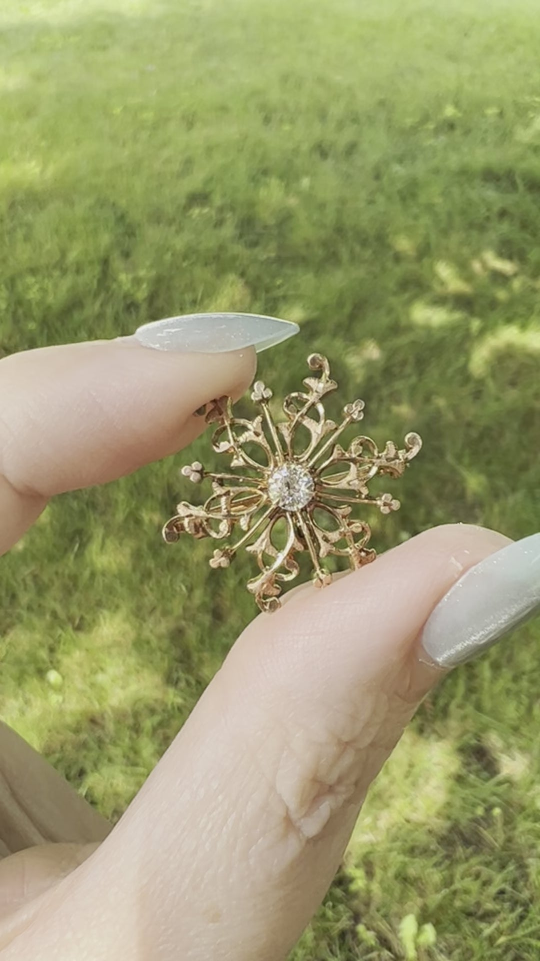 This antique, rose gold snowflake has gorgeous detailing, and a sparkly .25 carat old mine cut diamond at its center. Please take a look at the video to see how even the gold sparkles, not just the diamond!