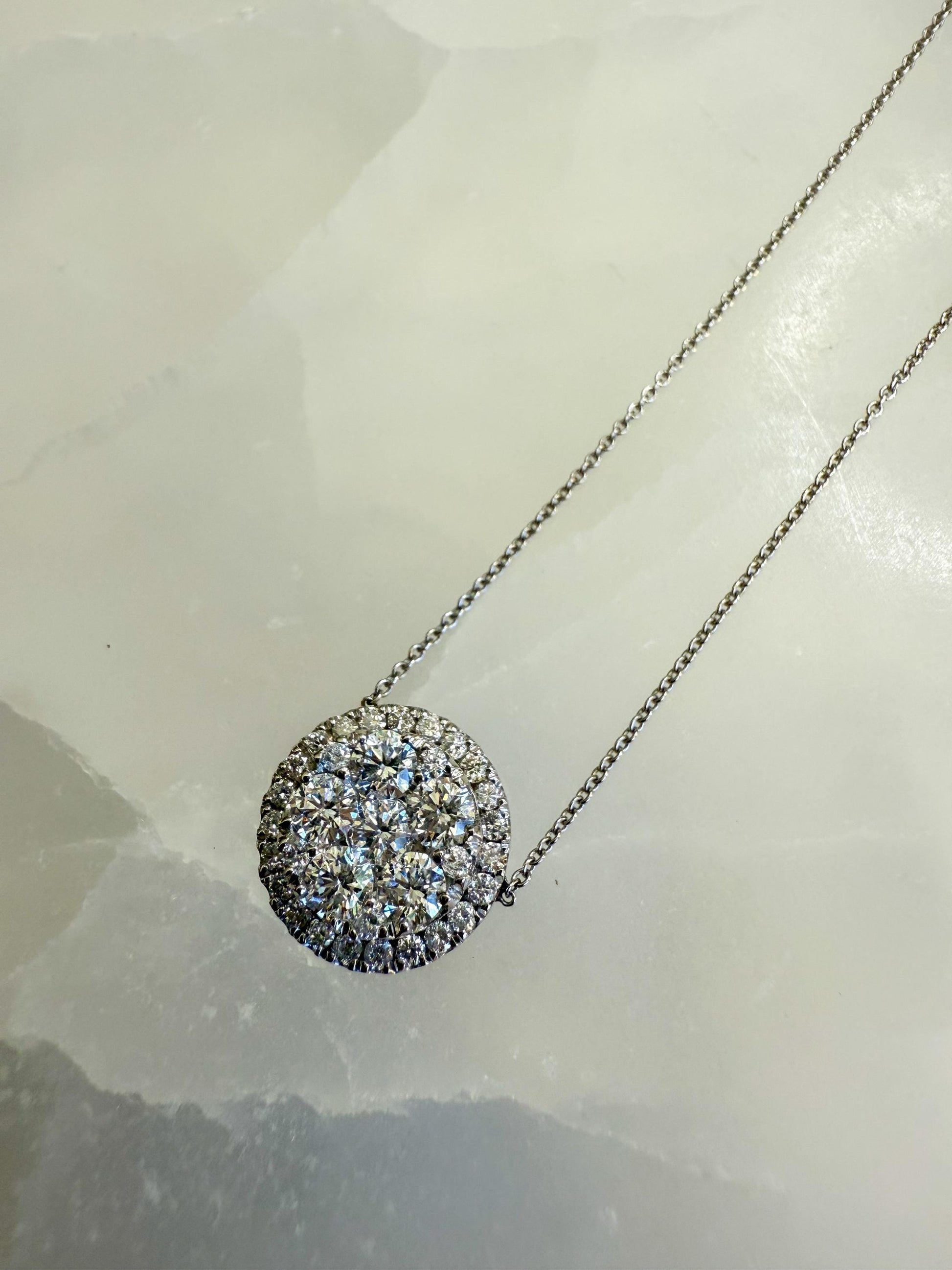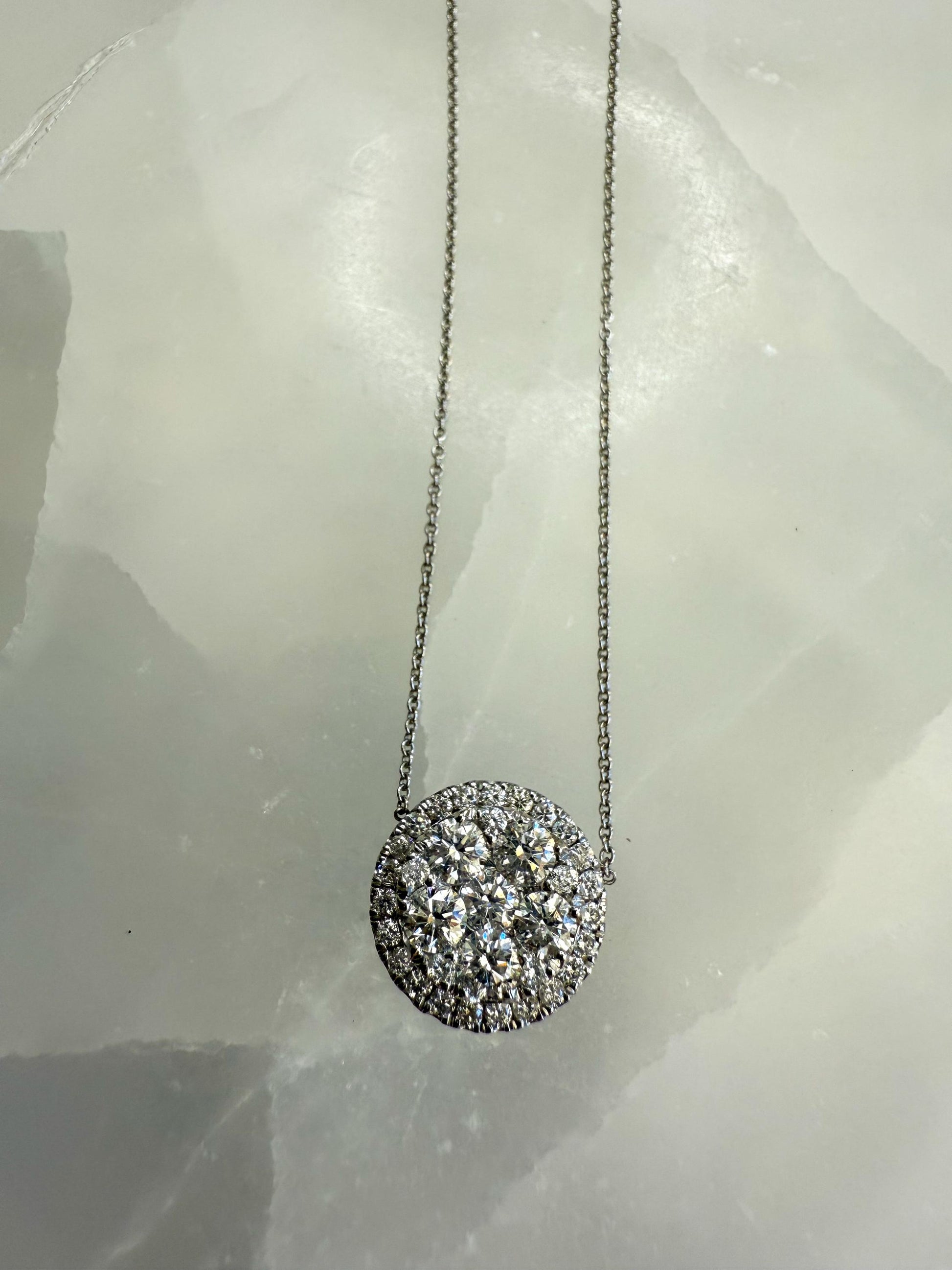 Bright, bold, and endlessly sparkly ✨ This diamond medallion pendant necklace is crafted in 14K white gold and set with approximately .90 carats of natural diamonds. With an estimated G color and VS clarity, the diamonds are beautifully bright, clean, and full of fire.