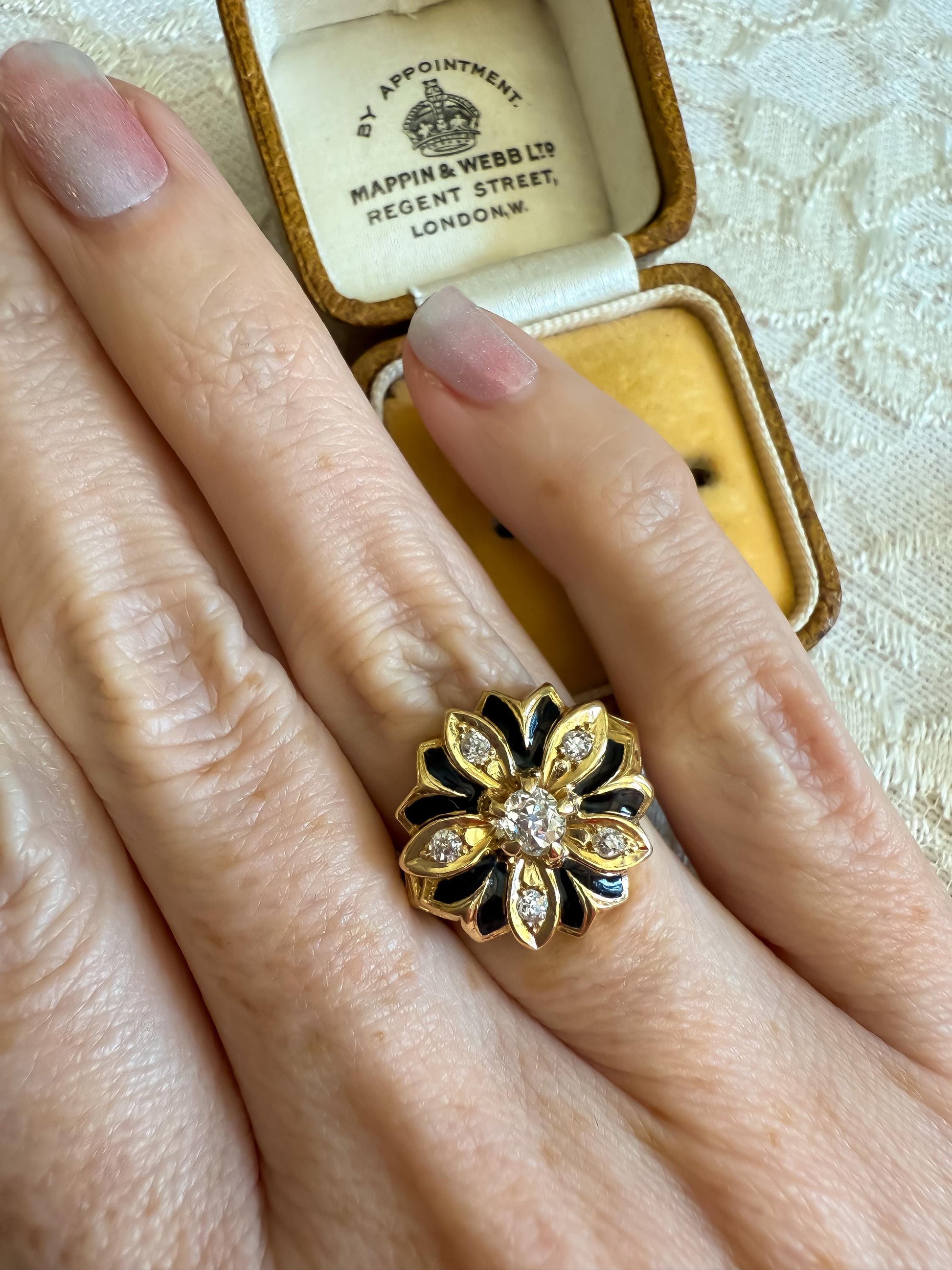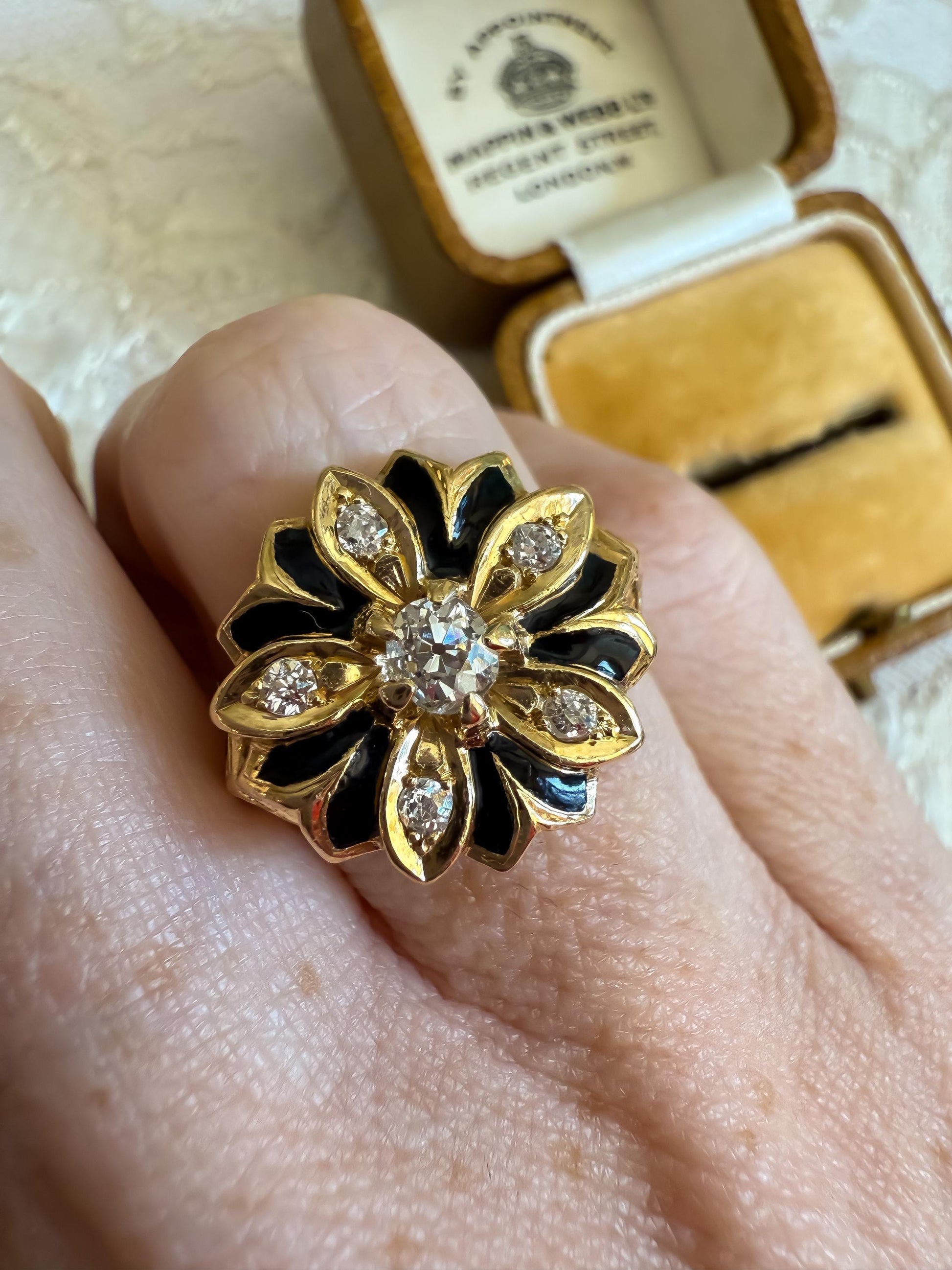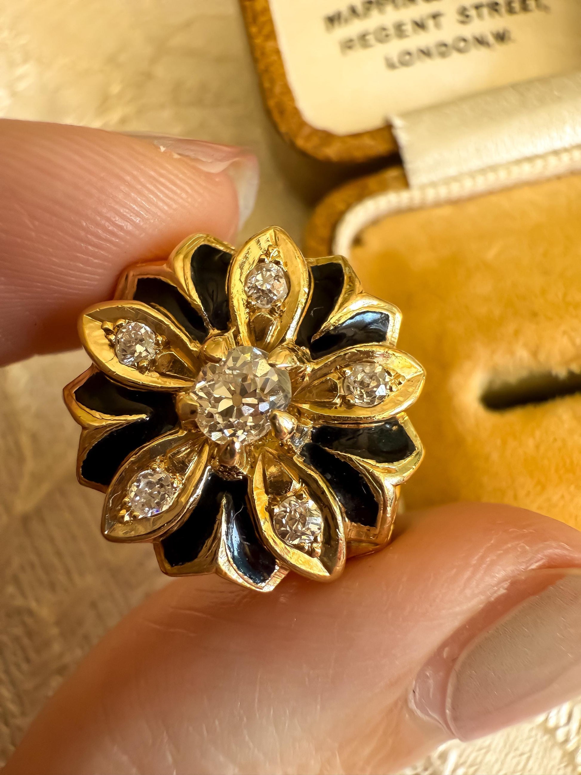 Antique 14K Gold & Black Enamel Ring | Old Mine Cut Diamond Flower | Eye Clean Center | Size 5.75 | Victorian Era Statement Ring