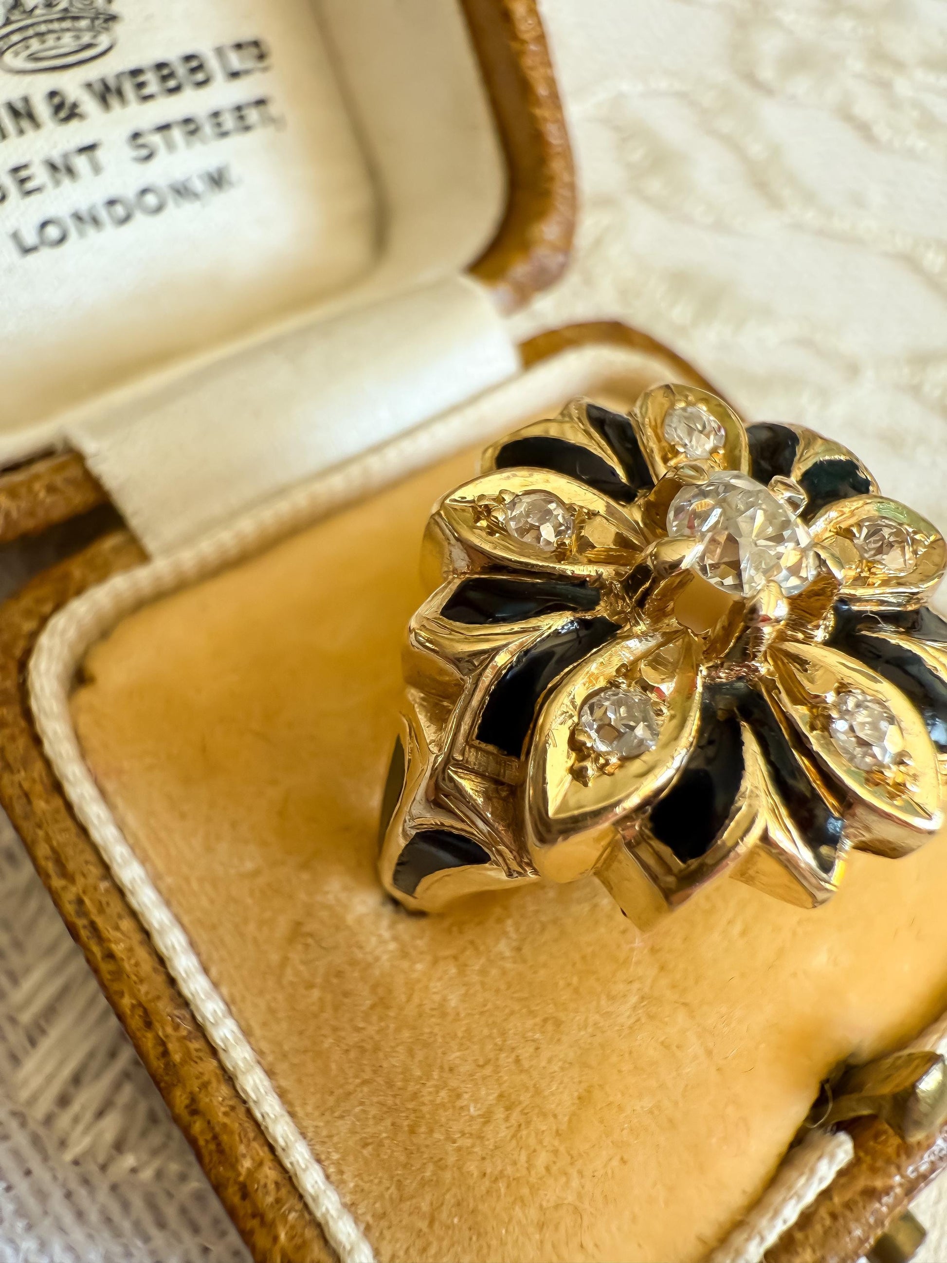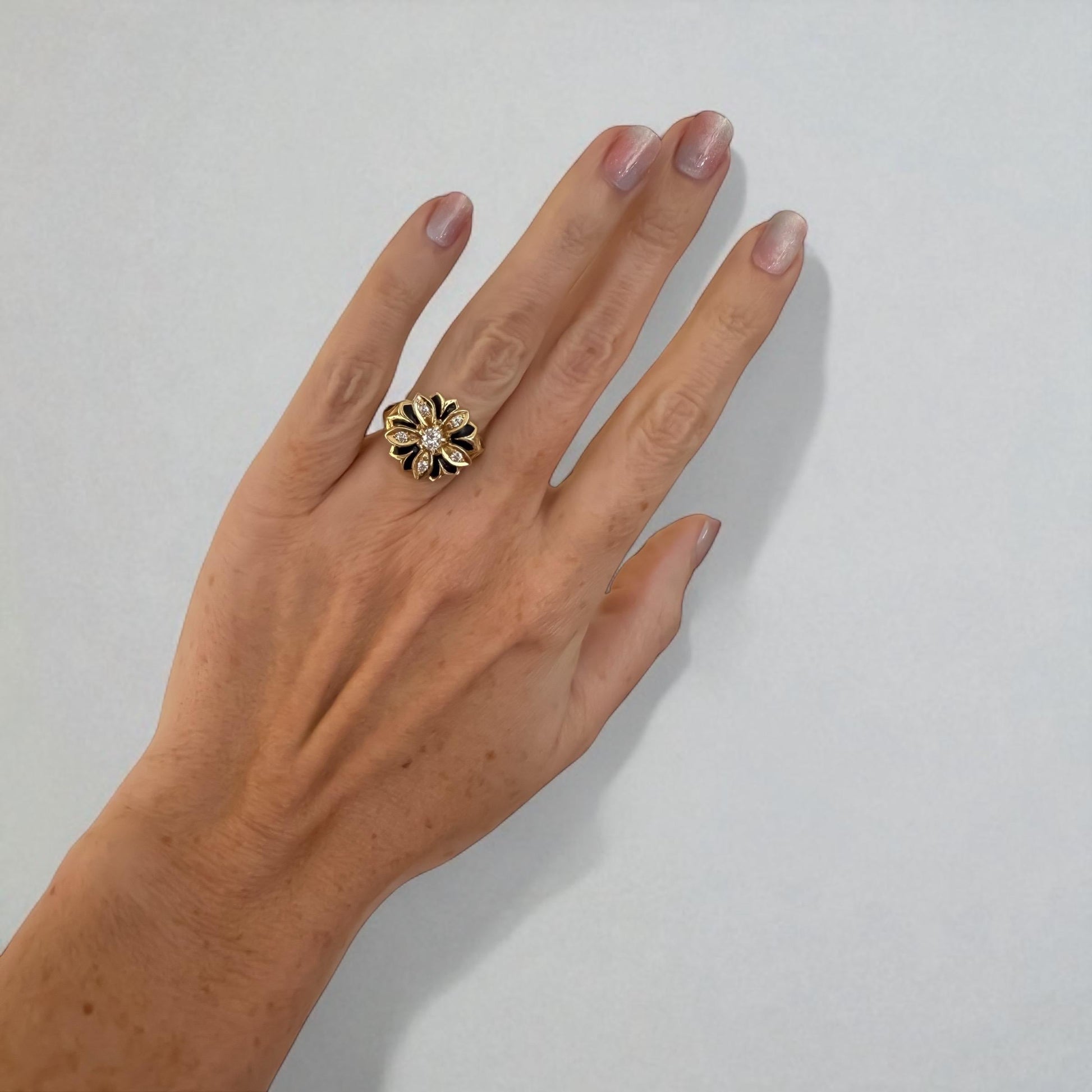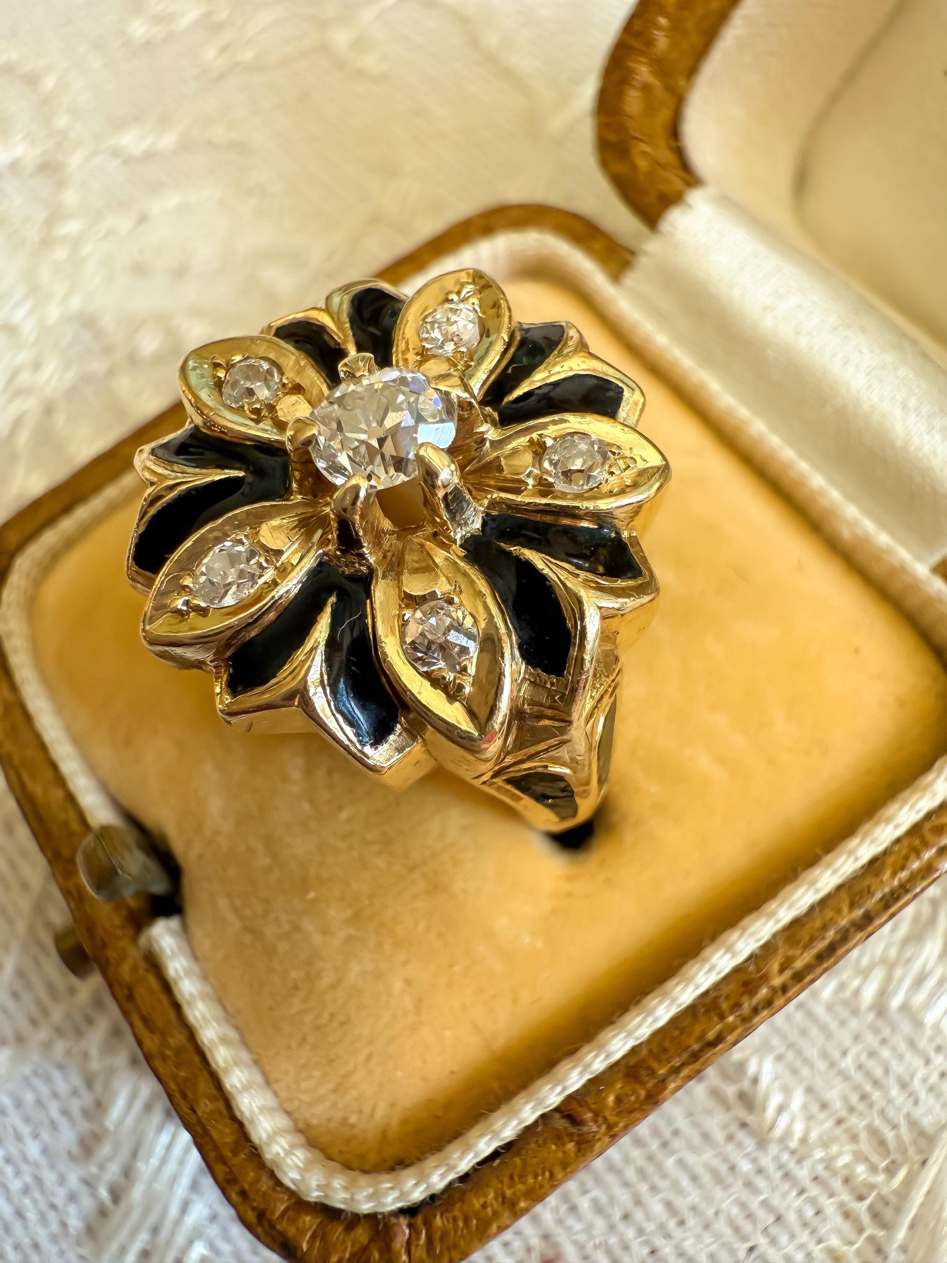 A striking bloom from a bygone era this antique 14K yellow gold ring is a wearable piece of Victorian artistry. Designed in a bold floral motif, the ring features six glittering old mine cut diamonds totaling approximately 0.40 carats, each nestled in golden petal-shaped settings accented with rich black enamel.
