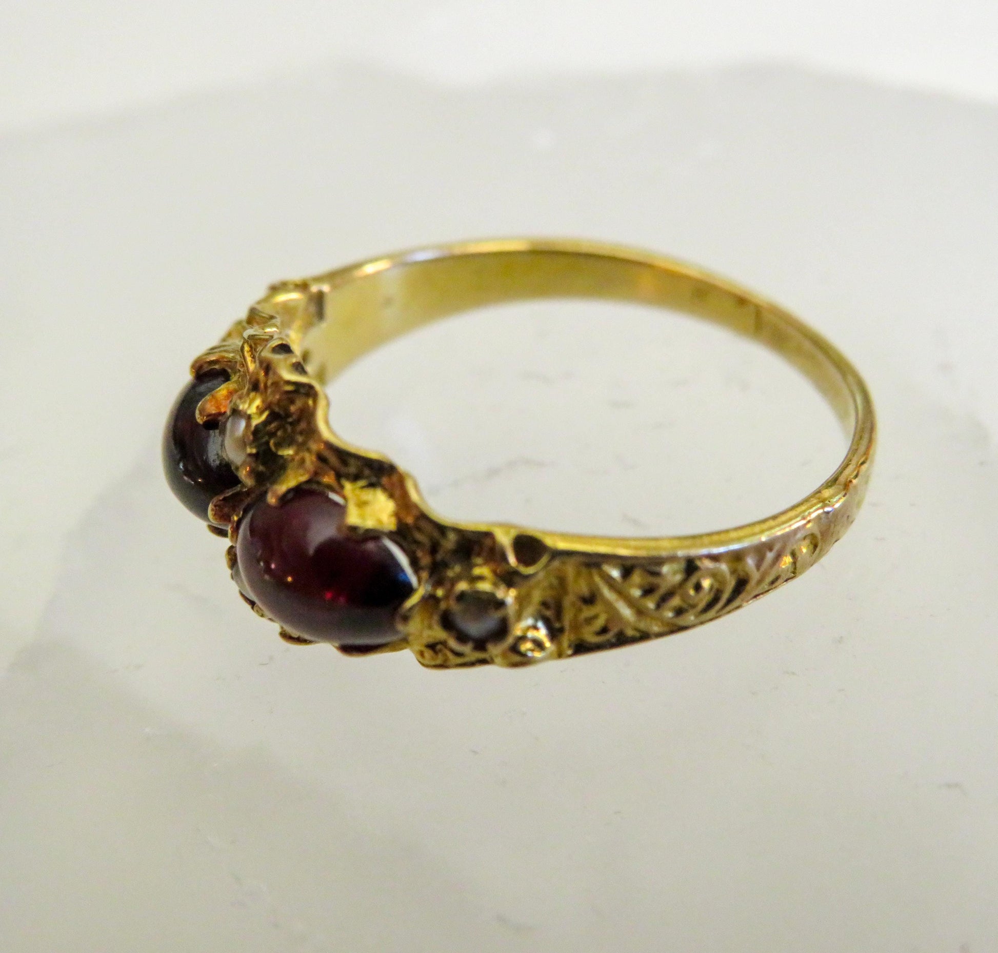 Victorian 9K Gold Garnet & Seed Pearl Ring – Size 5.75