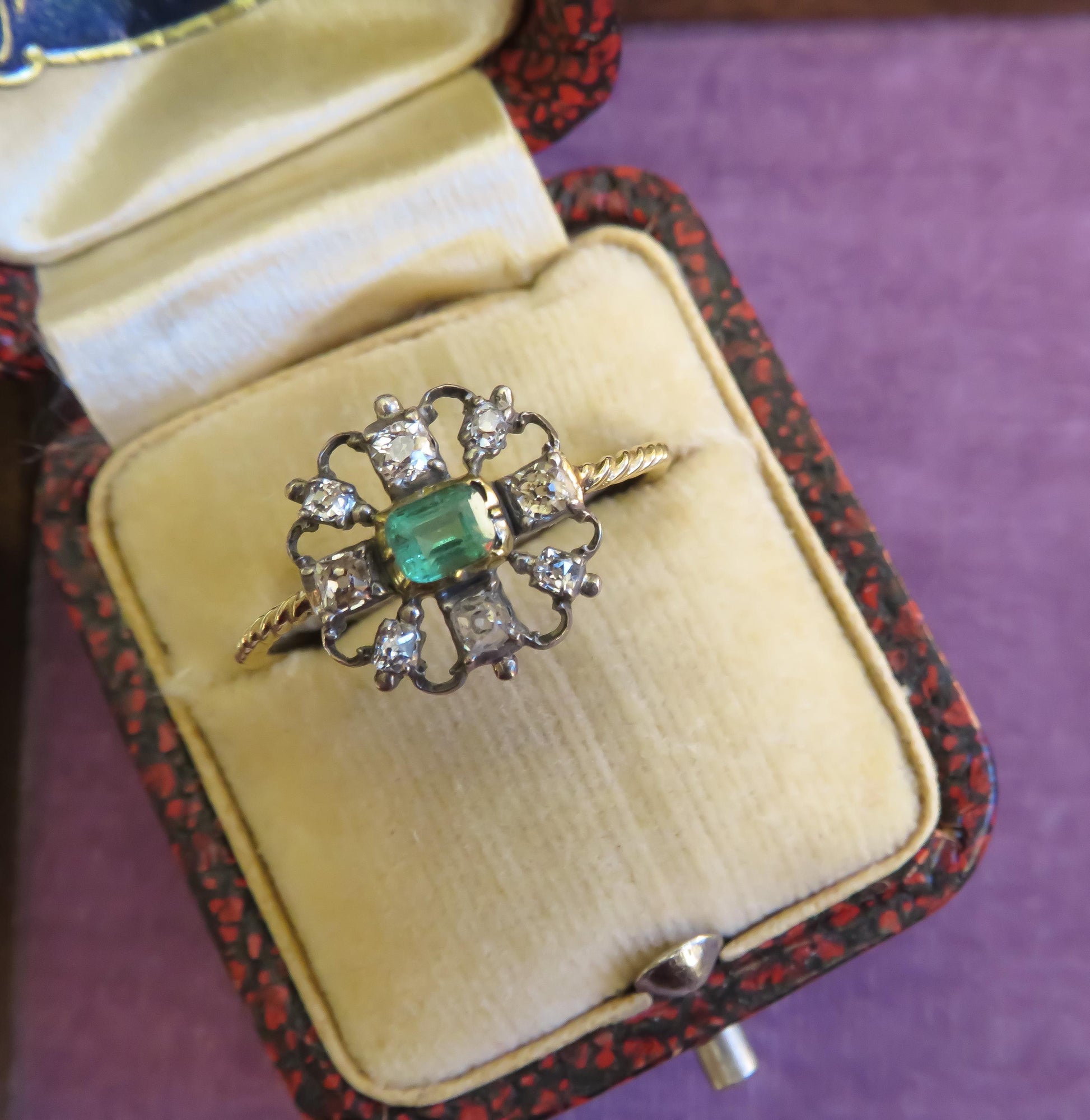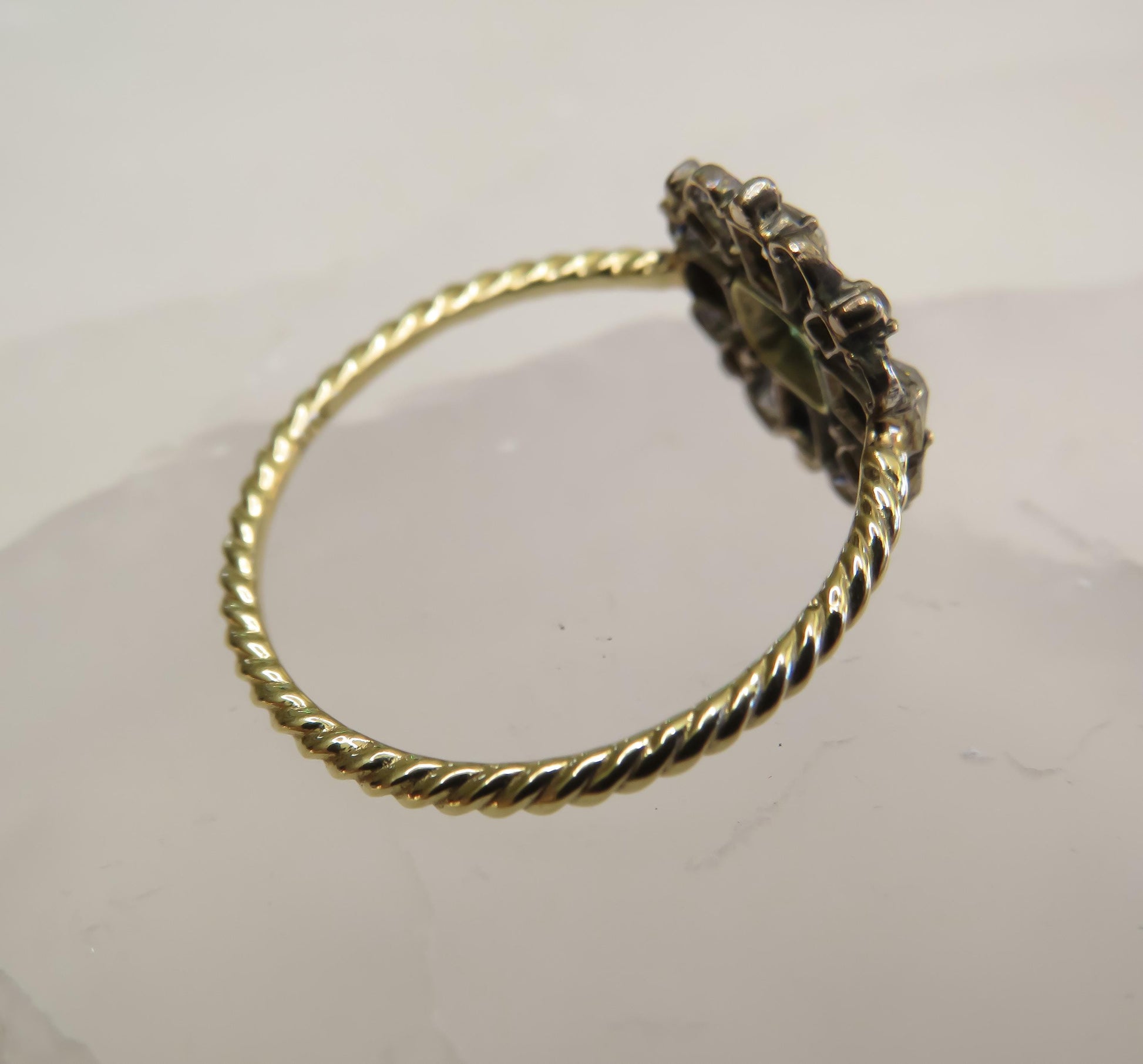 Antique Emerald & Old Mine Cut Diamond Stickpin Conversion Ring – Silver Top & 14K Gold Twist Shank – Size 9