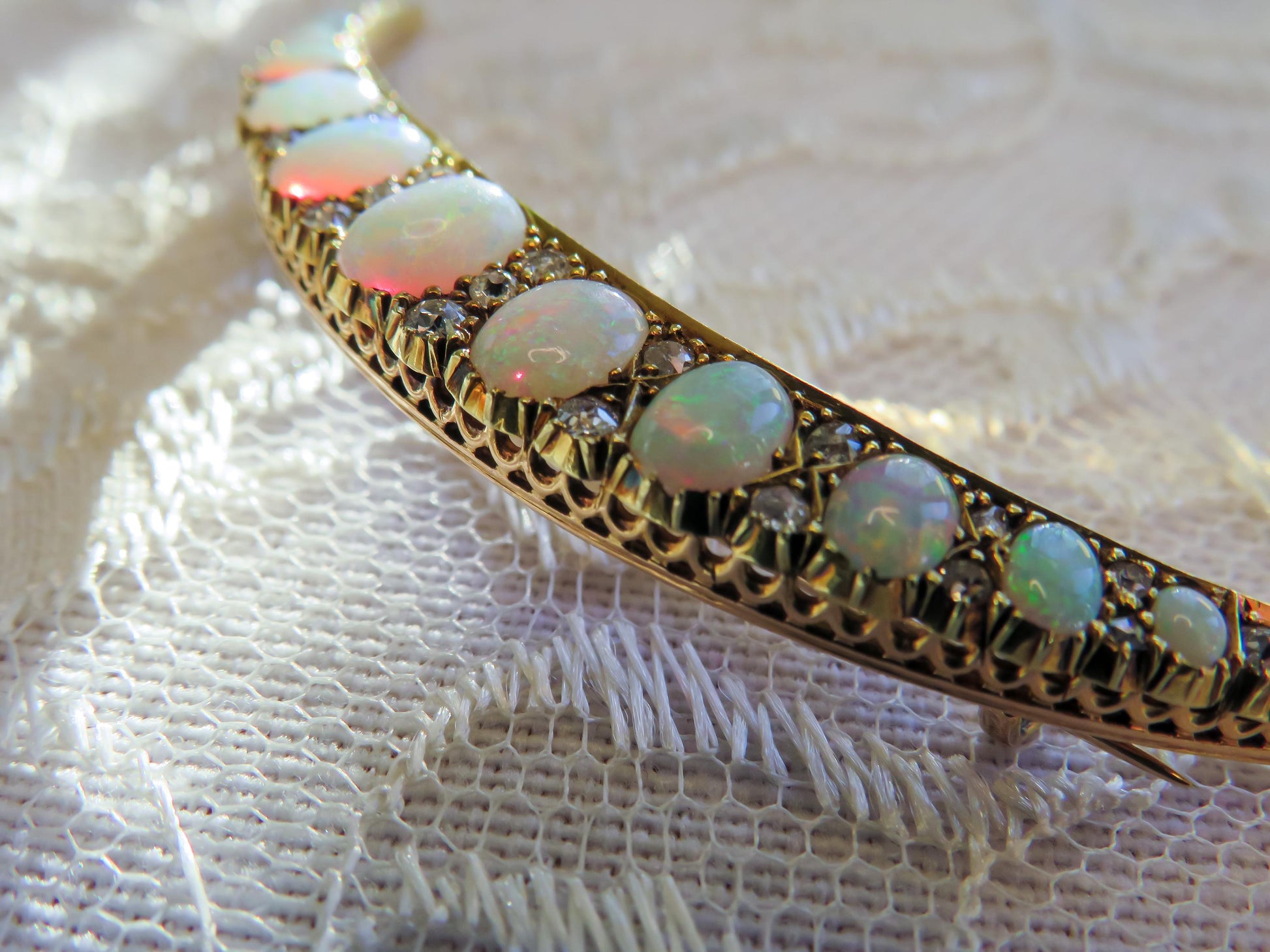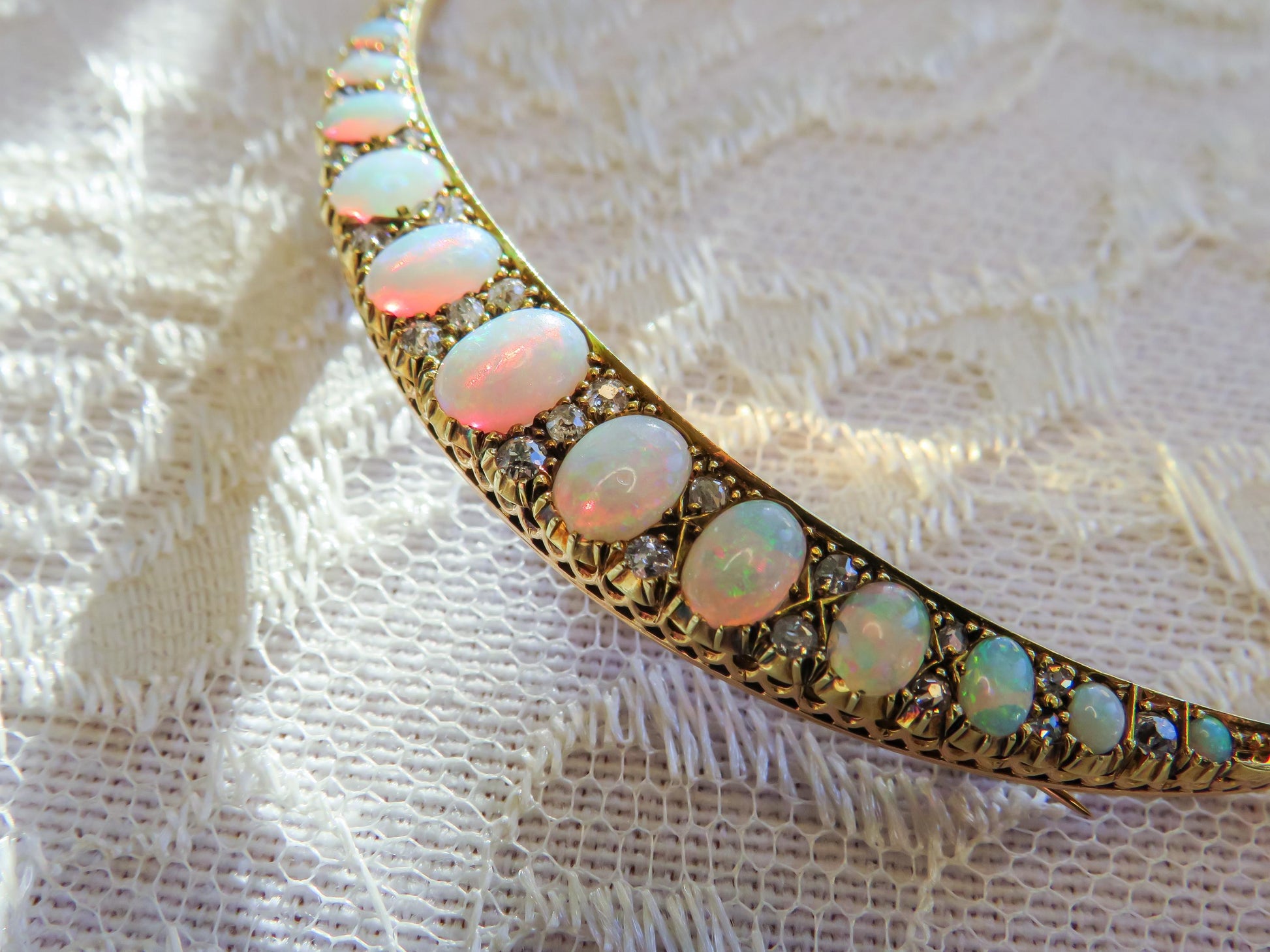 A row of luminous opals forms the heart of this celestial design. Each opal glows with an enchanting play of colors, shifting from soft blues and greens to fiery flashes of orange and pink as they catch the light. The stones, delicately graduated in size, are perfectly framed by a glittering array of old-cut diamonds, which add a touch of brilliance to the broochs timeless elegance.
